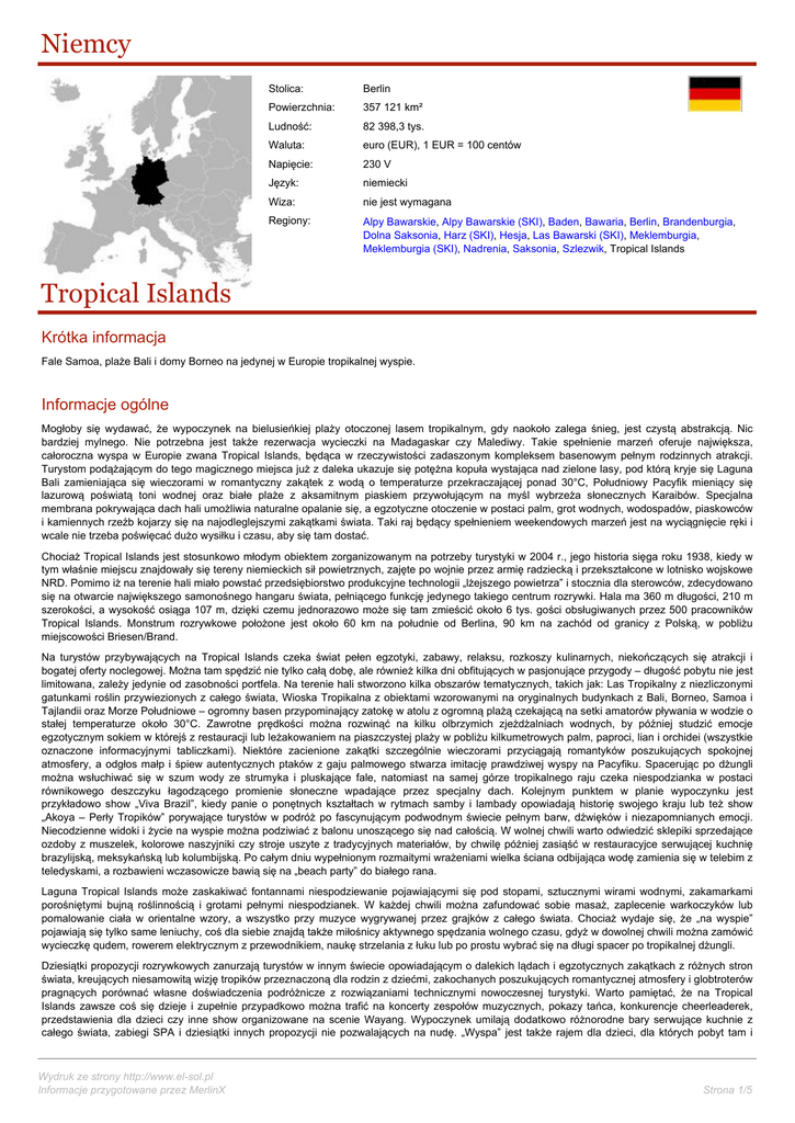 Niemcy Stolica: Berlin Powierzchnia: 357 121 km² Ludność: 82 398,3 tys. Waluta: euro (EUR), 1 EUR = 100 centów Napięcie: 230 V Język: niemiecki Wiza: nie jest wymagana Regiony: Alpy Bawarskie, Alpy Bawarskie (SKI), Baden, Bawaria, Berlin, Brandenburgia, Dolna Saksonia, Harz (SKI), Hesja, Las Bawarski (SKI), Meklemburgia, Meklemburgia (SKI), Nadrenia, Saksonia, Szlezwik, Tropical Islands Tropical Islands Krótka informacja Fale Samoa, plaże Bali i domy Borneo na jedynej w Europie tropikalnej wyspie. Informacje ogólne Mogłoby się wydawać, że wypoczynek na bielusieńkiej plaży otoczonej lasem tropikalnym, gdy naokoło zalega śnieg, jest czystą abstrakcją. Nic bardziej mylnego. Nie potrzebna jest także rezerwacja wycieczki na Madagaskar czy Malediwy. Takie spełnienie marzeń oferuje największa, całoroczna wyspa w Europie zwana Tropical Islands, będąca w rzeczywistości zadaszonym kompleksem basenowym pełnym rodzinnych atrakcji. Turystom podążającym do tego magicznego miejsca już z daleka ukazuje się potężna kopuła wystająca nad zielone lasy, pod którą kryje się Laguna Bali zamieniająca się wieczorami w romantyczny zakątek z wodą o temperaturze przekraczającej ponad 30°C, Południowy Pacyfik mieniący się lazurową poświatą toni wodnej oraz białe plaże z aksamitnym piaskiem przywołującym na myśl wybrzeża słonecznych Karaibów. Specjalna membrana pokrywająca dach hali umożliwia naturalne opalanie się, a egzotyczne otoczenie w postaci palm, grot wodnych, wodospadów, piaskowców i kamiennych rzeźb kojarzy się na najodleglejszymi zakątkami świata. Taki raj będący spełnieniem weekendowych marzeń jest na wyciągnięcie ręki i wcale nie trzeba poświęcać dużo wysiłku i czasu, aby się tam dostać. Chociaż Tropical Islands jest stosunkowo młodym obiektem zorganizowanym na potrzeby turystyki w 2004 r., jego historia sięga roku 1938, kiedy w tym właśnie miejscu znajdowały się tereny niemieckich sił powietrznych, zajęte po wojnie przez armię radziecką i przekształcone w lotnisko wojskowe NRD. Pomimo iż na terenie hali miało powstać przedsiębiorstwo produkcyjne technologii „lżejszego powietrza” i stocznia dla sterowców, zdecydowano się na otwarcie największego samonośnego hangaru świata, pełniącego funkcję jedynego takiego centrum rozrywki. Hala ma 360 m długości, 210 m szerokości, a wysokość osiąga 107 m, dzięki czemu jednorazowo może się tam zmieścić około 6 tys. gości obsługiwanych przez 500 pracowników Tropical Islands. Monstrum rozrywkowe położone jest około 60 km na południe od Berlina, 90 km na zachód od granicy z Polską, w pobliżu miejscowości Briesen/Brand. Na turystów przybywających na Tropical Islands czeka świat pełen egzotyki, zabawy, relaksu, rozkoszy kulinarnych, niekończących się atrakcji i bogatej oferty noclegowej. Można tam spędzić nie tylko całą dobę, ale również kilka dni obfitujących w pasjonujące przygody – długość pobytu nie jest limitowana, zależy jedynie od zasobności portfela. Na terenie hali stworzono kilka obszarów tematycznych, takich jak: Las Tropikalny z niezliczonymi gatunkami roślin przywiezionych z całego świata, Wioska Tropikalna z obiektami wzorowanymi na oryginalnych budynkach z Bali, Borneo, Samoa i Tajlandii oraz Morze Południowe – ogromny basen przypominający zatokę w atolu z ogromną plażą czekającą na setki amatorów pływania w wodzie o stałej temperaturze około 30°C. Zawrotne prędkości można rozwinąć na kilku olbrzymich zjeżdżalniach wodnych, by później studzić emocje egzotycznym sokiem w którejś z restauracji lub leżakowaniem na piaszczystej plaży w pobliżu kilkumetrowych palm, paproci, lian i orchidei (wszystkie oznaczone informacyjnymi tabliczkami). Niektóre zacienione zakątki szczególnie wieczorami przyciągają romantyków poszukujących spokojnej atmosfery, a odgłos małp i śpiew autentycznych ptaków z gaju palmowego stwarza imitację prawdziwej wyspy na Pacyfiku. Spacerując po dżungli można wsłuchiwać się w szum wody ze strumyka i pluskające fale, natomiast na samej górze tropikalnego raju czeka niespodzianka w postaci równikowego deszczyku łagodzącego promienie słoneczne wpadające przez specjalny dach. Kolejnym punktem w planie wypoczynku jest przykładowo show „Viva Brazil”, kiedy panie o ponętnych kształtach w rytmach samby i lambady opowiadają historię swojego kraju lub też show „Akoya – Perły Tropików” porywające turystów w podróż po fascynującym podwodnym świecie pełnym barw, dźwięków i niezapomnianych emocji. Niecodzienne widoki i życie na wyspie można podziwiać z balonu unoszącego się nad całością. W wolnej chwili warto odwiedzić sklepiki sprzedające ozdoby z muszelek, kolorowe naszyjniki czy stroje uszyte z tradycyjnych materiałów, by chwilę później zasiąść w restauracyjce serwującej kuchnię brazylijską, meksykańską lub kolumbijską. Po całym dniu wypełnionym rozmaitymi wrażeniami wielka ściana odbijająca wodę zamienia się w telebim z teledyskami, a rozbawieni wczasowicze bawią się na „beach party” do białego rana. Laguna Tropical Islands może zaskakiwać fontannami niespodziewanie pojawiającymi się pod stopami, sztucznymi wirami wodnymi, zakamarkami porośniętymi bujną roślinnością i grotami pełnymi niespodzianek. W każdej chwili można zafundować sobie masaż, zaplecenie warkoczyków lub pomalowanie ciała w orientalne wzory, a wszystko przy muzyce wygrywanej przez grajków z całego świata. Chociaż wydaje się, że „na wyspie” pojawiają się tylko same leniuchy, coś dla siebie znajdą także miłośnicy aktywnego spędzania wolnego czasu, gdyż w dowolnej chwili można zamówić wycieczkę qudem, rowerem elektrycznym z przewodnikiem, naukę strzelania z łuku lub po prostu wybrać się na długi spacer po tropikalnej dżungli. Dziesiątki propozycji rozrywkowych zanurza
