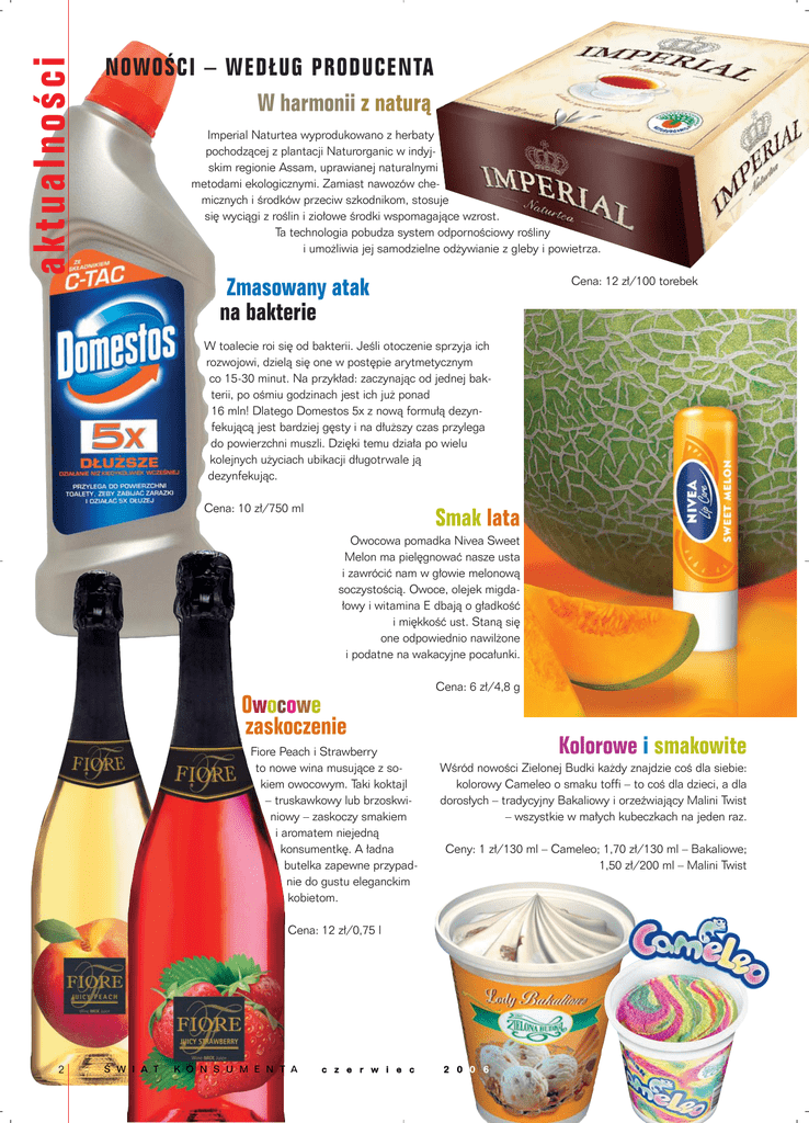 aktualnoÊci NOWOÂCI – WED¸UG PRODUCENTA W harmonii z naturà Imperial Naturtea wyprodukowano z herbaty pochodzàcej z plantacji Naturorganic w indyjskim regionie Assam, uprawianej naturalnymi metodami ekologicznymi. Zamiast nawozów chemicznych i Êrodków przeciw szkodnikom, stosuje si´ wyciàgi z roÊlin i zio∏owe Êrodki wspomagajàce wzrost. Ta technologia pobudza system odpornoÊciowy roÊliny i umo˝liwia jej samodzielne od˝ywianie z gleby i powietrza. Cena: 12 z∏/100 torebek Zmasowany atak na bakterie W toalecie roi si´ od bakterii. JeÊli otoczenie sprzyja ich rozwojowi, dzielà si´ one w post´pie arytmetycznym co 15-30 minut. Na przyk∏ad: zaczynajàc od jednej bakterii, po oÊmiu godzinach jest ich ju˝ ponad 16 mln! Dlatego Domestos 5x z nowà formu∏à dezynfekujàcà jest bardziej g´sty i na d∏u˝szy czas przylega do powierzchni muszli. Dzi´ki temu dzia∏a po wielu kolejnych u˝yciach ubikacji d∏ugotrwale jà dezynfekujàc. Cena: 10 z∏/750 ml Smak lata Owocowa pomadka Nivea Sweet Melon ma piel´gnowaç nasze usta i zawróciç nam w g∏owie melonowà soczystoÊcià. Owoce, olejek migda∏owy i witamina E dbajà o g∏adkoÊç i mi´kkoÊç ust. Stanà si´ one odpowiednio nawil˝one i podatne na wakacyjne poca∏unki. Cena: 6 z∏/4,8 g Owocowe zaskoczenie Fiore Peach i Strawberry to nowe wina musujàce z sokiem owocowym. Taki koktajl – truskawkowy lub brzoskwiniowy – zaskoczy smakiem i aromatem niejednà konsumentk´. A ∏adna butelka zapewne przypadnie do gustu eleganckim kobietom. Kolorowe i smakowite WÊród nowoÊci Zielonej Budki ka˝dy znajdzie coÊ dla siebie: kolorowy Cameleo o smaku toffi – to coÊ dla dzieci, a dla doros∏ych – tradycyjny Bakaliowy i orzeêwiajàcy Malini Twist – wszystkie w ma∏ych kubeczkach na jeden raz. Ceny: 1 z∏/130 ml – Cameleo; 1,70 z∏/130 ml – Bakaliowe; 1,50 z∏/200 ml – Malini Twist Cena: 12 z∏/0,75 l 2  W I A T K O N S U M E N T A c z e r w i e c 2 0 0 6