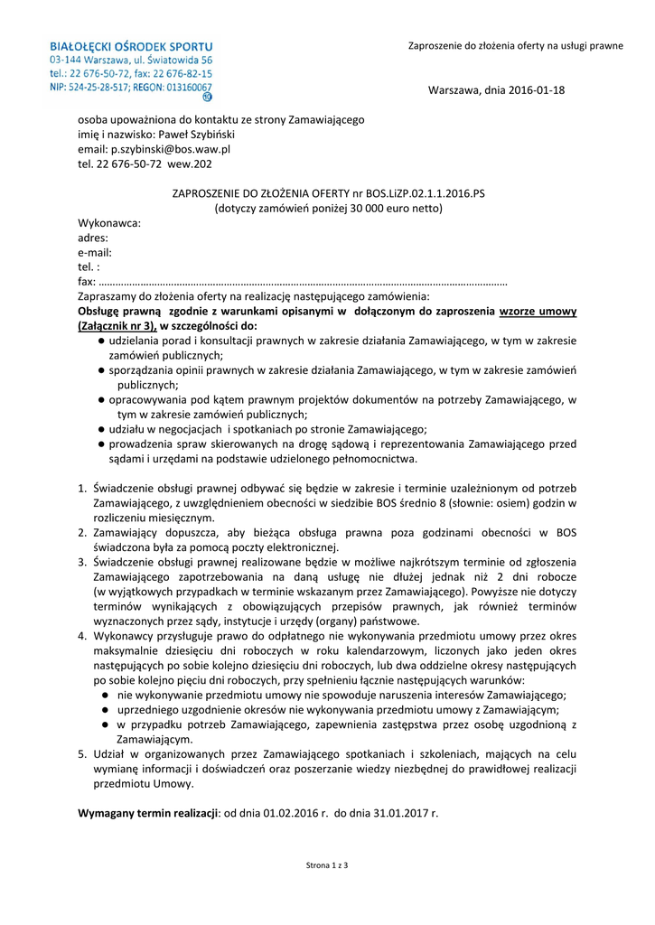Zaproszenie do złożenia oferty na usługi prawne Warszawa, dnia 2016-01-18 Pieczęć zamawiającego osoba upoważniona do kontaktu ze strony Zamawiającego imię i nazwisko: Paweł Szybiński email: [email protected] tel. 22 676-50-72 wew.202 ZAPROSZENIE DO ZŁOŻENIA OFERTY nr BOS.LiZP.02.1.1.2016.PS (dotyczy zamówień poniżej 30 000 euro netto) Wykonawca: adres: e-mail: tel. : fax: ………………………………………………………………………………………………………………………………… Zapraszamy do złożenia oferty na realizację następującego zamówienia: Obsługę prawną zgodnie z warunkami opisanymi w dołączonym do zaproszenia wzorze umowy (Załącznik nr 3), w szczególności do: udzielania porad i konsultacji prawnych w zakresie działania Zamawiającego, w tym w zakresie zamówień publicznych; sporządzania opinii prawnych w zakresie działania Zamawiającego, w tym w zakresie zamówień publicznych; opracowywania pod kątem prawnym projektów dokumentów na potrzeby Zamawiającego, w tym w zakresie zamówień publicznych; udziału w negocjacjach i spotkaniach po stronie Zamawiającego; prowadzenia spraw skierowanych na drogę sądową i reprezentowania Zamawiającego przed sądami i urzędami na podstawie udzielonego pełnomocnictwa. 1. Świadczenie obsługi prawnej odbywać się będzie w zakresie i terminie uzależnionym od potrzeb Zamawiającego, z uwzględnieniem obecności w siedzibie BOS średnio 8 (słownie: osiem) godzin w rozliczeniu miesięcznym. 2. Zamawiający dopuszcza, aby bieżąca obsługa prawna poza godzinami obecności w BOS świadczona była za pomocą poczty elektronicznej. 3. Świadczenie obsługi prawnej realizowane będzie w możliwe najkrótszym terminie od zgłoszenia Zamawiającego zapotrzebowania na daną usługę nie dłużej jednak niż 2 dni robocze (w wyjątkowych przypadkach w terminie wskazanym przez Zamawiającego). Powyższe nie dotyczy terminów wynikających z obowiązujących przepisów prawnych, jak również terminów wyznaczonych przez sądy, instytucje i urzędy (organy) państwowe. 4. Wykonawcy przysługuje prawo do odpłatnego nie wykonywania przedmiotu umowy przez okres maksymalnie dziesięciu dni roboczych w roku kalendarzowym, liczonych jako jeden okres następujących po sobie kolejno dziesięciu dni roboczych, lub dwa oddzielne okresy następujących po sobie kolejno pięciu dni roboczych, przy spełnieniu łącznie następujących warunków: nie wykonywanie przedmiotu umowy nie spowoduje naruszenia interesów Zamawiającego; uprzedniego uzgodnienie okresów nie wykonywania przedmiotu umowy z Zamawiającym; w przypadku potrzeb Zamawiającego, zapewnienia zastępstwa przez osobę uzgodnioną z Zamawiającym. 5. Udział w organizowanych przez Zamawiającego spotkaniach i szkoleniach, mających na celu wymianę informacji i doświadczeń oraz poszerzanie wiedzy niezbędnej do prawidłowej realizacji przedmiotu Umowy. Wymagany termin realizacji: od dnia 01.02.2016 r. do dnia 31.01.2017 r. Strona 1 z 3 Zaproszenie do złożenia oferty na usługi prawne Miejsce usługi: Białołęcki Ośrodek Sportu w Warszawie przy. ul. Światowida 56, zgodnie z warunkami opisanymi w dołączonym do zaproszenia wzorze umowy. Wymagane warunki i termin płatności: zgodnie z warunkami opisanymi w dołączonym do zaproszenia wzorze umowy. WARUNKI UDZIAŁU W POSTĘPOWANIU: 1. Wykonawca musi posiadać uprawnienia do wykonywania zawodu radcy prawnego w rozumieniu ustawy z dnia 6 lipca 1982 r. o radcach prawnych (t.j.. Dz. U. z 2015 poz. 507, z późn. zm.) lub adwokata w rozumieniu ustawy z dnia 26 maja 1982 r. Prawo o adwokaturze (t.j. Dz. U. z 2015 r. poz. 615, z późn. zm.) lub dysponować osobami posiadającymi takie uprawnienia; 2. Wykonawca musi posiadać doświadczenie w zakresie obsługi prawnej Ośrodków Sportu i Rekreacji m.st. Warszawy lub innych jednostek m.st. Warszawy. OŚWIADCZENIA I DOKUMENTY składane wraz z ofertą: 1. Formularz oferty przygotowany zgodnie ze wzorem podanym w Załączniku nr 1 do niniejszego zaproszenia; 2. Oświadczenie o posiadaniu uprawnień do wykonywania zawodu radcy prawnego lub adwokata z podaniem nr wpisu na właściwą listę radców prawnych lub adwokatów; 3. Wykaz co najmniej jednej usługi (Załącznik nr 2) w zakresie obsługi prawnej Ośrodków Sportu i Rekreacji m.st. Warszawy lub innych jednostek m.st. Warszawy o charakterze podobnym do przedmiotu zamówienia (tzn. wykonana w sposób ciągły w ramach 1 umowy) wykonanej/wykonywanej w okresie ostatnich trzech lat przed upływem terminu składania ofert, a jeżeli okres prowadzenia działalności jest krótszy – w tym okresie wraz z podaniem jej rodzaju i wartości, daty i miejsca wykonania/wykonywania oraz z załączeniem dowodów dotyczących usługi, określających, czy usługa ta została wykonana w sposób należyty. Za spełnienie warunku wykonania/wykonywania usługi w sposób ciągły Zamawiający uzna wykonanie usługi w okresie minimum 3 miesięcy. Forma składanych dokumentów: Wykonawca składa ofertę na załączonym formularzu oferty zawierającym oferowane przez Wykonawcę ceny jednostkowe i wartości brutto. Wykonawca składa dokumenty w formie pisemnej (oryginały lub kopie poświadczone przez siebie za zgodność z oryginałem) lub elektronicznej (skany podpisanych dokumentów), dokumenty mają być składane w języku polskim. Ofertę należy złożyć: na adres: Białołęcki Ośrodek Sportu 03-144 Warszawa, ul. Światowida 56 lub pocztą elektroniczną na adres: [email protected] , Ofertę należy złożyć do dnia 25 stycznia 2016 r. do godziny 12.00 W przypadku pytań prosimy o kontakt telefoniczny lub za pomocą poczty elektronicznej na adres: [email protected], Kryterium wyboru oferty: cena 100% Oferty należy składać w kwotach brutto wyrażonych w złotych polskich. Zamawiający przewiduje możliwość negocjacji ceny. Zamawiający przekaże pocztą elektroniczną informac