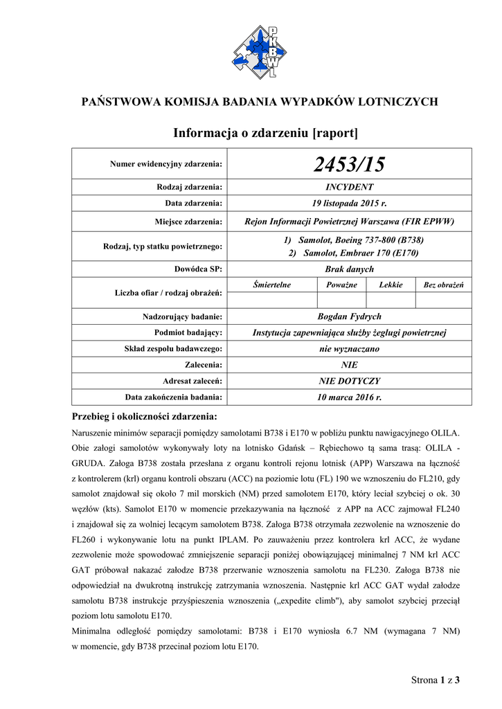PAŃSTWOWA KOMISJA BADANIA WYPADKÓW LOTNICZYCH Informacja o zdarzeniu [raport] 2453/15 Numer ewidencyjny zdarzenia: INCYDENT Rodzaj zdarzenia: 19 listopada 2015 r. Data zdarzenia: Miejsce zdarzenia: Rejon Informacji Powietrznej Warszawa (FIR EPWW) 1) Samolot, Boeing 737-800 (B738) 2) Samolot, Embraer 170 (E170) Rodzaj, typ statku powietrznego: Dowódca SP: Liczba ofiar / rodzaj obrażeń: Brak danych Śmiertelne Nadzorujący badanie: Podmiot badający: Poważne Lekkie Bez obrażeń Bogdan Fydrych Instytucja zapewniająca służby żeglugi powietrznej Skład zespołu badawczego: Zalecenia: nie wyznaczano NIE Adresat zaleceń: NIE DOTYCZY Data zakończenia badania: 10 marca 2016 r. Przebieg i okoliczności zdarzenia: Naruszenie minimów separacji pomiędzy samolotami B738 i E170 w pobliżu punktu nawigacyjnego OLILA. Obie załogi samolotów wykonywały loty na lotnisko Gdańsk – Rębiechowo tą sama trasą: OLILA GRUDA. Załoga B738 została przesłana z organu kontroli rejonu lotnisk (APP) Warszawa na łączność z kontrolerem (krl) organu kontroli obszaru (ACC) na poziomie lotu (FL) 190 we wznoszeniu do FL210, gdy samolot znajdował się około 7 mil morskich (NM) przed samolotem E170, który leciał szybciej o ok. 30 węzłów (kts). Samolot E170 w momencie przekazywania na łączność z APP na ACC zajmował FL240 i znajdował się za wolniej lecącym samolotem B738. Załoga B738 otrzymała zezwolenie na wznoszenie do FL260 i wykonywanie lotu na punkt IPLAM. Po zauważeniu przez kontrolera krl ACC, że wydane zezwolenie może spowodować zmniejszenie separacji poniżej obowiązującej minimalnej 7 NM krl ACC GAT próbował nakazać załodze B738 przerwanie wznoszenia samolotu na FL230. Załoga B738 nie odpowiedział na dwukrotną instrukcję zatrzymania wznoszenia. Następnie krl ACC GAT wydał załodze samolotu B738 instrukcje przyśpieszenia wznoszenia („expedite climb"), aby samolot szybciej przeciął poziom lotu samolotu E170. Minimalna odległość pomiędzy samolotami: B738 i E170 wyniosła 6.7 NM (wymagana 7 NM) w momencie, gdy B738 przecinał poziom lotu E170. Strona 1 z 3 Chronologia przebiegu zdarzenia na podstawie zapisów rozmów telefonicznych (czas UTC): Godzina 06:53:50 - załoga E170 zgłosiła się do krl APP po starcie z drogi startowej 29 lotniska EPWA. Samolot zostaje zidentyfikowany i załoga otrzymała zezwolenie na wznoszenie do FL240. Godzina 06:56:55 - załoga B738 po starcie z lotniska w Modlinie zgłosiła się do krl APP. Po zidentyfikowaniu otrzymała zgodę na początkowe wznoszenie do FL080. Godzina 06:58:00 - załoga B738 otrzymała polecenie wykonywania lotu po prostej do punktu MEBIV. Godzina 07:03:10 - załoga B738 otrzymała zezwolenie na zajęcie FL210. Pomiar odległości pomiędzy samolotami wskazuje R=6.0NM, E170 przecina FL220 z GS=298kt, gdy B738 leci z GS=320. Godzina 07:03:55 - załoga E170 nawiązuje łączność z krl ACC. Godzina 07:04:00 - załoga B738 nawiązuje łączność z krl ACC. Samolot B738 leci przed E170 i jest szybszy. Godzina 07:04:20 - samolot B738 zostaje zidentyfikowany. Załoga B738 otrzymała polecenie lotu na punkt OSLOB i zgodę na wznoszenie do FL260. Godzina 07:04:40 - krl ACC zezwolił załodze B738 na lot po prostej do punktu IPLAM. Godzina 07:04:50 - na wskaźniku radarowym wyświetlona zostaje sygnalizacja o potencjalnej sytuacji kolizyjnej (Short Term Conflict Alert – STCA) - alert żółty. W trakcie przelotu przez FL235 w naborze do FL240 załoga E170 nawiązała łączność z krl ACC. Załoga E170 otrzymuje nakaz wykonania zakrętu o 10 stopni w prawo. W tym czasie samolot B738 znajduje się przed E170 i przelatuje FL210 oraz ma prędkość większą o ok. 20 kts. Godzina 07:05:10 – krl ACC nakazał załodze B738 zatrzymanie wznoszenia na FL230. Załoga nie potwierdziła i nie wykonała polecenia krl. Godzina 07:05:20 - po powtórnym nakazie zatrzymania wznoszenia pilot, potwierdza instrukcję, ale jest już za późno. Samolot B738 przelatuje FL231. Godzina 07:05:30 - na wskaźniku radarowym wyświetlona zostaje sygnalizacja ostrzegawcza Level Bust (LB) dla B738, który właśnie przecina FL234 i jest oddalony o 6,7NM od E170. Godzina 07:05:35 - na wskaźniku radarowym wyświetlona zostaje sygnalizacja ostrzegawcza STCA - alert czerwony. Godzina 07:05:50 - B738 przecina FL243 i otrzymuje nakaz przyspieszenia wznoszenia i zajęcia FL260. Godzina 07:06:05 - samoloty wykonują lot z tą samą prędkością. Separacja pozioma pomiędzy samolotami B738 i E170 wynosi 6,6NM, a separacja pionowa 700ft. Strona 2 z 3 Godzina 07:06:35 - załoga E170 otrzymała zgodę na lot do punktu IPLAM. Godzina 07:08:40 - załoga B738 poprosiła o zezwolenie na zniżanie i otrzymuje polecenie zniżania początkowo FL250. Godzina 07:09:50 - załoga E170 otrzymała polecenie zniżania do FL100. Godzina 07:10:50 - załoga E170, a następnie załoga doganianego B738 nawiązały łączność z krl APP Gdańsk . Ustalenia 1. Był to pierwszy dyżur kontrolera po jednym dniu wolnym. 2. Ilość sektorów otwartych była odpowiednia, natężenie ruchu było w średnich granicach wartości. 3. Pracujący na stanowisku krl ACS licencję kontrolera ruchu lotniczego - uprawnienia ACS otrzymał w 2015 r. W dniu zdarzenia posiadał aktualne wszystkie uprawnienia, oraz orzeczenie lotniczo - lekarskie. 4. Załogi samolotów nawiązały łączność z krl ACC, gdy odległość pozioma wynosiła ok. 5NM, a pionowa ok. 3000 stóp (ft). 5. Kontroler zezwolił załodze B738 na wznoszenie powyżej lotu E170 sugerując się prędkościami postępowymi samolotów. 6. Załoga E170 otrzymała polecenie wykonania zakrętu w prawo zamiast w lewo, w wyniku czego rozpoczęło się doganianie samolotu B738. 7. Usytuowanie dwóch doganiających się samolotów na jednej linii drogi, uniemożliwiło zniżanie B738 poniżej FL250 i nie ułatwiło pracy kontrolerowi APP Gdańsk. Przyczyna zdarzenia lotniczego: Błędy w pracy ATM. Działania profilaktyczn