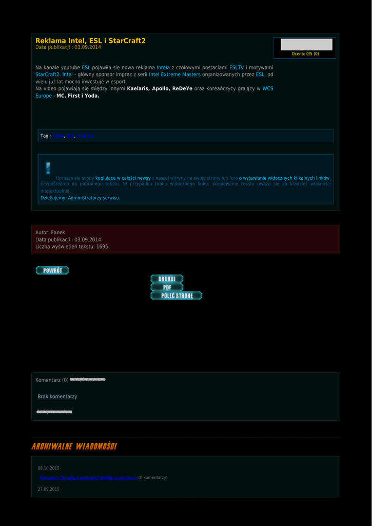 Reklama Intel, ESL i StarCraft2 Data publikacji : 03.09.2014 Ocena: 0/5 (0) Na kanale youtube ESL pojawiła się nowa reklama Intela z czołowymi postaciami ESLTV i motywami StarCraft2. Intel - główny sponsor imprez z serii Intel Extreme Masters organizowanych przez ESL, od wielu już lat mocno inwestuje w esport. Na video pojawiają się między innymi Kaelaris, Apollo, ReDeYe oraz Koreańczycy grający w WCS Europe - MC, First i Yoda. Tagi: video, ESL, reklama Uprasza się osoby kopiujące w całości newsy z naszej witryny na swoje strony lub fora o wstawianie widocznych klikalnych linków, bezpośrednio do pobranego tekstu. W przypadku braku widocznego linku, skopiowanie tekstu uważa się za kradzież własności intelektualnej. Dziękujemy: Administratorzy serwisu. Autor: Fanek Data publikacji : 03.09.2014 Liczba wyświetleń tekstu: 1695 Komentarz (0) dodaj komentarz Brak komentarzy dodaj komentarz 08.10.2015 Kampania "Szepty o zagładzie" dostępna za darmo (0 komentarzy) 27.09.2015 Kolejni bohaterowie w trybie Sprzymierzonych Dowódców (0 komentarzy) 22.09.2015 Cyfrowe gadżety za udział w BlizzCon 2015 (0 komentarzy) 15.07.2015 Legacy of the Void dostępne w przedsprzedaży! (0 komentarzy) 17.06.2015 Informacje z E3 - prolog kampanii Legacy of the Void (0 komentarzy) 30.05.2015 WCS Europe - sobota (30 maja) 18.00 grupa G - MaNa! (0 komentarzy) 07.05.2015 DreamHack Open France 2015 - już 8 maja - MaNa! (0 komentarzy) 03.05.2015 Na wesoło: postacie E-sportu 50 (0 komentarzy) 03.05.2015 IEM Katowice 2015 - jeszcze raz! (0 komentarzy) 03.05.2015 KeSPA Cup 2015 Season 1 - live! (0 komentarzy) 26.04.2015 Proleague - Top5 gier miesiąca (0 komentarzy) 26.04.2015 CJ Entus wygrywa 2 runde Proleague! (0 komentarzy) 18.04.2015 Wersja beta Legacy of the Void – aktualizacja 2.5.1 (0 komentarzy) 18.04.2015 WCS finals 2015 - galeria (0 komentarzy) 18.04.2015 Omówienie zmian w balansie Legacy of the Void (0 komentarzy) 11.04.2015 WCS Europe kwalifikacje z Polakami - dziś (sobota) 18.00 (0 komentarzy) 11.04.2015 Aktualizacja balansu Heart of the Swarm – 9 kwietnia (0 komentarzy) 11.04.2015 GSL Season1 2015 - galeria (0 komentarzy) 11.04.2015 Zbanowane konta w StarCraft II (0 komentarzy) 04.04.2015 Red Bull Battle Grounds powraca jesienią 2015 (0 komentarzy) (zobacz wszystkie)