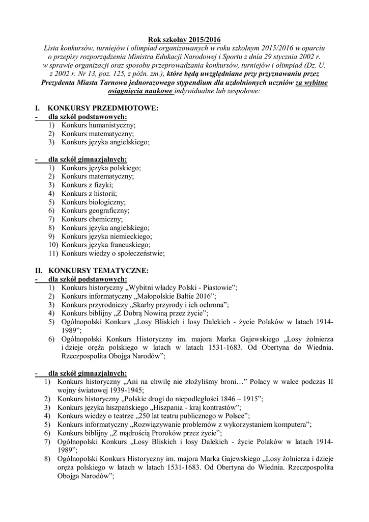 Rok szkolny 2015/2016 Lista konkursów, turniejów i olimpiad organizowanych w roku szkolnym 2015/2016 w oparciu o przepisy rozporządzenia Ministra Edukacji Narodowej i Sportu z dnia 29 stycznia 2002 r. w sprawie organizacji oraz sposobu przeprowadzania konkursów, turniejów i olimpiad (Dz. U. z 2002 r. Nr 13, poz. 125, z późn. zm.), które będą uwzględniane przy przyznawaniu przez Prezydenta Miasta Tarnowa jednorazowego stypendium dla uzdolnionych uczniów za wybitne osiągnięcia naukowe indywidualne lub zespołowe: I. - KONKURSY PRZEDMIOTOWE: dla szkół podstawowych: 1) Konkurs humanistyczny; 2) Konkurs matematyczny; 3) Konkurs języka angielskiego; - dla szkół gimnazjalnych: 1) Konkurs języka polskiego; 2) Konkurs matematyczny; 3) Konkurs z fizyki; 4) Konkurs z historii; 5) Konkurs biologiczny; 6) Konkurs geograficzny; 7) Konkurs chemiczny; 8) Konkurs języka angielskiego; 9) Konkurs języka niemieckiego; 10) Konkurs języka francuskiego; 11) Konkurs wiedzy o społeczeństwie; II. KONKURSY TEMATYCZNE: - dla szkół podstawowych: 1) Konkurs historyczny „Wybitni władcy Polski - Piastowie”; 2) Konkurs informatyczny „Małopolskie Baltie 2016”; 3) Konkurs przyrodniczy „Skarby przyrody i ich ochrona”; 4) Konkurs biblijny „Z Dobrą Nowiną przez życie”; 5) Ogólnopolski Konkurs „Losy Bliskich i losy Dalekich - życie Polaków w latach 19141989”; 6) Ogólnopolski Konkurs Historyczny im. majora Marka Gajewskiego „Losy żołnierza i dzieje oręża polskiego w latach w latach 1531-1683. Od Obertyna do Wiednia. Rzeczpospolita Obojga Narodów”; - dla szkół gimnazjalnych: 1) Konkurs historyczny „Ani na chwilę nie złożyliśmy broni…” Polacy w walce podczas II wojny światowej 1939-1945; 2) Konkurs historyczny „Polskie drogi do niepodległości 1846 – 1915”; 3) Konkurs języka hiszpańskiego „Hiszpania - kraj kontrastów”; 4) Konkurs wiedzy o teatrze „250 lat teatru publicznego w Polsce”; 5) Konkurs informatyczny „Rozwiązywanie problemów z wykorzystaniem komputera”; 6) Konkurs biblijny „Z mądrością Proroków przez życie”; 7) Ogólnopolski Konkurs „Losy Bliskich i losy Dalekich - życie Polaków w latach 19141989”; 8) Ogólnopolski Konkurs Historyczny im. majora Marka Gajewskiego „Losy żołnierza i dzieje oręża polskiego w latach w latach 1531-1683. Od Obertyna do Wiednia. Rzeczpospolita Obojga Narodów”; 9) Ogólnopolski Konkurs wiedzy o czasach i osobie Karola Wojtyły – Jana Pawła II „Papież Słowianin”; 10) Ogólnopolska Olimpiada „Myśli Jana Pawła II”; III. OLIMPIADY: - dla szkół gimnazjalnych: 1) Olimpiada Informatyczna Gimnazjalistów; 2) Olimpiada Matematyczna Gimnazjalistów; 3) Olimpiada Języka Angielskiego Gimnazjalistów; - dla szkół ponadgimnazjalnych: A. olimpiady przedmiotowe: 1) Olimpiada Artystyczna (historii muzyki lub historii sztuki); 2) Olimpiada Biologiczna; 3) Olimpiada Chemiczna; 4) Olimpiada Filozoficzna; 5) Olimpiada Fizyczna; 6) Olimpiada Geograficzna; 7) Ogólnopolska Olimpiada Historyczna; 8) Olimpiada Informatyczna; 9) Ogólnopolska Olimpiada Języka Angielskiego; 10) Olimpiada Języka Białoruskiego; 11) Olimpiada Języka Francuskiego; 12) Olimpiada Języka Łacińskiego i Kultury Antycznej; 13) Ogólnopolska Olimpiada Języka Niemieckiego; 14) Olimpiada Języka Rosyjskiego; 15) Olimpiada Literatury i Języka Polskiego; 16) Olimpiada Języka Hiszpańskiego; 17) Olimpiada Matematyczna; 18) Olimpiada Wiedzy o Polsce i Świecie Współczesnym; B. olimpiady, turnieje tematyczne związane z wybraną dziedziną wiedzy zawodowej: 1) Olimpiada Wiedzy Elektrycznej i Elektronicznej „Euroelektra”; 2) Olimpiada Techniki Samochodowej; 3) Olimpiada Wiedzy Ekonomicznej; 4) Olimpiada Wiedzy Geodezyjnej i Kartograficznej; 5) Olimpiada Wiedzy i Umiejętności Budowlanych; 6) Olimpiada Wiedzy i Umiejętności Rolniczych; 7) Olimpiada Wiedzy o Żywieniu i Żywności; 8) Olimpiada Wiedzy Technicznej; 9) Olimpiada Innowacji Technicznych i Wynalazczości; 10) Ogólnopolska Olimpiada Wiedzy Elektrycznej i Elektronicznej; 11) Ogólnopolska Olimpiada Wiedzy o Żywności; 12) Ogólnopolski Turniej na Najlepszego Ucznia w Zawodzie Cukiernik; 13) Ogólnopolski Turniej Cukierniczy; 14) Ogólnopolski Turniej na Najlepszego Ucznia w Zawodzie Piekarz; 15) Ogólnopolski Turniej Piekarski; 16) Ogólnopolski Turniej Przetwórstwa Mięsa; 17) Olimpiada Wiedzy i Umiejętności Handlowo-Menedżerskich; 18) Olimpiada Wiedzy o Mleku i Mleczarstwie; 19) Ogólnopolska Olimpiada Logistyczna; 20) Olimpiada Wiedzy Hotelarskiej; 21) Turniej Budowlany „Złota Kielnia”; 22) Olimpiada Wiedzy Górniczej „O Złotą Lampkę”; 23) Olimpiada Wiedzy o Turystyce; 24) Olimpiada Wiedzy i Umiejętności z Zakresu Projektowania i Wytwarzania Odzieży; C. olimpiady interdyscyplinarne, przedmiotowe, z przedmiotów dodatkowych lub tematyczne, uznane przez Ministra Edukacji Narodowej za ważne z punktu widzenia systemu edukacji oraz przez niego dofinansowane: 1) Olimpiada Astronomiczna; 2) Olimpiada Teologii Katolickiej; 3) Olimpiada Wiedzy Ekologicznej; 4) Olimpiada Prawosławnej Wiedzy Religijnej; 5) Olimpiada Przedsiębiorczości; 6) Olimpiada z Wiedzy o Planowaniu i Zarządzaniu Karierą Zawodową; 7) Olimpiada Lingwistyki Matematycznej; 8) Olimpiada Wiedzy o Państwie i Prawie; IV. MIĘDZYNARODOWE KONKURSY, OLIMPIADY LUB TURNIEJE Z ZAKRESU RÓŻNYCH DZIEDZIN NAUKI, posiadające uznaną i znaczącą rangę, organizowane w szczególności pod patronatem ministra właściwego do spraw oświaty, szkół wyższych lub instytucji naukowych: - dla szkół podstawowych, gimnazjów i szkół ponadgimnazjalnych.