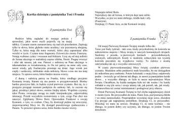 Kartka dziesiąta z pamiętnika Tosi i Franka Niepojęta miłość Boża. Największy dar od Jezusa, w którym daje nam siebie. Wszystko, co jest we mnie dobrego, źródło łask i siły. (Faustyna). Dziękuję, Ci Panie Jezu, za dar Komunii świętej. Z pamiętnika Tosi Rodzice lubią zaglądać do mojego pokoju i sprawdzać, jakie nowe myśli pojawiły się na mojej tablicy. Czasami razem zastanawiamy się nad ich przesłaniem. Zapisuję tylko te słowa, które głęboko mnie urzekną i nie pozostawią obojętną. Tylko te, które mają dla mnie wartość, które chcę zapamiętać albo wcielić w życie. Czytam teraz fragmenty Dzienniczka siostry Faustyny. Notuję wybrane cytaty i wieszam nad łóżkiem. Uczę się od niej miłości do Jezusa ukrytego w maleńkiej cząstce chleba, Hostii. Pragnę wierzyć i ufać tak mocno, jak ona. Patrzeć z miłością na Pana ukrytego w tabernakulum ze świadomością, że On też patrzy na mnie cały czas, nawet wtedy, gdy Eucharystia przestaje się dziać. Jego wzrok jest ciepły i serdeczny, delikatnie otula miłością. Słowo wiem nie ma tutaj miejsca. To sprawa serca, które bardzo mocno wierzy. Z dumą i radością patrzę na Franka, który niedługo przyjmie Komunię świętą. Staram się mu pomóc w przygotowaniach. Biedny bardzo przeżywa fakt, że będzie czytał pierwsze czytanie. Boi się, że z przejęcia przegapi moment podejścia do ambony lub, że zacznie się jąkać, przekręci jakieś słowo, ominie linijkę tekstu. Wspólnie czytamy tekst Pisma, zwracając uwagę na znaki interpunkcyjne, odpowiednią intonację. Przede wszystkim rozmawiamy o tym, czego Pan chce nas nauczyć. Zgłębiamy Słowo Boże. Opowiadam Frankowi o swojej Komunii, o tym, co czułam. Chcę, by dostrzegł piękno tej uroczystej, niepowtarzalnej Mszy św. By dostąpił prawdziwego zjednoczenia z Panem. To przecież sprawa serca, które bardzo mocno wierzy. Z pamiętnika Franka Od mojej Pierwszej Komunii Świętej minęło kilka dni. Teraz jest biały tydzień - taki czas, kiedy przychodzimy do kościoła na nabożeństwa majowe i Mszę świętą w naszych komunijnych strojach. Siedzimy z przodu, w pierwszych ławkach – przyozdobionych, zielonych, odświętnych. Kiedy w niedzielę zobaczyłem ten wystrój kościoła poczułem się wyjątkowo ważny. To rodzice z siostrą zakrystianką tak się o wszystko zatroszczyli. W czasie pierwszokomunijnej Mszy świętej czytałem pierwsze czytanie. Musiałem sobie podstawić małe krzesełko, bo nie dosięgałem do mikrofonu przy ambonie. Potem koleżanki z mojej klasy zaśpiewały psalm – ćwiczyły go od dawna tak długo, że nawet ja pamiętałem każde słowo… a wszystko dlatego, że była to nasza najważniejsza Msza Święta. Chciałbym, by każda następna była też tak ważna i by każdy wkładał w nią tyle serca i swoje talenty tak, jak potrafi, tak, jak wtedy. Postanowiłem też zostać ministrantem i posługiwać przy ołtarzu. Dzień Pierwszej Komunii Świętej to był chyba najpiękniejszy dzień w moim życiu. Bo przyszedłeś do mnie, Panie Jezu, pod postacią chleba i we mnie zamieszkałeś. Posprzątałem wcześniej moje serce, chciałem Cię przyjąć jak najpiękniej potrafiłem. Dziękuję Ci, że przyszedłeś. Mieszkaj we mnie na zawsze. Dziękuję Ci, że mnie kochasz – nie dlatego, że jestem dobry czy uczynny, ale dlatego, że jestem Twoim dzieckiem.