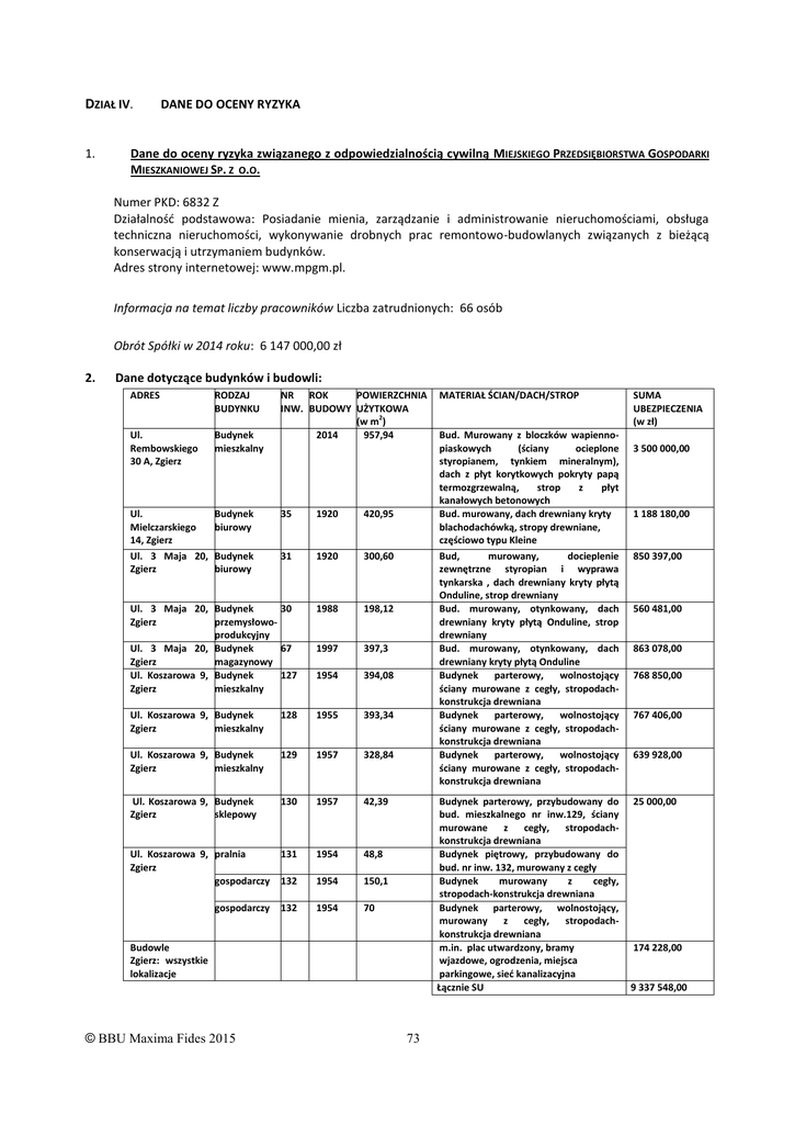 DZIAŁ IV. 1. DANE DO OCENY RYZYKA Dane do oceny ryzyka związanego z odpowiedzialnością cywilną MIEJSKIEGO PRZEDSIĘBIORSTWA GOSPODARKI MIESZKANIOWEJ SP. Z O.O. Numer PKD: 6832 Z Działalność podstawowa: Posiadanie mienia, zarządzanie i administrowanie nieruchomościami, obsługa techniczna nieruchomości, wykonywanie drobnych prac remontowo-budowlanych związanych z bieżącą konserwacją i utrzymaniem budynków. Adres strony internetowej: www.mpgm.pl. Informacja na temat liczby pracowników Liczba zatrudnionych: 66 osób Obrót Spółki w 2014 roku: 6 147 000,00 zł 2. Dane dotyczące budynków i budowli: ADRES RODZAJ BUDYNKU NR ROK POWIERZCHNIA INW. BUDOWY UŻYTKOWA (w m2) 2014 957,94 Ul. Rembowskiego 30 A, Zgierz Budynek mieszkalny Ul. Mielczarskiego 14, Zgierz Ul. 3 Maja 20, Zgierz Budynek biurowy 35 1920 420,95 Budynek biurowy 31 1920 300,60 Ul. 3 Maja 20, Budynek 30 Zgierz przemysłowoprodukcyjny Ul. 3 Maja 20, Budynek 67 Zgierz magazynowy Ul. Koszarowa 9, Budynek 127 Zgierz mieszkalny 1988 198,12 1997 397,3 1954 394,08 Ul. Koszarowa 9, Budynek Zgierz mieszkalny 128 1955 393,34 Ul. Koszarowa 9, Budynek Zgierz mieszkalny 129 1957 328,84 Ul. Koszarowa 9, Budynek Zgierz sklepowy 130 1957 42,39 Ul. Koszarowa 9, pralnia Zgierz gospodarczy 131 1954 48,8 132 1954 150,1 gospodarczy 132 1954 70 Bud. Murowany z bloczków wapiennopiaskowych (ściany ocieplone styropianem, tynkiem mineralnym), dach z płyt korytkowych pokryty papą termozgrzewalną, strop z płyt kanałowych betonowych Bud. murowany, dach drewniany kryty blachodachówką, stropy drewniane, częściowo typu Kleine Bud, murowany, docieplenie zewnętrzne styropian i wyprawa tynkarska , dach drewniany kryty płytą Onduline, strop drewniany Bud. murowany, otynkowany, dach drewniany kryty płytą Onduline, strop drewniany Bud. murowany, otynkowany, dach drewniany kryty płytą Onduline Budynek parterowy, wolnostojący ściany murowane z cegły, stropodachkonstrukcja drewniana Budynek parterowy, wolnostojący ściany murowane z cegły, stropodachkonstrukcja drewniana Budynek parterowy, wolnostojący ściany murowane z cegły, stropodachkonstrukcja drewniana Budynek parterowy, przybudowany do bud. mieszkalnego nr inw.129, ściany murowane z cegły, stropodachkonstrukcja drewniana Budynek piętrowy, przybudowany do bud. nr inw. 132, murowany z cegły Budynek murowany z cegły, stropodach-konstrukcja drewniana Budynek parterowy, wolnostojący, murowany z cegły, stropodachkonstrukcja drewniana m.in. plac utwardzony, bramy wjazdowe, ogrodzenia, miejsca parkingowe, sieć kanalizacyjna Łącznie SU Budowle Zgierz: wszystkie lokalizacje © BBU Maxima Fides 2015 MATERIAŁ ŚCIAN/DACH/STROP 73 SUMA UBEZPIECZENIA (w zł) 3 500 000,00 1 188 180,00 850 397,00 560 481,00 863 078,00 768 850,00 767 406,00 639 928,00 25 000,00 174 228,00 9 337 548,00 ADRES RODZAJ BUDYNKU NR ROK POWIERZCHNIA INW. BUDOWY UŻYTKOWA (w m2) 2014 957,94 Ul. Rembowskiego 30 A, Zgierz Budynek mieszkalny Ul. Mielczarskiego 14, Zgierz Ul. 3 Maja 20, Zgierz Budynek biurowy 35 1920 420,95 Budynek biurowy 31 1920 300,60 Ul. 3 Maja 20, Budynek 30 Zgierz przemysłowoprodukcyjny Ul. 3 Maja 20, Budynek 67 Zgierz magazynowy 1988 198,12 1997 397,3 Ul. Koszarowa 9, Budynek Zgierz mieszkalny 127 1954 394,08 Ul. Koszarowa 9, Budynek Zgierz mieszkalny 128 1955 393,34 Ul. Koszarowa 9, Budynek Zgierz mieszkalny 129 1957 328,84 Ul. Koszarowa 9, Budynek Zgierz sklepowy Ul. Koszarowa 9, pralnia Zgierz gospodarczy 130 1957 42,39 131 1954 48,8 132 1954 150,1 gospodarczy 132 1954 70 PODSTAWA WYLICZENIA WARTOŚCI Zgodnie z zapisami Działu II Sekcji II pkt.9.2.1 ppkt.2 SIWZ Zgodnie z zapisami Działu II Sekcji II pkt.9.2.1 ppkt.1 SIWZ, tabela nr BCU 4.1220.136 Zgodnie z zapisami Działu II Sekcji II pkt.9.2.1 ppkt.1 SIWZ, tabela nr BCU 4.1220.136 Zgodnie z zapisami Działu II Sekcji II pkt.9.2.1 ppkt.1 SIWZ, tabela nr BCU 4.1220.136 Zgodnie z zapisami Działu II Sekcji II pkt.9.2.1 ppkt.1 SIWZ, tabela nr BCU 4.1252.156 Zgodnie z zapisami Działu II Sekcji II pkt.9.2.1 ppkt.1 SIWZ, tabela nr BCU 4.1122.221 Zgodnie z zapisami Działu II Sekcji II pkt.9.2.1 ppkt.1 SIWZ, tabela nr BCU 4.1122.221 Zgodnie z zapisami Działu II Sekcji II pkt.9.2.1 ppkt.1 SIWZ, tabela nr BCU 4.1122.221 Zgodnie z zapisami Działu II Sekcji II pkt.9.2.1 ppkt.3 SIWZ Budowle Zgierz: wszystkie lokalizacje Zgodnie z zapisami Działu II Sekcji II pkt.9.2.1 ppkt.2 SIWZ Łącznie SU 3. Odpowiedzialność cywilna z tytułu prowadzonej działalności i posiadanego mienia Data szkody wypłata 2012-02-17 4 881,19 zł 0,00 zł zalanie/ awaria inst. wod. 2012-10-31 614,92 zł 0,00 zł zalanie/ nieszczelny dach 2013-01-24 0,00 zł 2013-01-25 1 091,81 zł 0,00 zł zalanie/ nieszczelny dach 2013-01-30 0,00 zł 5 730,46 zł osobowa - pozew sądowy 2013-01-31 1 094,60 zł 0,00 zł zalanie/ nieszczelny dach 2013-02-01 930,21 zł 0,00 zł zalanie/ nieszczelny dach 2013-02-28 1 465,87 zł 0,00 zł zalanie/ nieszczelny dach 0,00 zł 2013-04-08 248,00 zł 0,00 zł - 2013-04-09 537,00 zł 0,00 zł - 2013-05-02 572,00 zł 0,00 zł - 2013-06-05 706,00 zł 0,00 zł - 2013-06-06 473,00 zł 0,00 zł - 2013-06-07 195,00 zł 0,00 zł - © BBU Maxima Fides 2013 przyczyna 31 754,45 zł upadek na oblodzonym chodniku - pozew sądowy 2013-03-21 4 187,40 zł upadek na oblodzonym chodniku - pozew sądowy 74 3 500 000,00 1 188 180,00 850 397,00 560 481,00 863 078,00 768 850,00 767 406,00 639 928,00 25 000,00 174 228,00 9 337 548,00 Informacja na temat szkodowości na dzień: 20.03.2015 r. rezerwa SUMA UBEZPIECZENIA (w zł) 2013-06-14 1 362,00 zł 2013-06-18 526,00 zł 0,00 zł - 2013-10-15 300,00 zł 0,00 zł - 2014-01-22 0,00 zł 0,00 zł - 2014-05-06 2 080,00 zł 0,00 zł - 2014-05-27 356,00 zł 0,00 zł - RAZEM 0,00 zł zalanie przez zadaszenie 17 433,60 zł 41 672,31 zł Data szkody wypłata rezerwa 2014-09-19 1 997,00 zł 0,00 zł kradzież wyłączników różnicoprądowych RAZEM 1 997,00 zł 0,00 zł Mienie przyczyna Odpowiedzialność cywilna p