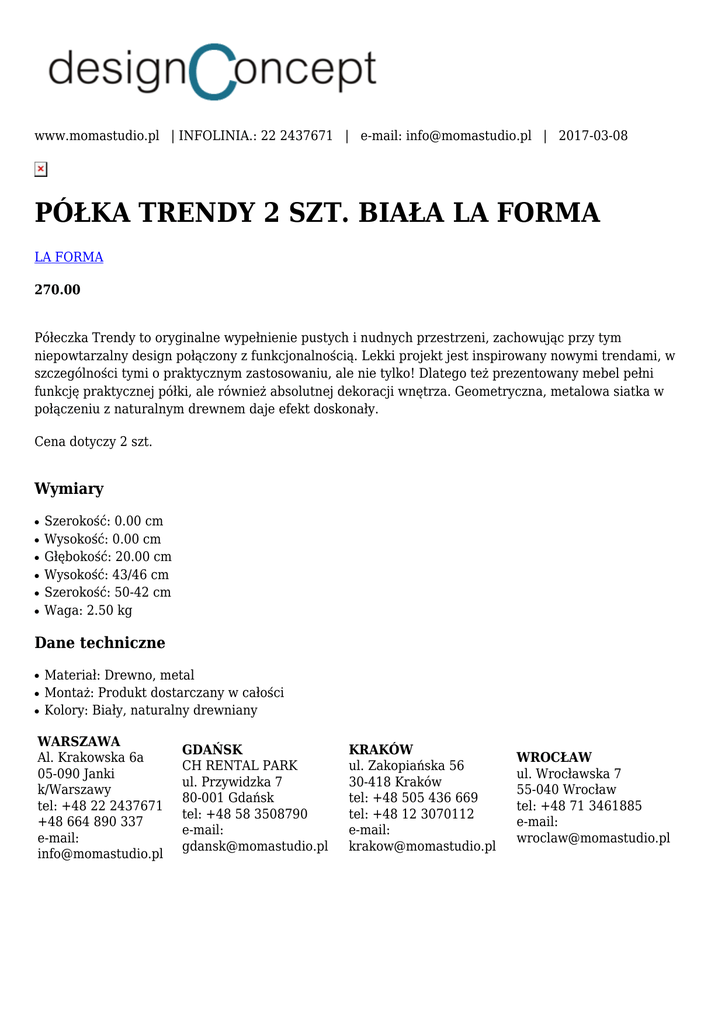 www.momastudio.pl | INFOLINIA.: 22 2437671 | e-mail: [email protected] | 2017-03-08 PÓŁKA TRENDY 2 SZT. BIAŁA LA FORMA LA FORMA 270.00 Półeczka Trendy to oryginalne wypełnienie pustych i nudnych przestrzeni, zachowując przy tym niepowtarzalny design połączony z funkcjonalnością. Lekki projekt jest inspirowany nowymi trendami, w szczególności tymi o praktycznym zastosowaniu, ale nie tylko! Dlatego też prezentowany mebel pełni funkcję praktycznej półki, ale również absolutnej dekoracji wnętrza. Geometryczna, metalowa siatka w połączeniu z naturalnym drewnem daje efekt doskonały. Cena dotyczy 2 szt. Wymiary ● ● ● ● ● ● Szerokość: 0.00 cm Wysokość: 0.00 cm Głębokość: 20.00 cm Wysokość: 43/46 cm Szerokość: 50-42 cm Waga: 2.50 kg Dane techniczne ● ● ● Materiał: Drewno, metal Montaż: Produkt dostarczany w całości Kolory: Biały, naturalny drewniany WARSZAWA Al. Krakowska 6a 05-090 Janki k/Warszawy tel: +48 22 2437671 +48 664 890 337 e-mail: [email protected] GDAŃSK CH RENTAL PARK ul. Przywidzka 7 80-001 Gdańsk tel: +48 58 3508790 e-mail: [email protected] KRAKÓW ul. Zakopiańska 56 30-418 Kraków tel: +48 505 436 669 tel: +48 12 3070112 e-mail: [email protected] WROCŁAW ul. Wrocławska 7 55-040 Wrocław tel: +48 71 3461885 e-mail: [email protected]