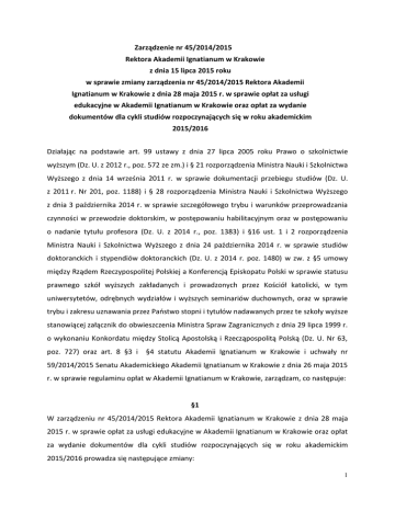Zarządzenie nr 45/2014/2015 Rektora Akademii Ignatianum w Krakowie z dnia 15 lipca 2015 roku w sprawie zmiany zarządzenia nr 45/2014/2015 Rektora Akademii Ignatianum w Krakowie z dnia 28 maja 2015 r. w sprawie opłat za usługi edukacyjne w Akademii Ignatianum w Krakowie oraz opłat za wydanie dokumentów dla cykli studiów rozpoczynających się w roku akademickim 2015/2016 Działając na podstawie art. 99 ustawy z dnia 27 lipca 2005 roku Prawo o szkolnictwie wyższym (Dz. U. z 2012 r., poz. 572 ze zm.) i § 21 rozporządzenia Ministra Nauki i Szkolnictwa Wyższego z dnia 14 września 2011 r. w sprawie dokumentacji przebiegu studiów (Dz. U. z 2011 r. Nr 201, poz. 1188) i § 28 rozporządzenia Ministra Nauki i Szkolnictwa Wyższego z dnia 3 października 2014 r. w sprawie szczegółowego trybu i warunków przeprowadzania czynności w przewodzie doktorskim, w postępowaniu habilitacyjnym oraz w postępowaniu o nadanie tytułu profesora (Dz. U. z 2014 r., poz. 1383) i §16 ust. 1 i 2 rozporządzenia Ministra Nauki i Szkolnictwa Wyższego z dnia 24 października 2014 r. w sprawie studiów doktoranckich i stypendiów doktoranckich (Dz. U. z 2014 r. poz. 1480) w zw. z §5 umowy między Rządem Rzeczypospolitej Polskiej a Konferencją Episkopatu Polski w sprawie statusu prawnego szkół wyższych zakładanych i prowadzonych przez Kościół katolicki, w tym uniwersytetów, odrębnych wydziałów i wyższych seminariów duchownych, oraz w sprawie trybu i zakresu uznawania przez Państwo stopni i tytułów nadawanych przez te szkoły wyższe stanowiącej załącznik do obwieszczenia Ministra Spraw Zagranicznych z dnia 29 lipca 1999 r. o wykonaniu Konkordatu między Stolicą Apostolską i Rzecząpospolitą Polską (Dz. U. Nr 63, poz. 727) oraz art. 8 §3 i §4 statutu Akademii Ignatianum w Krakowie i uchwały nr 59/2014/2015 Senatu Akademickiego Akademii Ignatianum w Krakowie z dnia 26 maja 2015 r. w sprawie regulaminu opłat w Akademii Ignatianum w Krakowie, zarządzam, co następuje: §1 W zarządzeniu nr 45/2014/2015 Rektora Akademii Ignatianum w Krakowie z dnia 28 maja 2015 r. w sprawie opłat za usługi edukacyjne w Akademii Ignatianum w Krakowie oraz opłat za wydanie dokumentów dla cykli studiów rozpoczynających się w roku akademickim 2015/2016 prowadza się następujące zmiany: 1 1) w §6 ust. 1 do tabeli po wierszu ”Administracja i polityka publiczna” dodaje się pozycję z kierunkiem studiów ”filologia angielska” i ustala opłatę w wysokości 60,00 zł za jeden punkt ECTS za świadczone przez Akademię Ignatianum w Krakowie usługi edukacyjne związane z powtarzaniem określonych zajęć z powodu niezadowalających wyników w nauce na studiach na kierunku ”filologia angielska”. 2) w §6 ust. 1 dotychczasowa tabela otrzymuje następujące brzmienie: opłata za jeden punkt Wydział kierunek/dyscyplina studiów ECTS (studia stacjonarne i niestacjonarne) Wydział Filozoficzny Dziennikarstwo i komunikacja społeczna 60,00 zł Filozofia 45,00 zł Kulturoznawstwo 54,00 zł Psychologia 70,00 zł Wydział Pedagogiczny Administracja i polityka publiczna 60,00 zł Filologia angielska 60,00 zł Pedagogika 64,00 zł Politologia 60,00 zł Praca socjalna 60,00 zł §2 Zarządzenie wchodzi w życie z dniem podpisania. Ks. prof. dr hab. Józef Bremer SJ Rektor Akademii Ignatianum w Krakowie 2