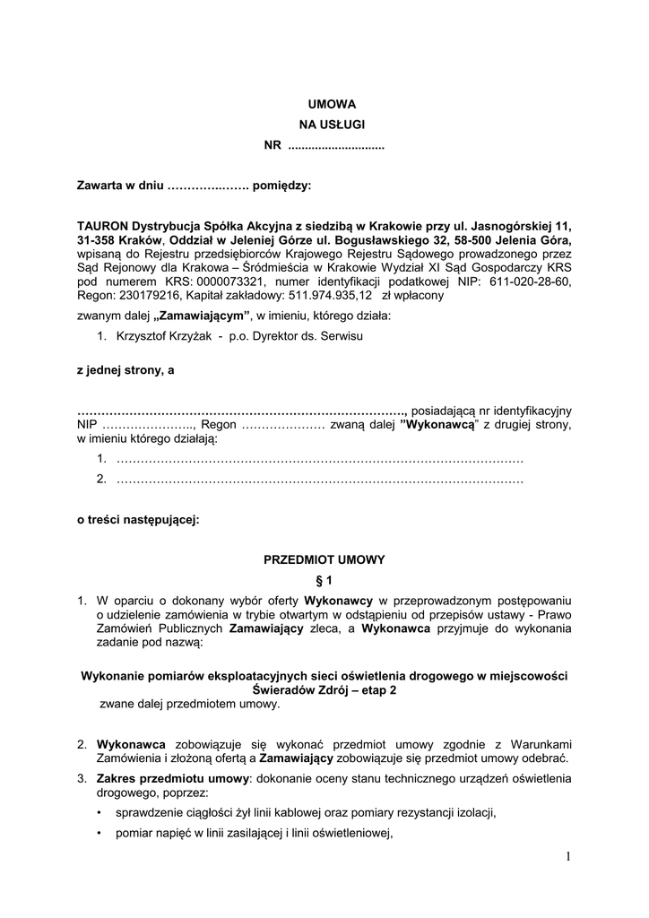 UMOWA NA USŁUGI NR ............................. Zawarta w dniu …………..……. pomiędzy: TAURON Dystrybucja Spółka Akcyjna z siedzibą w Krakowie przy ul. Jasnogórskiej 11, 31-358 Kraków, Oddział w Jeleniej Górze ul. Bogusławskiego 32, 58-500 Jelenia Góra, wpisaną do Rejestru przedsiębiorców Krajowego Rejestru Sądowego prowadzonego przez Sąd Rejonowy dla Krakowa – Śródmieścia w Krakowie Wydział XI Sąd Gospodarczy KRS pod numerem KRS: 0000073321, numer identyfikacji podatkowej NIP: 611-020-28-60, Regon: 230179216, Kapitał zakładowy: 511.974.935,12 zł wpłacony zwanym dalej „Zamawiającym”, w imieniu, którego działa: 1. Krzysztof Krzyżak - p.o. Dyrektor ds. Serwisu z jednej strony, a ………………………………………………………………………., posiadającą nr identyfikacyjny NIP ………………….., Regon ………………… zwaną dalej ”Wykonawcą” z drugiej strony, w imieniu którego działają: 1. ………………………………………………………………………………………… 2. ………………………………………………………………………………………… o treści następującej: PRZEDMIOT UMOWY §1 1. W oparciu o dokonany wybór oferty Wykonawcy w przeprowadzonym postępowaniu o udzielenie zamówienia w trybie otwartym w odstąpieniu od przepisów ustawy - Prawo Zamówień Publicznych Zamawiający zleca, a Wykonawca przyjmuje do wykonania zadanie pod nazwą: Wykonanie pomiarów eksploatacyjnych sieci oświetlenia drogowego w miejscowości Świeradów Zdrój – etap 2 zwane dalej przedmiotem umowy. 2. Wykonawca zobowiązuje się wykonać przedmiot umowy zgodnie z Warunkami Zamówienia i złożoną ofertą a Zamawiający zobowiązuje się przedmiot umowy odebrać. 3. Zakres przedmiotu umowy: dokonanie oceny stanu technicznego urządzeń oświetlenia drogowego, poprzez: • sprawdzenie ciągłości żył linii kablowej oraz pomiary rezystancji izolacji, • pomiar napięć w linii zasilającej i linii oświetleniowej, 1 • pomiar rezystancji izolacji przewodów instalacji w słupach zasilających oprawy oświetleniowe, • sprawdzenie skuteczności działania ochrony przeciwporażeniowej, • pomiar rezystancji uziemień roboczych i ochronnych OGÓLNE OBOWIĄZKI STRON §2 1. Wykonawca na żadnym etapie i do żadnej czynności dokonywanej w związku z realizowanym przedmiotem umowy nie może bez pisemnej zgody Zamawiającego: 1) zatrudniać lub w inny sposób korzystać płatnie lub nieodpłatnie z usług osób będących pracownikami Zamawiającego, 2) korzystać ze środków transportu, narzędzi lub jakiegokolwiek innego mienia należącego do Zamawiającego. 2. W razie naruszenia przez Wykonawcę zapisu ust. 1 Zamawiającemu przysługiwać będzie prawo do wypowiedzenia umowy ze skutkiem natychmiastowym (zgodnie z § 9 ust. 2 pkt 1) i naliczenia kar umownych zgodnie z § 8, ust 1 pkt. 5 oraz prawo do wykluczenia Wykonawcy z przetargów przeprowadzanych w przyszłości. TERMINY §3 Strony uzgadniają następujące terminy realizacji przedmiotu Umowy: Wykonanie przedmiotu umowy nastąpi w okresie dwóch miesięcy od dnia podpisania umowy. ODBIORY §4 1. Strony ustalają, iż miejscem wykonania umowy jest: obszar miasta Świeradów Zdrój. 2. Zamawiający zobowiązuje się zapewnić odpowiednie warunki do odbioru przedmiotu umowy, w szczególności zobowiązuje się, iż osoby upoważnione do działania w imieniu Zamawiającego będą uczestniczyć w procedurze odbioru przedmiotu umowy. 3. Zamawiający zastrzega sobie prawo do ciągłego sprawdzania stanu wykonania umowy i przedstawiania swoich uwag Wykonawcy. 4. Dokumentem potwierdzającym odbiór przez Zamawiającego wykonania usługi jest protokół odbioru podpisany przez obie strony. 5. Warunkiem odbioru przedmiotu umowy przez Zamawiającego jest przekazanie przez Wykonawcę protokołów pomiaru rezystancji izolacji obwodów oświetlenia, sterowania i odbiorników elektrycznych oraz protokołów sprawdzenia skuteczności ochrony przeciwporażeniowej w zakresie określonym w warunkach zamówienia 6. W ramach umowy strony mogą wystąpić o zorganizowanie spotkania otwierającego, interwencyjnego lub zamykającego realizację niniejszej umowy oraz o spisanie notatki z oświadczeniem o spełnieniu warunków umowy. 2 SZCZEGÓŁOWE OBOWIĄZKI STRON §5 1. Wykonawca zobowiązuje się wykonać przedmiot umowy zgodnie z warunkami Zamówienia i złożoną ofertą w wyznaczonym terminie. 2. Przedmiot umowy będzie realizowany na koszt i ryzyko Wykonawcy. 3. Zamawiający zobowiązuje się do współpracy w zakresie realizacji przedmiotu umowy, w tym do udostępnienia niezbędnych danych oraz do dokonania wymaganych czynności związanych z dopuszczeniem, przygotowaniem i likwidacją miejsca pracy. 4. Wykonawca zobowiązany jest przedstawić Zamawiającemu harmonogram wykonywania pomiarów (co najmniej 14 dni przed planowanym rozpoczęciem prac) z dokładnym określeniem czasu i miejsca zgodnie z załącznikiem nr 1 do umowy. 1) Przedstawiony przez Wykonawcę harmonogram musi być zaakceptowany i podpisany przez osobę odpowiedzialna za wykonanie niniejszej umowy z ramienia Zamawiającego. 2) Wszelkie zmiany w harmonogramie wymagają pisemnej zgody ze strony przedstawiciela Zamawiającego. 5. Wykonawca może przystąpić do pracy na sieci elektroenergetycznej w celu realizacji postanowień niniejszej umowy tylko za zgodą Zamawiającego po uprzednim zgłoszeniu tego faktu. 6. Wykonawca zobowiązuje się ponadto do: 1) zachowania dyspozycyjności względem Zamawiającego, 2) zapewnienia we własnym zakresie wszystkich środków i materiałów niezbędnych do przygotowania, zrealizowania i przekazania Zamawiającemu przedmiotu umowy w wyznaczonym terminie, 3) Wykonawca jest zobowiązany posiadać aktualne dokumenty Urzędu Dozoru Technicznego, (jeśli są wymagane) dopuszczające posiadany sprzęt specjalistyczny do eksploat