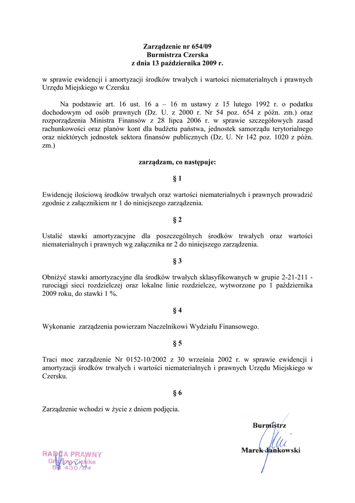 Zarządzenie nr 654/09 Burmistrza Czerska z dnia 13 października 2009 r. w sprawie ewidencji i amortyzacji środków trwałych i wartości niematerialnych i prawnych Urzędu Miejskiego w Czersku Na podstawie art. 16 ust. 16 a – 16 m ustawy z 15 lutego 1992 r. o podatku dochodowym od osób prawnych (Dz. U. z 2000 r. Nr 54 poz. 654 z późn. zm.) oraz rozporządzenia Ministra Finansów z 28 lipca 2006 r. w sprawie szczegółowych zasad rachunkowości oraz planów kont dla budŜetu państwa, jednostek samorządu terytorialnego oraz niektórych jednostek sektora finansów publicznych (Dz. U. Nr 142 poz. 1020 z późn. zm.) zarządzam, co następuje: §1 Ewidencję ilościową środków trwałych oraz wartości niematerialnych i prawnych prowadzić zgodnie z załącznikiem nr 1 do niniejszego zarządzenia. §2 Ustalić stawki amortyzacyjne dla poszczególnych środków trwałych oraz wartości niematerialnych i prawnych wg załącznika nr 2 do niniejszego zarządzenia. §3 ObniŜyć stawki amortyzacyjne dla środków trwałych sklasyfikowanych w grupie 2-21-211 rurociągi sieci rozdzielczej oraz lokalne linie rozdzielcze, wytworzone po 1 października 2009 roku, do stawki 1 %. §4 Wykonanie zarządzenia powierzam Naczelnikowi Wydziału Finansowego. §5 Traci moc zarządzenie Nr 0152-10/2002 z 30 września 2002 r. w sprawie ewidencji i amortyzacji środków trwałych i wartości niematerialnych i prawnych Urzędu Miejskiego w Czersku. §6 Zarządzenie wchodzi w Ŝycie z dniem podjęcia. Załącznik Nr 1 Do Zarządzenia Nr 654/09 Burmistrza Czerska z dnia 13 października 2009 r. Określenie dolnej i górnej granicy wartości środków trwałych (pozostałych środków trwałych), które objęte są ewidencją ilościową 1. Przyjmuje się dolną granicę 100 zł i nie przewyŜszająca wartości 300 zł. 2. Ewidencji ilościowej podlegają na przykład takie środki jak: narzędzia, odzieŜ , z których kontrola ilościowa wystarcza dla zabezpieczenia majątku jednostki. 3. Zakup środków trwałych (pozostałych środków trwałych) podlega zaliczeniu bezpośrednio w koszty (§ 4210) bez księgowania na koncie 011 czy 013. Załącznik Nr 2 Do Zarządzenia Nr 654/09 Burmistrza Czerska z dnia 13 października 2009 r. Rozdział I – Rzeczowy majątek trwały Zgodnie z definicją prawną zawartą w ustawie o rachunkowości z dnia 29.09.1994 r. (tj. Dz. U. z 2002 r. Nr 76 poz. 694 ze zm.) za środki trwałe uznaje się: I. Nieruchomości; 1. 2. 3. 4. Grunty Prawo uŜytkowania wieczystego gruntu Budowle i budynki (w tym takŜe będące odrębną własnością lokale) Spółdzielcze własnościowe prawo do lokalu mieszkalnego oraz spółdzielcze prawo do lokalu uŜytkowego. II. Maszyny. III. Urządzenia. IV. Środki transportu. V. Ulepszenia w obcych środkach trwałych. VI. Inwentarz Ŝywy. Do środków trwałych zalicza się równieŜ obce środki trwałe na podstawie umów, najmu, dzierŜawy jeŜeli z innych przepisów wynika prawo dokonywania od nich odpisów umorzeniowych środków trwałych ewidencjonuje się wg cen nabycia, kosztów wytworzenia lub wartości po aktualizacji wyceny. Przez cenę nabycia - rozumie się rzeczywistą cenę zakupu składnika majątku, obejmującą kwotę naleŜną sprzedającemu a w przypadku importu powiększoną o koszty bezpośrednio związane z zakupem i przystosowaniem środka trwałego do stanu zdatnego do uŜywania łącznie z kosztami transportu, jak teŜ załadunkiem, wyładunkiem i montaŜem a pomniejszoną o rabaty i opusty ceny. Koszt wytworzenia składnika majątku we własnym zakresie obejmuje koszty produkcji poszczególnych elementów; do kosztów działania jednostki jako całości oraz zarządzania nią, kosztów sprzedaŜy produktów, towarów i innych składników majątku jak i pozostałych wyników operacyjnych. Rozdział II - Plan amortyzacji środków trwałych Podstawą dokonywania odpisów amortyzacyjnych stanowi plan amortyzacji określający stawki poszczególnych środków trwałych. Kwoty rocznych odpisów ustala się drogą systematycznego rozłoŜenia wartości początkowej danego środka trwałego na przewidywane lata jego uŜytkowania, proporcjonalnie do upływu czasu w równych ratach czyli wg tzw. Metody liniowej. Przy zastosowaniu metody liniowej roczną stawkę (kwotę) amortyzacji ustala się następująco: Sal = Wp/T gdzie, Sal – roczna stawka (kwota) amortyzacji przy metodzie liniowej Wp – wartość początkowa środka trwałego T – przewidywany okres uŜytkowania środka trwałego w latach Umorzenie podstawowych środków trwałych nalicza się od pierwszego dnia miesiąca następującego po miesiącu, w którym przyjęto do uŜytkowania środek trwały, do końca miesiąca, w którym następuje zrównanie wartości odpisów umorzeniowych z jego wartością początkową lub w którym środek trwały przeznaczono do likwidacji, sprzedano lub stwierdzono jego niedobór. W przypadku likwidacji środka trwałego, wycofania z uŜytkowania lub innych przyczyn powodujących trwałą utratę jego gospodarczej przydatności oraz nieodpłatnego przekazania środka trwałego, wartość bieŜąca (wartość początkowa pomniejszona o dotychczasowe umorzenie) jest ewidencjonowana w cięŜar funduszu jednostki (Wn 800). Nieodpłatne otrzymanie środka trwałego powoduje zwiększenie funduszu jednostki (Ma 800). Powstała na skutek przeszacowania środków trwałych róŜnica ich wartości netto odnosi się na fundusz jednostki. JeŜeli nie jest moŜliwe ustalenie ceny nabycia lub kosztu wytworzenia składnika majątku, jego wyceny dokonuje się wg cen sprzedaŜy takiego samego lub podobnego przedmiotu. Wartość początkową stanowiącą cenę nabycia lub koszt wytworzenia środka trwałego powiększają koszty jego ulepszenia (przebudowy, rozbudowy, rekonstrukcji, adaptacji lub modernizacji), które powodują, Ŝe wartość uŜytkowa tego środka po zakończeniu ulepszenia wzrasta (np.: zdolność wytwórcza, koszty eksploatacj