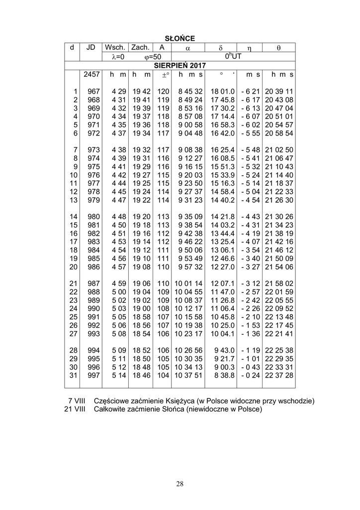 d SŁOŃCE JD Wsch. Zach. A α λ=0 ϕ=50 SIERPIEŃ 2017 2457 h m h m ±° h m s δ η θ h 0 UT ° ‘ m s h m s 1 2 3 4 5 6 967 968 969 970 971 972 4 29 4 31 4 32 4 34 4 35 4 37 19 42 19 41 19 39 19 37 19 36 19 34 120 119 119 118 118 117 8 45 32 8 49 24 8 53 16 8 57 08 9 00 58 9 04 48 18 01.0 17 45.8 17 30.2 17 14.4 16 58.3 16 42.0 - 6 21 - 6 17 - 6 13 - 6 07 - 6 02 - 5 55 20 39 11 20 43 08 20 47 04 20 51 01 20 54 57 20 58 54 7 8 9 10 11 12 13 973 974 975 976 977 978 979 4 38 4 39 4 41 4 42 4 44 4 45 4 47 19 32 19 31 19 29 19 27 19 25 19 24 19 22 117 116 116 115 115 114 114 9 08 38 9 12 27 9 16 15 9 20 03 9 23 50 9 27 37 9 31 23 16 25.4 16 08.5 15 51.3 15 33.9 15 16.3 14 58.4 14 40.2 - 5 48 - 5 41 - 5 32 - 5 24 - 5 14 - 5 04 - 4 54 21 02 50 21 06 47 21 10 43 21 14 40 21 18 37 21 22 33 21 26 30 14 15 16 17 18 19 20 980 981 982 983 984 985 986 4 48 4 50 4 51 4 53 4 54 4 56 4 57 19 20 19 18 19 16 19 14 19 12 19 10 19 08 113 113 112 112 111 111 110 9 35 09 9 38 54 9 42 38 9 46 22 9 50 06 9 53 49 9 57 32 14 21.8 14 03.2 13 44.4 13 25.4 13 06.1 12 46.6 12 27.0 - 4 43 - 4 31 - 4 19 - 4 07 - 3 54 - 3 40 - 3 27 21 30 26 21 34 23 21 38 19 21 42 16 21 46 12 21 50 09 21 54 06 21 22 23 24 25 26 27 987 988 989 990 991 992 993 4 59 5 00 5 02 5 03 5 05 5 06 5 08 19 06 19 04 19 02 19 00 18 58 18 56 18 54 110 109 109 108 107 107 106 10 01 14 10 04 55 10 08 37 10 12 17 10 15 58 10 19 38 10 23 17 12 07.1 11 47.0 11 26.8 11 06.4 10 45.8 10 25.0 10 04.1 - 3 12 - 2 57 - 2 42 - 2 26 - 2 10 - 1 53 - 1 36 21 58 02 22 01 59 22 05 55 22 09 52 22 13 48 22 17 45 22 21 41 28 29 30 31 994 995 996 997 5 09 5 11 5 12 5 14 18 52 18 50 18 48 18 46 106 105 105 104 10 26 56 10 30 35 10 34 13 10 37 51 9 43.0 9 21.7 9 00.3 8 38.8 - 1 19 - 1 01 - 0 43 - 0 24 22 25 38 22 29 35 22 33 31 22 37 28 7 VIII 21 VIII Częściowe zaćmienie Księżyca (w Polsce widoczne przy wschodzie) Całkowite zaćmienie Słońca (niewidoczne w Polsce) 28