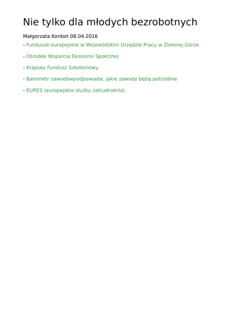 Nie tylko dla młodych bezrobotnych Małgorzata Kordoń 08.04.2016 - Fundusze europejskie w Wojewódzkim Urzędzie Pracy w Zielonej Górze - Ośrodek Wsparcia Ekonomii Społcznej - Krajowy Fundusz Szkoleniowy - Barometr zawodówpodpowiada, jakie zawody będą potrzebne - EURES (europejskie służby zatrudnienia)