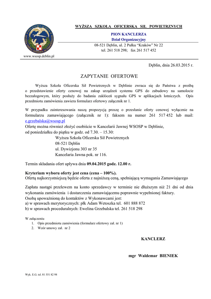 WYŻSZA SZKOŁA OFICERSKA SIŁ POWIETRZNYCH PION KANCLERZA Dział Organizacyjny 08-521 Dęblin, ul. 2 Pułku “Kraków” Nr 22 tel. 261 518 298; fax 261 517 452 www.wsosp.deblin.pl Dęblin, dnia 26.03.2015 r. ZAPYTANIE OFERTOWE Wyższa Szkoła Oficerska Sił Powietrznych w Dęblinie zwraca się do Państwa z prośbą o przedstawienie oferty cenowej na zakup urządzeń systemu GPS do zabudowy na samolocie bezzałogowym, który posłuży do badania zakłóceń sygnału GPS w aplikacjach lotniczych. Opis przedmiotu zamówienia zawiera formularz ofertowy załącznik nr 1. W przypadku zainteresowania naszą propozycją proszę o przesłanie oferty cenowej wyłącznie na formularzu zamawiającego (załącznik nr 1): faksem na numer 261 517 452 lub mail: [email protected] Ofertę można również złożyć osobiście w Kancelarii Jawnej WSOSP w Dęblinie, od poniedziałku do piątku w godz. od 7.30. – 15.30: Wyższa Szkoła Oficerska Sił Powietrznych 08-521 Dęblin ul. Dywizjonu 303 nr 35 Kancelaria Jawna pok. nr 116. Termin składania ofert upływa dnia 09.04.2015 godz. 12.00 r. Kryterium wyboru oferty jest cena (cena – 100%). Ofertą najkorzystniejszą będzie oferta z najniższą ceną, spełniającą wymagania Zamawiającego Zapłata nastąpi przelewem na konto sprzedawcy w terminie nie dłuższym niż 21 dni od dnia wykonania zamówienia i dostarczenia zamawiającemu poprawnie wypełnionej faktury. Osobą upoważnioną do kontaktów z Wykonawcami jest: a) w sprawach merytorycznych: płk Adam Wetoszka tel. 601 888 872 b) w sprawach proceduralnych: Ewelina Grzebalska tel. 261 518 298 W załączeniu 1. Opis przedmiotu zamówienia (formularz ofertowy zał. nr 1) 2. Wzór umowy zał. nr 2 KANCLERZ mgr Waldemar BIENIEK Wyk. E.G. tel. 81 551 82 98 Załącznik nr 1 OPIS PRZEDMIOTU ZAMÓWIENIA FORMULARZ OFERTOWY Przedmiotem zamówienia jest zakup urządzeń systemu GPS do zabudowy na samolocie bezzałogowym, który posłuży do badania zakłóceń sygnału GPS w aplikacjach lotniczych. Wymagania jakościowe: wyposażenie powinno odpowiadać ogólnym normom jakościowym przyjętym w przemyśle elektronicznym Wymagania techniczne: wyposażenie elektroniczne powinno posiadać gwarancje i możliwość serwisowania Nazwa szt FLEX6-G2S-00G-TTN, odbiornik GNSS NovAtel FlexPak 6 AL1GN: Master. GPS, L1,L2 SBAS, DGPS, GL1DE, 20 Hz, Raw Data 42G1215A-XT-1-3-Cert, antena aktywna antena L1/L2/L-Band GPS, Arinc 734, 40 dB, TNC, biała, TSO-C144 (możliwość certyfikacji FAA) GPSPL-NTRIP-MODEM, zestaw modemu NTRIP z automatyką połączenia do ASG-Eupos. Okablowanie do FlexPak6 LOGER-16-GB, Rejestrator 16 GB do danych raw z kablem RS-232 Wartość netto ogółem zamówienia VAT % Wartość brutto ogółem zamówienia 1 1 1 1 Razem Termin realizacji zamówienia: 2 tygodnie od dnia podpisania umowy. Zobowiązuję się wykonać usługę zgodnie z umową i formularzem ofertowym. Dostawa jednorazowa do magazynu WSOSP Pozostałe wymagania zawarte w umowie. Dane dotyczące Wykonawcy: Nazwa Firmy…....................................................................................................................... Siedziba…...................................................................................................................... Nr telefonu:….................................. NIP:…......................................................REGON………………………… Oświadczam, że wymagania dot. Wykonawcy określone w formularzu ofertowym oraz w postanowieniach umowy akceptuję bez zastrzeżeń i w razie wybrania mojej oferty zobowiązuję się do jej podpisania. ……………………………….…… Miejscowość , data …………………………….. podpis/pieczęć Wykonawcy
