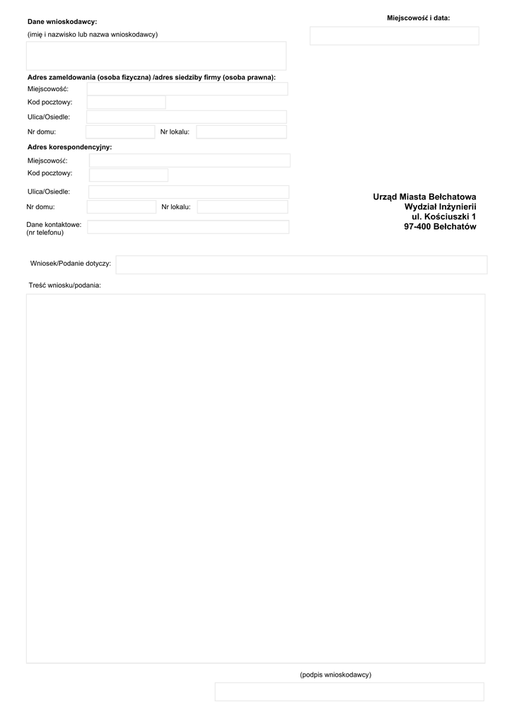 Miejscowość i data: Dane wnioskodawcy: (imię i nazwisko lub nazwa wnioskodawcy) Adres zameldowania (osoba fizyczna) /adres siedziby firmy (osoba prawna): Miejscowość: Kod pocztowy: Ulica/Osiedle: Nr domu: Nr lokalu: Adres korespondencyjny: Miejscowość: Kod pocztowy: Ulica/Osiedle: Nr domu: Urząd Miasta Bełchatowa Wydział Inżynierii ul. Kościuszki 1 97-400 Bełchatów Nr lokalu: Dane kontaktowe: (nr telefonu) Wniosek/Podanie dotyczy: Treść wniosku/podania: (podpis wnioskodawcy)