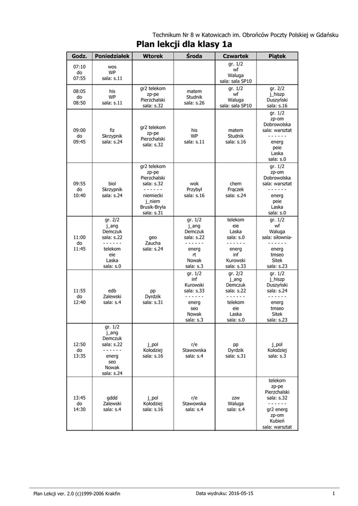 Plan lekcji dla klasy 1a - Witaj na stonie Technikum nr 8 w Katowicach