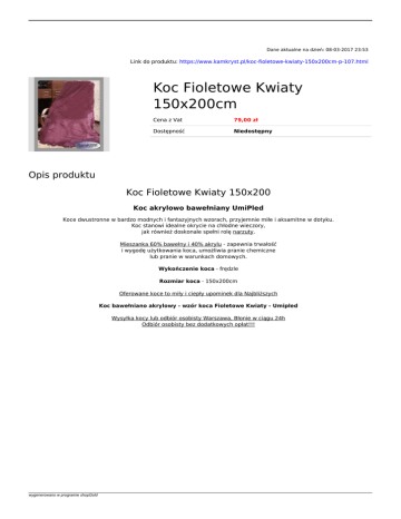 Dane aktualne na dzień: 08-03-2017 23:53 Link do produktu: https://www.kamkryst.pl/koc-fioletowe-kwiaty-150x200cm-p-107.html Koc Fioletowe Kwiaty 150x200cm Cena z Vat 79,00 zł Dostępność Niedostępny Opis produktu Koc Fioletowe Kwiaty 150x200 Koc akrylowo bawełniany UmiPled Koce dwustronne w bardzo modnych i fantazyjnych wzorach, przyjemnie miłe i aksamitne w dotyku. Koc stanowi idealne okrycie na chłodne wieczory, jak również doskonale spełni rolę narzuty. Mieszanka 60% bawełny i 40% akrylu - zapewnia trwałość i wygodę użytkowania koca, umożliwia pranie chemiczne lub pranie w warunkach domowych. Wykończenie koca - frędzle Rozmiar koca - 150x200cm Oferowane koce to miły i ciepły upominek dla Najbliższych Koc bawełniano akrylowy - wzór koca Fioletowe Kwiaty - Umipled Wysyłka kocy lub odbiór osobisty Warszawa, Błonie w ciągu 24h Odbiór osobisty bez dodatkowych opłat!!! wygenerowano w programie shopGold Powered by TCPDF (www.tcpdf.org)