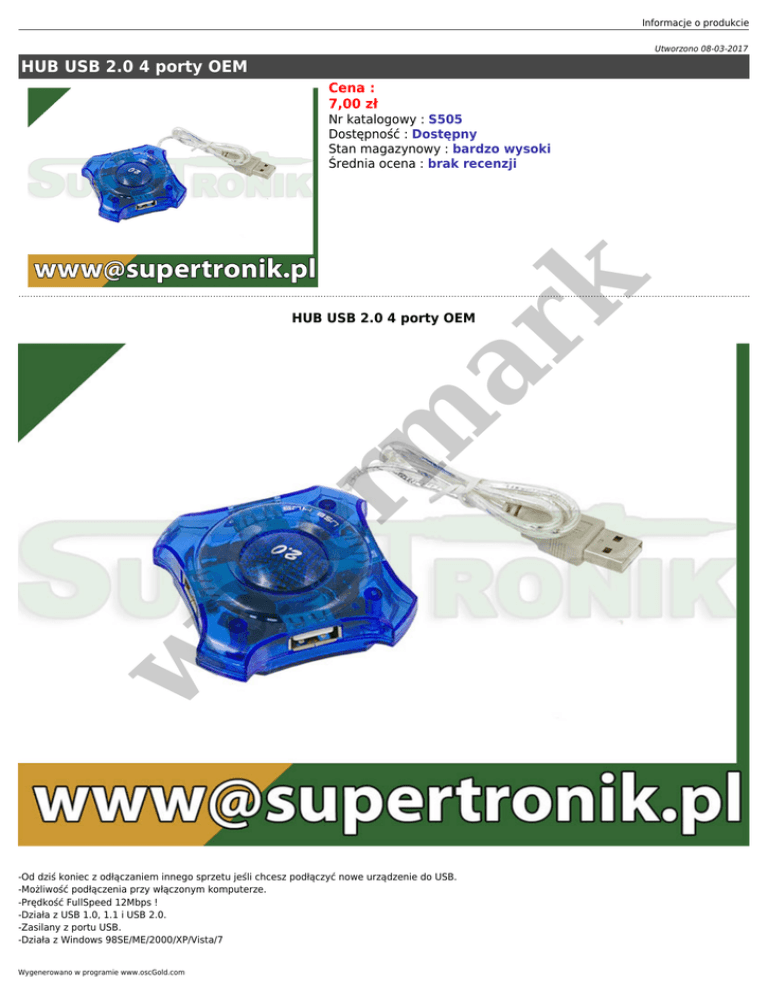 Informacje o produkcie Utworzono 08-03-2017 HUB USB 2.0 4 porty OEM Cena : 7,00 zł er m ar k Nr katalogowy : S505 Dostępność : Dostępny Stan magazynowy : bardzo wysoki Średnia ocena : brak recenzji w at HUB USB 2.0 4 porty OEM -Od dziś koniec z odłączaniem innego sprzetu jeśli chcesz podłączyć nowe urządzenie do USB. -Możliwość podłączenia przy włączonym komputerze. -Prędkość FullSpeed 12Mbps ! -Działa z USB 1.0, 1.1 i USB 2.0. -Zasilany z portu USB. -Działa z Windows 98SE/ME/2000/XP/Vista/7 Wygenerowano w programie www.oscGold.com er m ar k at w