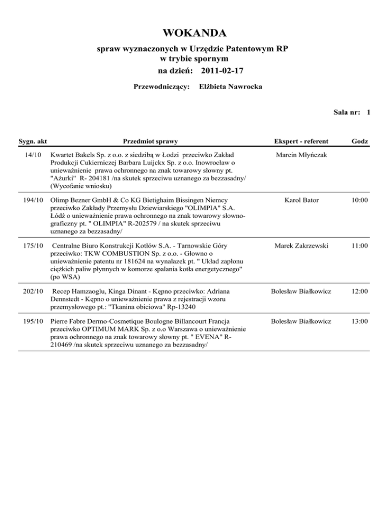 WOKANDA spraw wyznaczonych w Urzędzie Patentowym RP w trybie spornym na dzień: 2011-02-17 Przewodniczący: Elżbieta Nawrocka Sala nr: 1 Sygn. akt Przedmiot sprawy Ekspert - referent Godz 14/10 Kwartet Bakels Sp. z o.o. z siedzibą w Łodzi przeciwko Zakład Produkcji Cukierniczej Barbara Luijckx Sp. z o.o. Inowrocław o unieważnienie prawa ochronnego na znak towarowy słowny pt. "Ażurki" R- 204181 /na skutek sprzeciwu uznanego za bezzasadny/ (Wycofanie wniosku) Marcin Młyńczak 194/10 Olimp Bezner GmbH & Co KG Bietighaim Bissingen Niemcy przeciwko Zakłady Przemysłu Dziewiarskiego "OLIMPIA" S.A. Łódź o unieważnienie prawa ochronnego na znak towarowy słownograficzny pt. " OLIMPIA" R-202579 / na skutek sprzeciwu uznanego za bezzasadny/ Karol Bator 10:00 175/10 Centralne Biuro Konstrukcji Kotłów S.A. - Tarnowskie Góry przeciwko: TKW COMBUSTION Sp. z o.o. - Głowno o unieważnienie patentu nr 181624 na wynalazek pt. " Układ zapłonu ciężkich paliw płynnych w komorze spalania kotła energetycznego" (po WSA) Marek Zakrzewski 11:00 202/10 Recep Hamzaoglu, Kinga Dinant - Kępno przeciwko: Adriana Dennstedt - Kępno o unieważnienie prawa z rejestracji wzoru przemysłowego pt.: "Tkanina obiciowa" Rp-13240 Bolesław Białkowicz 12:00 195/10 Pierre Fabre Dermo-Cosmetique Boulogne Billancourt Francja przeciwko OPTIMUM MARK Sp. z o.o Warszawa o unieważnienie prawa ochronnego na znak towarowy słowny pt. " EVENA" R210469 /na skutek sprzeciwu uznanego za bezzasadny/ Bolesław Białkowicz 13:00