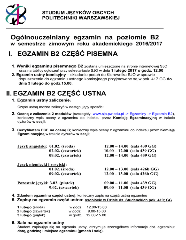 STUDIUM JĘZYKÓW OBCYCH POLITECHNIKI WARSZAWSKIEJ ____________________________________________________________________________________ Ogólnouczelniany egzamin na poziomie B2 w semestrze zimowym roku akademickiego 2016/2017 I. EGZAMIN B2 CZĘŚĆ PISEMNA 1. Wyniki egzaminu pisemnego B2 zostaną umieszczone na stronie internetowej SJO oraz na tablicy ogłoszeń przy sekretariacie SJO w dniu 1 lutego 2017 o godz. 12.00 2. Egzamin ustny komisyjny – składanie podań do Kierownika SJO w sprawie dopuszczenia do egzaminu ustnego komisyjnego przyjmowane są w pok. 417 GG do dnia 3 lutego do godz.15.00. II. EGZAMIN B2 CZĘŚĆ USTNA 1. Egzamin ustny zaliczenie: Część ustną można zaliczyć w następujący sposób: 2. Oceną z zaliczenia 2 modułów (szczegóły: www.sjo.pw.edu.pl -> Egzaminy -> Egzamin B2), konieczny wpis oceny z egzaminu do indeksu przez Komisję Egzaminacyjną w trakcie dyżurów w sesji; 3. Certyfikatem FCE na ocenę C; konieczny wpis oceny z egzaminu do indeksu przez Komisję Egzaminacyjną w trakcie dyżurów w sesji; Język angielski: 01.02. (środa) 02.02. (czwartek) 09.02. (czwartek) 12.00 – 14.00 (sala 439 GG) 10.00 – 12.00 (sala 439 GG) 12.00 – 14.00 (sala 439 GG) Język niemiecki i rosyjski: 01.02. (środa) 09.02. (czwartek) 12.00 – 13.00 (sala 426b GG) 12.00 – 13.00 (sala 426b GG) Pozostałe języki: 3.02. (piątek) 9.02. (czwartek) 09.00 – 11.00 (sala 439 GG) 09.00 – 11.00 (sala 439 GG) 4. Zdaniem egzaminu części ustnej; konieczny zapis na część ustną egzaminu 5. Zapisy na egzamin część ustna: osobiście w Dziale ds. Studenckich pok. 419; GG 1 lutego (środa) 2 lutego (czwartek) 3 lutego (piątek) w godz. w godz. w godz. 12.00-15.00 9.00-15.00 12.00-15.00 6. Sale na egzamin ustny Student zapisując się na egzamin ustny, otrzymuje szczegółowe informacje dot. egzaminu: datę, godzinę i miejsce egzaminu (gmach i salę). STUDIUM JĘZYKÓW OBCYCH POLITECHNIKI WARSZAWSKIEJ ____________________________________________________________________________________ 7. Egzaminy ustne odbędą się w dniach: 6 lutego (poniedziałek) 7 lutego (wtorek) 8 lutego (środa) w godzinach w godzinach w godzinach 9.00 – 16.00 9.00 – 16.00 9.00 – 12.00 8. Egzaminy ustny Komisyjny odbędzie się w dniu: 8 lutego (środa) w godzinach 12.00 – 16.00 Na egzamin ustny student zgłasza się z indeksem. 9. WAŻNE: Zaliczeniem egzaminu B2 jest jego wpis do indeksu. Na egzamin ustny student zgłasza się z indeksem lub, jeżeli na danym wydziale indeksy nie obowiązują - z dwoma dokumentami tożsamości z wyraźnym zdjęciem oraz z „Kartą zaliczeń studenta – języki obce”. Jest ona dostępna na stronie www.sjo.pw.edu.pl Studenci przystępujący do egzaminu B2 części ustnej wpis do indeksu otrzymują podczas egzaminu. Studenci zaliczający część ustną egzaminu na podstawie certyfikatu lub oceny z zajęć muszą uzyskać wpis do indeksu od Komisji Egzaminacyjnej w trakcie dyżurów w sesji. III. Kolejny Egzamin B2 odbędzie się dniu 19.06.2017.