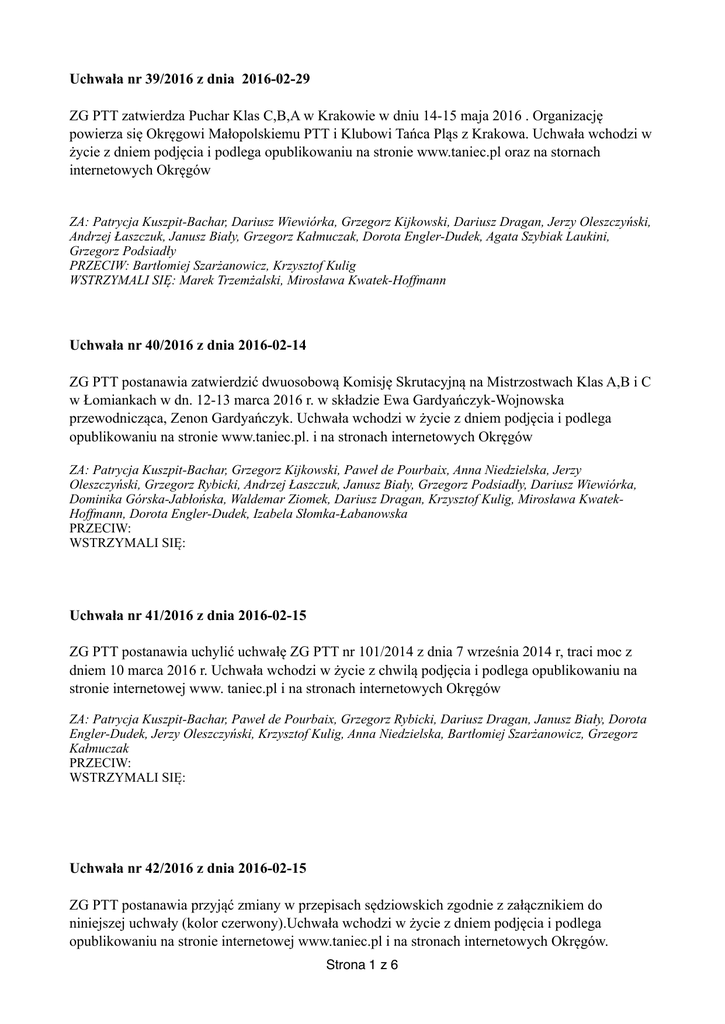 Uchwała nr 39/2016 z dnia 2016-02-29 ZG PTT zatwierdza Puchar Klas C,B,A w Krakowie w dniu 14-15 maja 2016 . Organizację powierza się Okręgowi Małopolskiemu PTT i Klubowi Tańca Pląs z Krakowa. Uchwała wchodzi w życie z dniem podjęcia i podlega opublikowaniu na stronie www.taniec.pl oraz na stornach internetowych Okręgów ZA: Patrycja Kuszpit-Bachar, Dariusz Wiewiórka, Grzegorz Kijkowski, Dariusz Dragan, Jerzy Oleszczyński, Andrzej Łaszczuk, Janusz Biały, Grzegorz Kałmuczak, Dorota Engler-Dudek, Agata Szybiak Laukini, Grzegorz Podsiadły PRZECIW: Bartłomiej Szarżanowicz, Krzysztof Kulig WSTRZYMALI SIĘ: Marek Trzemżalski, Mirosława Kwatek-Hoffmann Uchwała nr 40/2016 z dnia 2016-02-14 ZG PTT postanawia zatwierdzić dwuosobową Komisję Skrutacyjną na Mistrzostwach Klas A,B i C w Łomiankach w dn. 12-13 marca 2016 r. w składzie Ewa Gardyańczyk-Wojnowska przewodnicząca, Zenon Gardyańczyk. Uchwała wchodzi w życie z dniem podjęcia i podlega opublikowaniu na stronie www.taniec.pl. i na stronach internetowych Okręgów ZA: Patrycja Kuszpit-Bachar, Grzegorz Kijkowski, Paweł de Pourbaix, Anna Niedzielska, Jerzy Oleszczyński, Grzegorz Rybicki, Andrzej Łaszczuk, Janusz Biały, Grzegorz Podsiadły, Dariusz Wiewiórka, Dominika Górska-Jabłońska, Waldemar Ziomek, Dariusz Dragan, Krzysztof Kulig, Mirosława KwatekHoffmann, Dorota Engler-Dudek, Izabela Słomka-Łabanowska PRZECIW: WSTRZYMALI SIĘ: Uchwała nr 41/2016 z dnia 2016-02-15 ZG PTT postanawia uchylić uchwałę ZG PTT nr 101/2014 z dnia 7 września 2014 r, traci moc z dniem 10 marca 2016 r. Uchwała wchodzi w życie z chwilą podjęcia i podlega opublikowaniu na stronie internetowej www. taniec.pl i na stronach internetowych Okręgów ZA: Patrycja Kuszpit-Bachar, Paweł de Pourbaix, Grzegorz Rybicki, Dariusz Dragan, Janusz Biały, Dorota Engler-Dudek, Jerzy Oleszczyński, Krzysztof Kulig, Anna Niedzielska, Bartłomiej Szarżanowicz, Grzegorz Kałmuczak PRZECIW: WSTRZYMALI SIĘ: Uchwała nr 42/2016 z dnia 2016-02-15 ZG PTT postanawia przyjąć zmiany w przepisach sędziowskich zgodnie z załącznikiem do niniejszej uchwały (kolor czerwony).Uchwała wchodzi w życie z dniem podjęcia i podlega opublikowaniu na stronie internetowej www.taniec.pl i na stronach internetowych Okręgów. Strona 1 z 6 ZA: Patrycja Kuszpit-Bachar, Paweł de Pourbaix, Grzegorz Rybicki, Dariusz Dragan, Grzegorz Kijkowski, Janusz Biały, Dorota Engler-Dudek, Izabela Słomka-Łabanowska, Jerzy Oleszczyński, Anna Niedzielska, Krzysztof Kulig, Grzegorz Podsiadły, Bartłomiej Szarżanowicz, Grzegorz Kałmuczak PRZECIW: WSTRZYMALI SIĘ: Uchwała nr 43/2016 z dnia 2016-02-16 ZG PTT zatwierdza poprawki do Przepisów STT PTT zgodnie z załącznikami do niniejszej uchwały. Uchwała wchodzi w życie z chwilą podjęcia i podlega opublikowaniu na stronie internetowej www.taniec.pl i na stronach internetowych Okręgów ZA: Krzysztof Kulig, Bartłomiej Szarżanowicz, Grzegorz Kałmuczak, Paweł de Pourbaix, Grzegorz Podsiadły, Andrzej Łaszczuk, Anna Niedzielska, Waldemar Ziomek, Dominika Górska-Jabłońska PRZECIW: Jerzy Oleszczyński, Grzegorz Kijkowski WSTRZYMALI SIĘ: Agata Szybiak Laukini Uchwała nr 44/2016 z dnia 2016-02-16 ZG PTT postanawia uhonorować przeklasyfikowaniem sześć pierwszych par z końcowej klasyfikacji Rankingu PTT za rok 2016. Jednocześnie ZG PTT postanawia, że przeklasyfikowanie dotyczy wszystkich kategorii w/w Rankingu. Uchwała wchodzi w życie z chwilą podjęcia i podlega opublikowaniu na stronie internetowej www.taniec.pl i na stronach internetowych Okręgów ZA: Jerzy Oleszczyński, Anna Niedzielska, Krzysztof Kulig, Dariusz Dragan, Grzegorz Podsiadły, Bartłomiej Szarżanowicz, Grzegorz Kałmuczak, Paweł de Pourbaix, Dariusz Wiewiórka, Andrzej Łaszczuk, Grzegorz Rybicki, Waldemar Ziomek, Dominika Górska-Jabłońska, Marek Trzemżalski, Agata Szybiak Laukini PRZECIW: WSTRZYMALI SIĘ: Uchwała nr 45/2016 z dnia 2016-02-22 ZG PTT odwołuje z dniem 01 marca 2016 p. Mariusza Grzejszczaka z funkcji członka Komisji ds. Mistrzostw Polski a w jego miejsce powołuje na członka Komisji ds. MP p. Konrada Buczmę. Uchwała wchodzi w życie z dniem podjęci i podlega opublikowaniu na stronie internetowej www.taniec.pl oraz na stronach internetowych Okręgów ZA: Patrycja Kuszpit-Bachar, Dariusz Wiewiórka, Paweł de Pourbaix, Dariusz Dragan, Agata Szybiak Laukini, Anna Niedzielska, Jerzy Oleszczyński, Grzegorz Podsiadły, Dorota Engler-Dudek, Izabela SłomkaStrona 2 z 6 Łabanowska, Mirosława Kwatek-Hoffmann, Dominika Górska-Jabłońska, Bartłomiej Szarżanowicz, Janusz Biały PRZECIW: WSTRZYMALI SIĘ: Grzegorz Rybicki Uchwała nr 46/2016 z dnia 2016-02-22 ZG PTT zatwierdza Komisję Skrutacyjną na Akademickich Mistrzostwach Poslki PTT w składzie: Mieczysław Kowalski, Zbigniew Wrzyszcz. Uchwała wchodzi w życie z dniem podjęcia i podlega opublikowaniu na stronie internetowej www.taniec.pl oraz na stronach internetowych Okręgów. ZA: Patrycja Kuszpit-Bachar, Dariusz Wiewiórka, Paweł de Pourbaix, Dariusz Dragan, Agata Szybiak Laukini, Grzegorz Rybicki, Anna Niedzielska, Jerzy Oleszczyński, Krzysztof Kulig, Grzegorz Podsiadły, Dorota Engler-Dudek, Izabela Słomka-Łabanowska, Mirosława Kwatek-Hoffmann, Dominika GórskaJabłońska, Bartłomiej Szarżanowicz, Janusz Biały PRZECIW: WSTRZYMALI SIĘ: Uchwała nr 47/2016 z dnia 2016-02-25 ZG PTT postanawia przyjąć regulamin Polish Cup 2016 zgodnie z załącznikiem do niniejszej uchwały. Uchwała wchodzi w życie z chwilą podjęcia i podlega opublikowaniu na stronie internetowej www.taniec.pl oraz na stronach internetowych Okręgów. ZA: Patrycja Kuszpit-Bachar, Paweł de Pourbaix, Grzegorz Rybicki, Jerzy Oleszczyński, Dariusz Dragan, Anna Niedzielska, Dorota Engler-Dudek, Izabela Słomka-Łabanowska, Dariusz Wiewiórka, Grzegorz Kijkowski, Agata Szybiak Laukini, Janusz Biały, Adam Berkowicz PRZECIW: WSTRZYMALI SIĘ: Uchwała nr 50/2016 z dnia 2016-02-29 Z