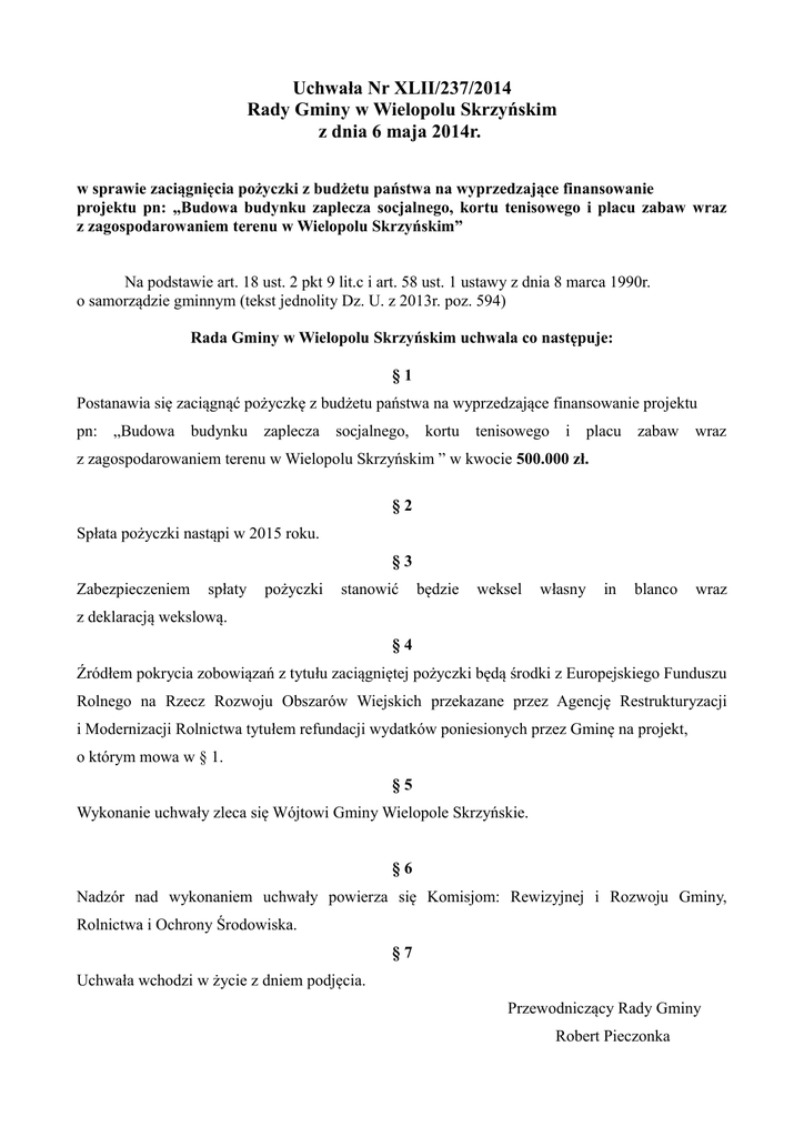 Uchwała Nr XLII/237/2014 Rady Gminy w Wielopolu Skrzyńskim z dnia 6 maja 2014r. w sprawie zaciągnięcia pożyczki z budżetu państwa na wyprzedzające finansowanie projektu pn: „Budowa budynku zaplecza socjalnego, kortu tenisowego i placu zabaw wraz z zagospodarowaniem terenu w Wielopolu Skrzyńskim” Na podstawie art. 18 ust. 2 pkt 9 lit.c i art. 58 ust. 1 ustawy z dnia 8 marca 1990r. o samorządzie gminnym (tekst jednolity Dz. U. z 2013r. poz. 594) Rada Gminy w Wielopolu Skrzyńskim uchwala co następuje: §1 Postanawia się zaciągnąć pożyczkę z budżetu państwa na wyprzedzające finansowanie projektu pn: „Budowa budynku zaplecza socjalnego, kortu tenisowego i placu zabaw wraz z zagospodarowaniem terenu w Wielopolu Skrzyńskim ” w kwocie 500.000 zł. §2 Spłata pożyczki nastąpi w 2015 roku. §3 Zabezpieczeniem spłaty pożyczki stanowić będzie weksel własny in blanco wraz z deklaracją wekslową. §4 Źródłem pokrycia zobowiązań z tytułu zaciągniętej pożyczki będą środki z Europejskiego Funduszu Rolnego na Rzecz Rozwoju Obszarów Wiejskich przekazane przez Agencję Restrukturyzacji i Modernizacji Rolnictwa tytułem refundacji wydatków poniesionych przez Gminę na projekt, o którym mowa w § 1. §5 Wykonanie uchwały zleca się Wójtowi Gminy Wielopole Skrzyńskie. §6 Nadzór nad wykonaniem uchwały powierza się Komisjom: Rewizyjnej i Rozwoju Gminy, Rolnictwa i Ochrony Środowiska. §7 Uchwała wchodzi w życie z dniem podjęcia. Przewodniczący Rady Gminy Robert Pieczonka
