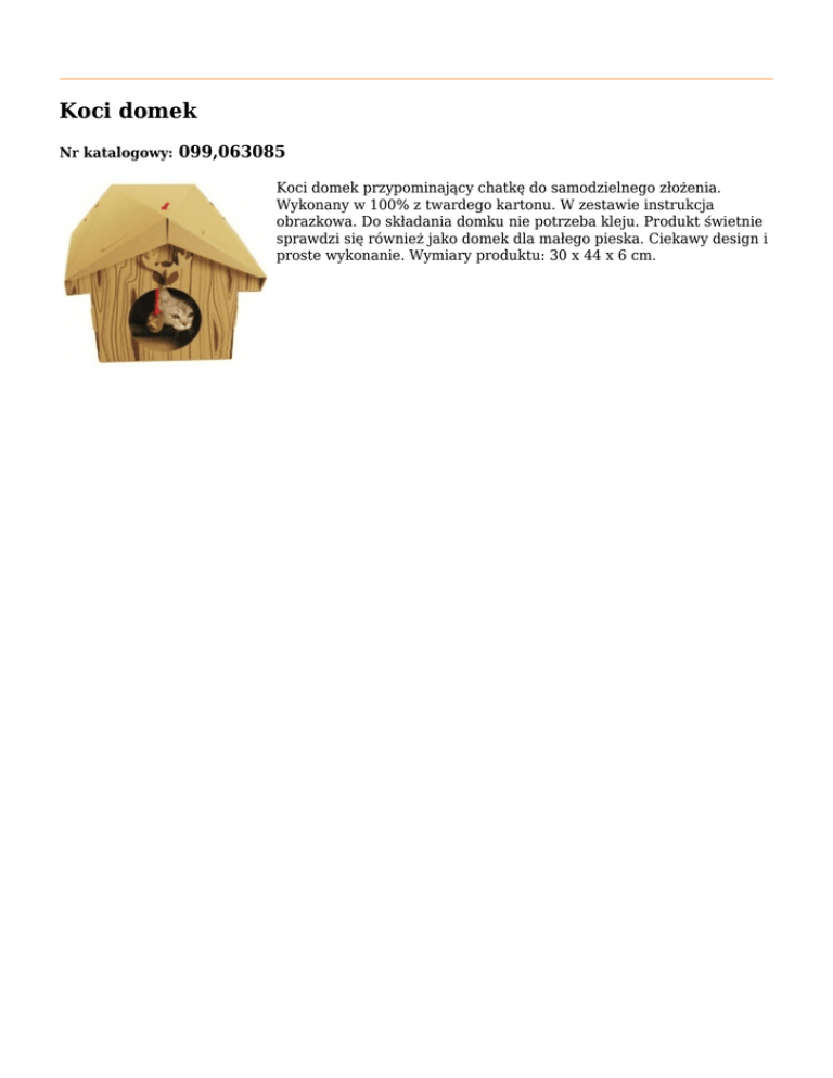 Koci domek Nr katalogowy: 099,063085 Koci domek przypominający chatkę do samodzielnego złożenia. Wykonany w 100% z twardego kartonu. W zestawie instrukcja obrazkowa. Do składania domku nie potrzeba kleju. Produkt świetnie sprawdzi się również jako domek dla małego pieska. Ciekawy design i proste wykonanie. Wymiary produktu: 30 x 44 x 6 cm.