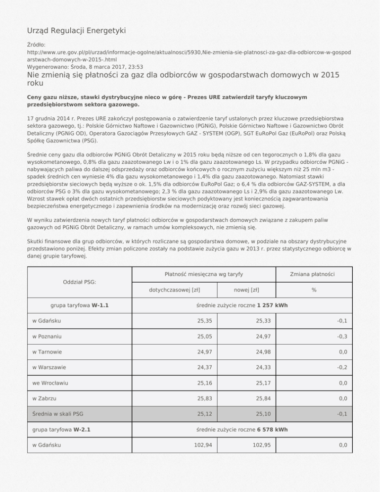 Urząd Regulacji Energetyki Źródło: http://www.ure.gov.pl/pl/urzad/informacje-ogolne/aktualnosci/5930,Nie-zmienia-sie-platnosci-za-gaz-dla-odbiorcow-w-gospod arstwach-domowych-w-2015-.html Wygenerowano: Środa, 8 marca 2017, 23:53 Nie zmienią się płatności za gaz dla odbiorców w gospodarstwach domowych w 2015 roku Ceny gazu niższe, stawki dystrybucyjne nieco w górę - Prezes URE zatwierdził taryfy kluczowym przedsiębiorstwom sektora gazowego. 17 grudnia 2014 r. Prezes URE zakończył postępowania o zatwierdzenie taryf ustalonych przez kluczowe przedsiębiorstwa sektora gazowego, tj.: Polskie Górnictwo Naftowe i Gazownictwo (PGNiG), Polskie Górnictwo Naftowe i Gazownictwo Obrót Detaliczny (PGNiG OD), Operatora Gazociągów Przesyłowych GAZ - SYSTEM (OGP), SGT EuRoPol Gaz (EuRoPol) oraz Polską Spółkę Gazownictwa (PSG). Średnie ceny gazu dla odbiorców PGNiG Obrót Detaliczny w 2015 roku będą niższe od cen tegorocznych o 1,8% dla gazu wysokometanowego, 0,8% dla gazu zaazotowanego Lw i o 1% dla gazu zaazotowanego Ls. W przypadku odbiorców PGNiG nabywających paliwa do dalszej odsprzedaży oraz odbiorców końcowych o rocznym zużyciu większym niż 25 mln m3 spadek średnich cen wyniesie 4% dla gazu wysokometanowego i 1,4% dla gazu zaazotowanego. Natomiast stawki przedsiębiorstw sieciowych będą wyższe o ok. 1,5% dla odbiorców EuRoPol Gaz; o 6,4 % dla odbiorców GAZ-SYSTEM, a dla odbiorców PSG o 3% dla gazu wysokometanowego; 2,3 % dla gazu zaazotowanego Ls i 2,9% dla gazu zaazotowanego Lw. Wzrost stawek opłat dwóch ostatnich przedsiębiorstw sieciowych podyktowany jest koniecznością zagwarantowania bezpieczeństwa energetycznego i zapewnienia środków na modernizację oraz rozwój sieci gazowej. W wyniku zatwierdzenia nowych taryf płatności odbiorców w gospodarstwach domowych związane z zakupem paliw gazowych od PGNiG Obrót Detaliczny, w ramach umów kompleksowych, nie zmienią się. Skutki finansowe dla grup odbiorców, w których rozliczane są gospodarstwa domowe, w podziale na obszary dystrybucyjne przedstawiono poniżej. Efekty zmian policzone zostały na podstawie zużycia gazu w 2013 r. przez statystycznego odbiorcę w danej grupie taryfowej. Płatność miesięczna wg taryfy Zmiana płatności Oddział PSG: dotychczasowej [zł] grupa taryfowa W-1.1 nowej [zł] % średnie zużycie roczne 1 257 kWh w Gdańsku 25,35 25,33 -0,1 w Poznaniu 25,05 24,97 -0,3 w Tarnowie 24,97 24,98 0,0 w Warszawie 24,37 24,33 -0,2 we Wrocławiu 25,16 25,17 0,0 w Zabrzu 25,83 25,84 0,0 Średnia w skali PSG 25,12 25,10 -0,1 grupa taryfowa W-2.1 średnie zużycie roczne 6 578 kWh w Gdańsku 102,94 102,95 0,0 w Poznaniu 99,43 98,98 -0,5 w Tarnowie 100,06 100,02 0,0 w Warszawie 96,78 96,52 -0,3 we Wrocławiu 100,46 100,35 -0,1 w Zabrzu 102,67 102,61 -0,1 Średnia w skali PSG 100,39 100,24 -0,2 grupa taryfowa W-3.6 średnie zużycie roczne 24 783 kWh w Gdańsku 356,79 356,43 -0,1 w Poznaniu 352,20 350,38 -0,5 w Tarnowie 342,84 341,98 -0,3 w Warszawie 339,47 338,33 -0,3 we Wrocławiu 352,55 351,79 -0,2 w Zabrzu 352,55 351,68 -0,2 Średnia w skali PSG 349,40 348,43 -0,3 Taryfa PGNiG mająca zastosowanie do przedsiębiorstw nabywających paliwa do dalszej odsprzedaży oraz odbiorców końcowych o rocznym zużyciu przekraczającym 25 mln m3 będzie obowiązywała przez 4 miesiące, tj. do końca kwietnia 2015 roku. Pozostałe taryfy zatwierdzone zostały na okres do 31 grudnia 2015 r. Decyzje zatwierdzające taryfy opublikowane zostały w Biuletynach Branżowych URE - Paliwa gazowe z dnia 17 grudnia 2014 r. i są dostępne w Biuletynie Informacji Publicznej Urzędu. Data publikacji 17.12.2014 Tagi: ceny gazu