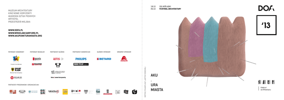 Muzeum Architektury Kino Nowe Horyzonty Akademia Sztuk Pieknych ArtHotel Przestrzeń miejska www.dofa.pl www.wroclaw.sarp.org.pl www.akupunkturamiasta.org Patronat medialny Partnerzy programowi i organizacyjni Partnerzy gŁówni Partnerzy komercyjni GŁÓWNY sponsor srebrny sponsor MOTYW Z plakatu aut. Justyny osieckiej Patronat honorowy Szanowni Państwo, Już trzeci raz pozwalam sobie jak najserdeczniej zaprosić Państwa do udziału w kolejnej edycji Dolnośląskiego Festiwalu Architektury, który odbędzie sie w dniach od 18-26 października bieżącego roku. W tym roku zapraszam wyjątkowo gorąco na wydarzenia organizowane wspólnie z firmą AMS S.A – Dyskusję pokonkursową na temat koncepcji rozwiązania placu Piłsudskiego, Seminarium SELFMADE CITY z udziałem Kristien Ring, (AA Projects, Berlin) oraz Debatę pn. MOJE MIASTO. W załączeniu tego zaproszenia można znaleźć informacje o programie Festiwalu z jego licznymi aktywnościami, w tym wystawami konkursowymi, wycieczkami tematycznymi oraz wernisażem i finisażem połączonym z wręczeniem nagród laureatom konkursów zorganizowanych w ramach Festiwalu. Szczegółowe informacje o Dolnośląskim Festiwalu Architektury DoFa’13 można znaleźć także na stronach internetowych www.dofa.pl, www.wroclaw.sarp.org.pl, kadrymodernizmu.pl, www.akupunkturamiasta.pl. Widzimy się w Muzeum Architektury, salach Kina Nowe Horyzonty, Akademii Sztuk Pięknych, na ulicy Oławskiej oraz w miejscach objętych programem Festiwalu Architektury we Wrocławiu! dr arch. Maciej Hawrylak, dyrektor generalny Dolnośląskiego Festiwalu Architektury