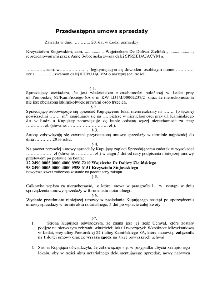 Przedwstępna umowa sprzedaży Zawarta w dniu ……….. 2016 r. w Łodzi pomiędzy : Krzysztofem Stojowskim, zam. ................, Wojciechem De Doliwa Zieliński, ....................., reprezentowanymi przez Annę Sobocińską zwaną dalej SPRZEDAJĄCYM a: …………, zam. w…………….. , legitymującym się dowodem osobistym numer ………… seria ……….. , zwanym dalej KUPUJĄCYM o następującej treści: § 1. Sprzedający oświadcza, że jest właścicielem nieruchomości położonej w Łodzi przy ul. Pomorskiej 82/Kamińskiego 8A o nr KW LD1M/00002239/2 oraz, że nieruchomość ta nie jest obciążona jakimikolwiek prawami osób trzecich. § 2. Sprzedający zobowiązuje się sprzedać Kupującemu lokal niemieszkalny nr …….. (o łącznej powierzchni …….. m2) znajdujący się na …. piętrze w nieruchomości przy ul. Kamińskiego 8A w Łodzi a Kupujący zobowiązuje się kupić opisaną wyżej nieruchomość za cenę ………… zł. (słownie: ……………………… zł.). § 3. Strony zobowiązują się zawrzeć przyrzeczoną umowę sprzedaży w terminie najpóźniej do dnia …………2016 roku. § 4. Na poczet przyszłej umowy sprzedaży Kupujący zapłaci Sprzedającemu zadatek w wysokości ……………… zł (słownie: ………… zł.) w ciągu 5 dni od daty podpisania niniejszej umowy przelewem po połowie na konta: 32 2490 0005 0000 4000 8958 7210 Wojciecha De Doliwy Zielińskiego 98 2490 0005 0000 4000 9558 6151 Krzysztofa Stojowskiego Powyższa kwota zaliczona zostanie na poczet ceny zakupu. § 5. Całkowita zapłata za nieruchomość, o której mowa w paragrafie 1. w nastąpi w dniu sporządzenia umowy sprzedaży w formie aktu notarialnego. § 6. Wydanie przedmiotu niniejszej umowy w posiadanie Kupującego nastąpi po sporządzeniu umowy sprzedaży w formie aktu notarialnego, 3 dni po wpłacie całej kwoty 1. §7. Strona Kupująca oświadczyła, że znana jest jej treść Uchwał, które zostały podjęte na pierwszym zebraniu właścicieli lokali tworzących Wspólnotę Mieszkaniową w Łodzi, przy ulicy Pomorskiej 82 i ulicy Kamińskiego 8A, które stanowią załącznik nr 1 do tej umowy oraz że wyraża zgodę na treść powyższych uchwał . 2. Strona Kupująca oświadczyła, że zobowiązuje się, w przypadku zbycia zakupionego lokalu, aby w treści aktu notarialnego dokumentującego sprzedaż, nowy nabywca złożył oświadczenie, że akceptuje uchwały podjęte na pierwszym zebraniu Wspólnoty Mieszkaniowej oraz, że zobowiązuje się nie zaskarżać żadnej podjętej na tym zebraniu uchwały do sądu a także nie podejmować żadnych czynności, które utrudniałyby w jakikolwiek sposób uzyskanie koniecznych decyzji do prowadzenia nadbudowy, przebudowy i budowy nowych mieszkań w nieruchomości. Kupujący oświadcza również, że upoważnia Pana Wojciecha De Doliwę Zielińskiego oraz Krzysztofa Stojowskiego lub wskazanego przez Nich pełnomocnika do dokonania czynności prawnej polegającej na zmianie wysokości udziałów w nieruchomości wspólnej związanych z poszczególnymi lokalami znajdującymi się w budynku nr 82 przy ul. Pomorskiej w Łodzi oraz w budynku nr 8A przy ul. Kamińskiego w Łodzi w następstwie powstania odrębnej własności lokalu lub lokali nadbudowanych lub przebudowanych, z tym, że wszelkie koszty z tym związane ponoszone będą wyłącznie przez Sprzedającego. W związku z tą przebudową Kupujący udziela jednocześnie pełnomocnictwa Panu Wojciechowi De Doliwa Zielińskiemu i Panu Krzysztofowi Stojowskiemu do dokonania w jej imieniu wszelkich czynności z tym związanych, w tym podpisania aktu notarialnego zmieniającego wysokość udziałów poszczególnych lokali w nieruchomości wspólnej wynikającej z dokonanej przebudowy i jednocześnie ustanawia Pana Wojciechowa De Doliwa Zielińskiego i Pana Krzysztofa Stojowskiego także pełnomocnikiem do odbioru wszelkiej korespondencji związanej z tą przebudową. Kupujący wyrażają zgodę na wykonanie przez Sprzedającą prac remontowo – budowlanych na Nieruchomości, a także wyrażają zgodę na ewentualną przebudowę i podział lokali Sprzedającej, a w związku z tym wyrażają zgodę na zmianę udziałów w nieruchomości wspólnej. 3. Kupujący udzielają pełnomocnictwa Sprzedającej i upoważniają ją do: - dokonywania wszelkich czynności mających za przedmiot przebudowę lokali będących własnością Sprzedającej ,zmiany udziałów w nieruchomości wspólnej, - reprezentowania na wszelkich zebraniach Wspólnoty Mieszkaniowej w sprawach przebudowy, podziału lokali, zmiany udziałów w nieruchomości wspólnej, a w związku z tym udzielenia pełnomocnictwa dla Zarządu Wspólnoty do zmiany udziałów w nieruchomości wspólnej, - uzyskania pozwolenia na przebudowę, - składania wszelkich oświadczeń, wniosków, pism i podań a nadto do dokonywania wszystkich innych czynności jakie okażą się niezbędne w celu wykonania tego pełnomocnictwa. Pełnomocnik będzie mógł ustanawiać dla mocodawcy dalszych pełnomocników (substytucja). Pełnomocnik nie będzie mógł działać na szkodę Mocodawcy. 4. Strony zgodnie ustalają, iż w przypadku nie wyrażenia zgody przez Kupujących, lub jej cofnięcia na czynności opisane powyżej zobowiązują się oni do zapłaty na rzecz Sprzedającej kary umownej w wysokości 100.000,00 zł ( sto tysięcy złotych), w terminie 30 (trzydziestu) dni, od dnia wezwania ich do zapłaty listem poleconym na adres Sprzedającej 5. W przypadku dalszego zbycia opisanego lokalu Kupujący zobowiązują się uzyskać zgodę opisaną powyżej oraz zastrzeżenie kary umownej w wysokości 100.000,00 zł (sto tysięcy złotych) od nowego nabywcy. Nie uzyskanie takowej zgody od potencjalnego nabywcy przez Kupujących skutkować będzie zapłatą kary umownej na rzecz Sprzedającej w wysokości 100.000,00 zł (sto tysięcy złotych) w terminie 30 (trzydziestu) dni, od dnia wezwania ich do zapłaty listem 