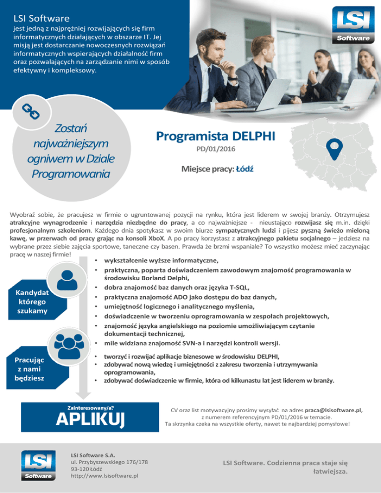 LSI Software jest jedną z najprężniej rozwijających się firm informatycznych działających w obszarze IT. Jej misją jest dostarczanie nowoczesnych rozwiązań informatycznych wspierających działalność firm oraz pozwalających na zarządzanie nimi w sposób efektywny i kompleksowy. Zostań najważniejszym ogniwem w Dziale Programowania Programista DELPHI PD/01/2016 Miejsce pracy: Łódź Wyobraź sobie, że pracujesz w firmie o ugruntowanej pozycji na rynku, która jest liderem w swojej branży. Otrzymujesz atrakcyjne wynagrodzenie i narzędzia niezbędne do pracy, a co najważniejsze - nieustająco rozwijasz się m.in. dzięki profesjonalnym szkoleniom. Każdego dnia spotykasz w swoim biurze sympatycznych ludzi i pijesz pyszną świeżo mieloną kawę, w przerwach od pracy grając na konsoli XboX. A po pracy korzystasz z atrakcyjnego pakietu socjalnego – jedziesz na wybrane przez siebie zajęcia sportowe, taneczne czy basen. Prawda że brzmi wspaniale? To wszystko możesz mieć zaczynając pracę w naszej firmie! • wykształcenie wyższe informatyczne, • praktyczna, poparta doświadczeniem zawodowym znajomość programowania w środowisku Borland Delphi, • dobra znajomość baz danych oraz języka T-SQL, Kandydat • praktyczna znajomość ADO jako dostępu do baz danych, którego • umiejętność logicznego i analitycznego myślenia, szukamy • doświadczenie w tworzeniu oprogramowania w zespołach projektowych, • znajomość języka angielskiego na poziomie umożliwiającym czytanie dokumentacji technicznej, • mile widziana znajomość SVN-a i narzędzi kontroli wersji. Pracując z nami będziesz • tworzyć i rozwijać aplikacje biznesowe w środowisku DELPHI, • zdobywać nową wiedzę i umiejętności z zakresu tworzenia i utrzymywania oprogramowania, • zdobywać doświadczenie w firmie, która od kilkunastu lat jest liderem w branży. CV oraz list motywacyjny prosimy wysyłać na adres [email protected], z numerem referencyjnym PD/01/2016 w temacie. Ta skrzynka czeka na wszystkie oferty, nawet te najbardziej pomysłowe! LSI Software S.A. ul. Przybyszewskiego 176/178 93-120 Łódź http://www.lsisoftware.pl LSI Software. Codzienna praca staje się łatwiejsza.