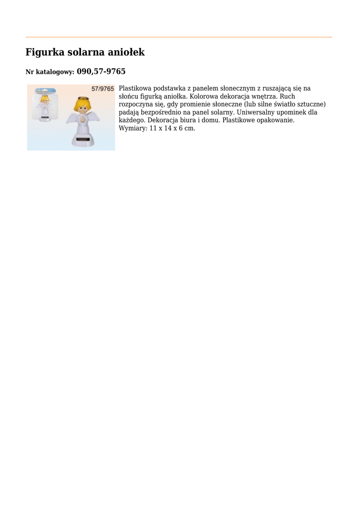 Figurka solarna aniołek Nr katalogowy: 090,57-9765 Plastikowa podstawka z panelem słonecznym z ruszającą się na słońcu figurką aniołka. Kolorowa dekoracja wnętrza. Ruch rozpoczyna się, gdy promienie słoneczne (lub silne światło sztuczne) padają bezpośrednio na panel solarny. Uniwersalny upominek dla każdego. Dekoracja biura i domu. Plastikowe opakowanie. Wymiary: 11 x 14 x 6 cm.
