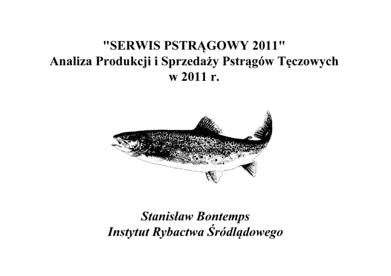 "SERWIS PSTRĄGOWY 2011" Analiza Produkcji i Sprzedaży Pstrągów Tęczowych w 2011 r. Stanisław Bontemps Instytut Rybactwa Śródlądowego 1973 1974 1975 1976 1977 1978 1979 1980 1981 1982 1983 1984 1985 1986 1987 1988 1989 1990 1991 1992 1993 1994 1995 1996 1997 1998 1999 2000 2001 2002 2003 2004 2005 2006 2007 2008 2009 2010 2011 Produkcja pstrągów tęczowych w latach 1973÷2011. [tony] 16000 14000 12000 10000 8000 6000 4000 2000 0 Franciszek Schubert Budapest String Quartet Quintet for Piano & Strings in A Major, D 667 "The Trout": 4. Theme: Andantino; Var. I-V; Allegretto Franciszek Schubert Budapest String Quartet Quintet for Piano & Strings in A Major, D 667 "The Trout": 4. Theme: Andantino; Var. I-V; Allegretto Ludwik Jerzy Kern Pstrąg pana Schuberta Ludwik Jerzy Kern Pstrąg pana Schuberta O pstrągach ostatnio mało się pisze. Mało się pisze I mało się łowi. A dawniej? Dawniej to taki Schubert Franciszek Nawet utwór muzyczny poświęcił pstrągowi. Ułożył to tak ślicznie, że aż cierpnie łuska I bardziej nas to cieszy niż pensji podwyżka – Człowiek czuje, jak pstrąg się delikatnie pluska W tym strumyku Schuberta Franciszka. A stało się to w Wiedniu, Gdy służąca Gerta Głowiąc się co tu zrobić na obiad w niedzielę, Kupiła na fischplatzu dla pana Schuberta Eine echte Forelle. Pan Schubert, kiedy pstrąga ujrzał na talerzu, (A był to pstrąg potężny, jak wiemy skadinąd) Podszedł do fortepianu, W klawisze uderzył I wtedy stał sie cud: Ten pstrąg popłynął. Talerz tylko pozostał pusty po tym pstrągu I nietknięte widelce I do sosu łyżka – A pstrąg? Pstrąg drugi wiek już pluska sobie w songu Na cześć pana Schuberta Franciszka. Dziękuję wszystkim Państwu – za współpracę, życzliwość i wiele ciepłych słów, które dopisywaliście na marginesach ankiety. Mojemu Instytutowi – za to, że do tej pory nieodmiennie wierzył, iż podołam. Wydawcom – za cierpliwość. Organizatorom Konferencji Ryb Łososiowatych – za przywilej, że przez wiele lat miałem zaszczyt wygłaszać wykład otwierający konferencje. Tym, z którymi wieloletnia przyjaźń łączy, nie tylko mnie, ale i moją rodzinę – za wsparcie. I mojej Córce dr inż. Marii Bontemps-Gracz, która od kilkunastu lat była niewidocznym redaktorem „Serwisu”. Stanisław Bontemps Dziękuję wszystkim Państwu – za współpracę, życzliwość i wiele ciepłych słów, które dopisywaliście na marginesach ankiety. Mojemu Instytutowi – za to, że do tej pory nieodmiennie wierzył, iż podołam. Wydawcom – za cierpliwość. Organizatorom Konferencji Ryb Łososiowatych – za przywilej, że przez wiele lat miałem zaszczyt wygłaszać wykład otwierający konferencje. Tym, z którymi wieloletnia przyjaźń łączy, nie tylko mnie, ale i moją rodzinę – za wsparcie. I mojej Córce dr inż. Marii Bontemps-Gracz, która od kilkunastu lat była niewidocznym redaktorem „Serwisu”. Stanisław Bontemps Projekt i wykonanie Maria M. Bontemps-Gracz
