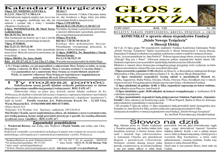 Kalendarz liturgiczny 5 lipca. XIV NIEDZIELA ZWYKŁA. Ez 2,2-5; 2 Kor 12,7-1; Mk 6,1-6 Doświadczenie napięcia między tym, na co nas stać, a co osiągamy, mobilizuje nas, aby nie ustawać i czerpać siłę z wiary i kontaktu z Bogiem w Eucharystii. 6 lipca. PONIEDZIAŁEK. Bł. Marii Teresy Ledóchowskiej. Rdz 28,10-22a; Mt 9,18-26 Moc Eucharystii nie kończy się w nas z chwilą rozesłania, ale trwa i promieniuje na innych. 7 lipca. WTOREK. Rdz 32,23-33; Mt 9,32-38 Pamiętajmy o mocy Jezusa, która przemienia nasze życie. Może nie zawsze to zauważamy, ale to się dzieje. 8 lipca. ŚRODA. Św. Jana z Dukli. Rdz 41,55-57;42,5-7.14-15a.17-24a; Mt 10,1-7 Umocnieni słowem i Ciałem Chrystusa mamy iść, aby świadczyć o Bogu, który jest dobry i nieustannie działa w naszym życiu. 9 lipca. CZWARTEK. Rdz 44,18-21.23b-29;45,1-5; Mt 10,7-15 Nie bójmy się stanąć w prawdzie przed Jezusem z naszymi słabościami i grzechami, pozwólmy, aby swoją miłością nas przemieniał. 10 lipca. PIĄTEK. Rdz 46,1-7.28-30; Mt 10,16-23 Każdego dnia podejmujemy decyzje. Potrzebujemy wewnętrznego przeczucia, że idziemy w dobrym kierunku. 11 lipca. SOBOTA. Św. Benedykta z Nursji, Patrona Europy. Prz 2,1-9; Mt 19,27-29 Wszystko ma nas prowadzić do służby Bogu. A Ty i Twoja rodzina, czy już poprosiliście o odprawienie Mszy Świętej za siebie, za swoją rodzinę, o zdrowie, bł. Boże w rodzinie, Mszę w rocznicę urodzin i w rocznicę ślubu?... Czy pamiętaliście też o zamówieniu Mszy Świętej za swoich bliskich zmarłych? Wiedz, że zamówić i ofiarować Mszę Świętą jest największym i najpiękniejszym podarunkiem dla tych, których kochasz. I Ty możesz pomóc Dobroczyńcom naszej parafii składam serdeczne podziękowania za złożone ofiary i zapewniam o modlitewnej pamięci i wdzięczności. BÓG ZAPŁAĆ! Dobrowolne ofiary na prace przy kościele można składać osobiście do Ks. Proboszcza, do skarbon w kościele lub na tacę w kopercie z zapisanym imieniem i nazwiskiem ofiarodawcy ( jeżeli ofiarodawca zastrzega sobie anonimowość z dopiskiem “anonimowo”), bądź na konto: Parafia rzym.kat. p.w. Podwyższenia Krzyża Św. , 12-220 Ukta, Warm.Mazurski B.S. 15 9364 0000 4001 0001 0373 0001. Ofiary złożyli: 0 zł Wpłynęło - 0 zł. Wydano - 0 zł. Stan kasy - zadłużenie 249 238.69 zł. Moi Drodzy! Każda, nawet najdrobniejsza ofiara, ale składana z serca i systematycznie, jest wielką pomocą, byśmy mogli prowadzić inwestycje w parafii. Za wszelką ofiarność, życzliwość, serce i modlitwy - BÓG ZAPŁAĆ! Bazylika Zapowiedzi zimą przedślubne 1. Wachowski Bartosz, stan wolny, zam. Wojnowo i Drężek Natalia, stan wolny, zam. Ukta, oboje par.tut. Ktokolwiek wiedziałby o przeszkodach zachodzących między tymi osobami do zawarcia związku małżeńskiego, zobowiązany jest w sumieniu do powiadomienia o tym Ks. Proboszcza. * Redakcja Biuletynu- ks. prob. Waldemar Sawicki - 507 116 545 * Tel. do organistki - 500595242 *Tel. do kancelarii parafialnej - 501 511 655 * Adres Parafii : UKTA 19. 12-220 Ruciane Nida * Adres email: [email protected] *** * Tel do ks. Henryka, emeryta pomagającego w parafii Informacje o parafii : www.parafiaukta.pl GŁOS z KRZYŻA 5 LIPCA2015 ROK VIII Nr 386 B I U L E T Y N PA R A F I I P O D W Y Ż S Z E N I A K R Z Y Ż A Ś W I Ę T E G O w U K C I E KOMUNIKAT w sprawie obozu stypendystów Fundacji „Dzieło Nowego Tysiąclecia” w Diecezji Ełckiej Od 8 do 14 lipca grupa 700 stypendystów-studentów Fundacji Konferencji Episkopatu Polski „Dzieło Nowego Tysiąclecia” będzie uczestniczyła w obozie formacyjnym w naszej diecezji. Stypendyści Fundacji to młodzież szczególnie uzdolniona z rodzin wiejskich i mniejszych miast. Są oni „żywym pomnikiem św. Jana Pawła II”. Podczas tegorocznego obozu, towarzyszy im hasło „Odwagi! Bóg jest z Wami”. Głównym miejscem pobytu stypendystów będzie miasto Ełk. Znakiem rozpoznawczym uczestników zjazdu będą charakterystyczne żółte koszulki. Młodzież w ramach obozu formacyjno-ewangelizacyjnego przygotuje wiele wydarzeń, na które zaprasza mieszkańców miasta Ełku oraz wszystkich diecezjan: - 9 lipca (czwartek) o godzinie 11:00 odbędzie się Msza św. w diecezjalnym sanktuarium Bożego Miłosierdzia w Ełku, której przewodniczyć będzie J. E. Ks. Bp Jerzy Mazur, Biskup Ełcki. - 12 lipca (niedziela) stypendyści wezmą udział w parafialnych Mszach św. w Ełku, Augustowie, Białej Piskiej, Giżycku, Olecku, Orzyszu, Piszu, Suwałkach oraz w innych miejscowościach. Przygotują oprawę liturgiczną oraz opowiedzą o działaniach Fundacji. - 12 lipca (niedziela) od godziny 16:00, w Ełku, stypendyści zapraszają na festyn rodzinny, który odbędzie się na Placu św. Jana Pawła II. - 12 lipca (niedziela) o godz. 20.00 odbędzie się koncert ewangelizacyjny w Amfiteatrze ECK z udziałem stypendystów. - 13 lipca (poniedziałek) stypendyści będą pielgrzymować Szlakiem Papieskim „Tajemnice Światła”, który zakończy się Eucharystią o godz. 17.00 na Wigrach. Będzie to Msza św. kończąca pobyt młodzieży stypendialnej w naszej diecezji. - Od czwartku 9 lipca do soboty 11 lipca stypendyści będą prowadzili Apele Jasnogórskie przy Pomniku św. Jana Pawła II w Ełku, na które serdecznie zapraszają mieszkańców Ełku. Zachęcamy do modlitwy w intencji stypendystów oraz Fundacji „Dzieło Nowego Tysiąclecia” Ks. Jan Drob Przewodniczący Zarządu Fundacji Słowo na dziś pierwiastek. Jest tak, gdyż doświadczamy ciągle Bóg, Opisane przez św. Marka wydarzenie z Nazaretu pokazuje, jak bardzo trudno było Izraelitom uwierzyć w bóstwo Jezusa, skoro znali i dotykali Jego człowieczeństwa. A tymczasem Chrystus jest prawdziwym Bogiem i prawdziwym Człowiekiem. Dzisiejsze czytania ukazują jeszcze jedną prawdę, a mianowicie tę, że również każdemu z nas jest trudno odkryć w sobie boski tego, czego doświadczał Apostoł Narodów ludzkiej