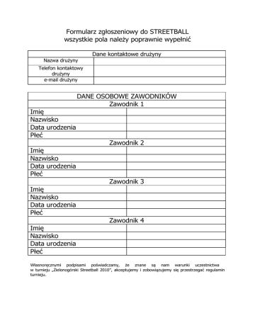 Formularz zgłoszeniowy do STREETBALL wszystkie pola należy poprawnie wypełnić Dane kontaktowe drużyny Nazwa drużyny Telefon kontaktowy drużyny e-mail drużyny DANE OSOBOWE ZAWODNIKÓW Zawodnik 1 Imię Nazwisko Data urodzenia Płeć Zawodnik 2 Imię Nazwisko Data urodzenia Płeć Zawodnik 3 Imię Nazwisko Data urodzenia Płeć Zawodnik 4 Imię Nazwisko Data urodzenia Płeć Własnoręcznymi podpisami poświadczamy, że znane są nam warunki uczestnictwa w turnieju „Zielonogórski Streetball 2010”, akceptujemy i zobowiązujemy się przestrzegać regulamin turnieju.