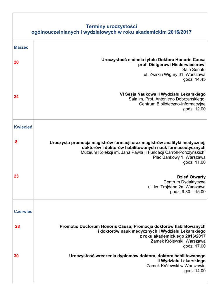Terminy uroczystości ogólnouczelnianych i wydziałowych w roku akademickim 2016/2017 Marzec 20 24 Uroczystość nadania tytułu Doktora Honoris Causa prof. Dietgerowi Niederwieserowi Sala Senatu ul. Żwirki i Wigury 61, Warszawa godz. 14.45 VI Sesja Naukowa II Wydziału Lekarskiego Sala im. Prof. Antoniego Dobrzańskiego, Centrum Biblioteczno-Informacyjne godz. 12.00 Kwiecień 8 Uroczysta promocja magistrów farmacji oraz magistrów analityki medycznej, doktorów i doktorów habilitowanych nauk farmaceutycznych Muzeum Kolekcji im. Jana Pawła II Fundacji Carroll-Porczyńskich, Plac Bankowy 1, Warszawa godz. 11.00 23 Dzień Otwarty Centrum Dydaktyczne ul. ks. Trojdena 2a, Warszawa godz. 9.30 – 15.00 Czerwiec 28 Promotio Doctorum Honoris Causa; Promocja doktorów habilitowanych i doktorów nauk medycznych I Wydziału Lekarskiego z roku akademickiego 2016/2017 Zamek Królewski, Warszawa godz. 17.00 30 Uroczystość wręczenia dyplomów doktora, doktora habilitowanego II Wydziału Lekarskiego Zamek Królewski w Warszawie godz.14.00 Lipiec 3 Uroczystość wręczenia dyplomów absolwentom Oddziału Nauczania w Języku Angielskim Aula wykładowa im. Prof. Janusza Piekarczyka, Centrum Dydaktyczne ul. ks. Trojdena 2a, Warszawa godz. 12.00 Sierpień 4 Uroczystość wręczenia dyplomów absolwentom Oddziału Fizjoterapii Aula wykładowa im. Prof. Janusza Piekarczyka, Centrum Dydaktyczne WUM ul. ks. Trojdena 2a, Warszawa godz. 12.00 Listopad 17 Uroczystość wręczenia dyplomów lekarza absolwentom II Wydziału Lekarskiego Zamek Królewski w Warszawie godz. 14.00