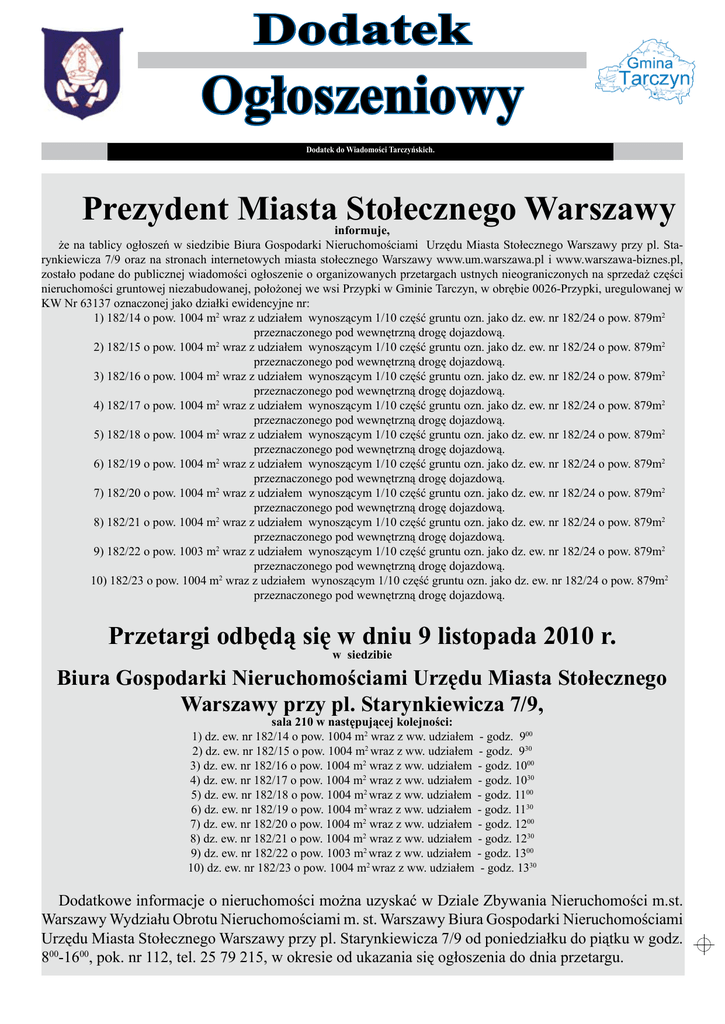 Dodatek Ogłoszeniowy Dodatek do Wiadomości Tarczyńskich. Prezydent Miasta Stołecznego Warszawy informuje, że na tablicy ogłoszeń w siedzibie Biura Gospodarki Nieruchomościami Urzędu Miasta Stołecznego Warszawy przy pl. Starynkiewicza 7/9 oraz na stronach internetowych miasta stołecznego Warszawy www.um.warszawa.pl i www.warszawa-biznes.pl, zostało podane do publicznej wiadomości ogłoszenie o organizowanych przetargach ustnych nieograniczonych na sprzedaż części nieruchomości gruntowej niezabudowanej, położonej we wsi Przypki w Gminie Tarczyn, w obrębie 0026-Przypki, uregulowanej w KW Nr 63137 oznaczonej jako działki ewidencyjne nr: 1) 182/14 o pow. 1004 m2 wraz z udziałem wynoszącym 1/10 część gruntu ozn. jako dz. ew. nr 182/24 o pow. 879m2 przeznaczonego pod wewnętrzną drogę dojazdową. 2) 182/15 o pow. 1004 m2 wraz z udziałem wynoszącym 1/10 część gruntu ozn. jako dz. ew. nr 182/24 o pow. 879m2 przeznaczonego pod wewnętrzną drogę dojazdową. 3) 182/16 o pow. 1004 m2 wraz z udziałem wynoszącym 1/10 część gruntu ozn. jako dz. ew. nr 182/24 o pow. 879m2 przeznaczonego pod wewnętrzną drogę dojazdową. 4) 182/17 o pow. 1004 m2 wraz z udziałem wynoszącym 1/10 część gruntu ozn. jako dz. ew. nr 182/24 o pow. 879m2 przeznaczonego pod wewnętrzną drogę dojazdową. 5) 182/18 o pow. 1004 m2 wraz z udziałem wynoszącym 1/10 część gruntu ozn. jako dz. ew. nr 182/24 o pow. 879m2 przeznaczonego pod wewnętrzną drogę dojazdową. 6) 182/19 o pow. 1004 m2 wraz z udziałem wynoszącym 1/10 część gruntu ozn. jako dz. ew. nr 182/24 o pow. 879m2 przeznaczonego pod wewnętrzną drogę dojazdową. 7) 182/20 o pow. 1004 m2 wraz z udziałem wynoszącym 1/10 część gruntu ozn. jako dz. ew. nr 182/24 o pow. 879m2 przeznaczonego pod wewnętrzną drogę dojazdową. 8) 182/21 o pow. 1004 m2 wraz z udziałem wynoszącym 1/10 część gruntu ozn. jako dz. ew. nr 182/24 o pow. 879m2 przeznaczonego pod wewnętrzną drogę dojazdową. 9) 182/22 o pow. 1003 m2 wraz z udziałem wynoszącym 1/10 część gruntu ozn. jako dz. ew. nr 182/24 o pow. 879m2 przeznaczonego pod wewnętrzną drogę dojazdową. 10) 182/23 o pow. 1004 m2 wraz z udziałem wynoszącym 1/10 część gruntu ozn. jako dz. ew. nr 182/24 o pow. 879m2 przeznaczonego pod wewnętrzną drogę dojazdową. Przetargi odbędą się w dniu 9 listopada 2010 r. w siedzibie Biura Gospodarki Nieruchomościami Urzędu Miasta Stołecznego Warszawy przy pl. Starynkiewicza 7/9, sala 210 w następującej kolejności: 1) dz. ew. nr 182/14 o pow. 1004 m2 wraz z ww. udziałem - godz. 900 2) dz. ew. nr 182/15 o pow. 1004 m2 wraz z ww. udziałem - godz. 930 3) dz. ew. nr 182/16 o pow. 1004 m2 wraz z ww. udziałem - godz. 1000 4) dz. ew. nr 182/17 o pow. 1004 m2 wraz z ww. udziałem - godz. 1030 5) dz. ew. nr 182/18 o pow. 1004 m2 wraz z ww. udziałem - godz. 1100 6) dz. ew. nr 182/19 o pow. 1004 m2 wraz z ww. udziałem - godz. 1130 7) dz. ew. nr 182/20 o pow. 1004 m2 wraz z ww. udziałem - godz. 1200 8) dz. ew. nr 182/21 o pow. 1004 m2 wraz z ww. udziałem - godz. 1230 9) dz. ew. nr 182/22 o pow. 1003 m2 wraz z ww. udziałem - godz. 1300 10) dz. ew. nr 182/23 o pow. 1004 m2 wraz z ww. udziałem - godz. 1330 Dodatkowe informacje o nieruchomości można uzyskać w Dziale Zbywania Nieruchomości m.st. Warszawy Wydziału Obrotu Nieruchomościami m. st. Warszawy Biura Gospodarki Nieruchomościami Urzędu Miasta Stołecznego Warszawy przy pl. Starynkiewicza 7/9 od poniedziałku do piątku w godz. 800-1600, pok. nr 112, tel. 25 79 215, w okresie od ukazania się ogłoszenia do dnia przetargu. Dodatek ogłoszeniowy BURMISTRZ Październik 2010 TAR C ZYNA OGŁASZA PIERWSZE PRZETARGI USTNE NIEOGRANICZONE NA SPRZEDAŻ NIERUCHOMOŚCI , stanowiących własność GMINY TARCZYN , woj. mazowieckie: A. Położonych we wsi Borowiec: I. działka ewidencyjna nr 60, o powierzchni 3,70 ha - księga wieczysta nr 62601 Nieruchomość jest niezabudowana , położona na obszarze oznaczonym w Miejscowym Planie Zagospodarowania Przestrzennego Gminy Tarczyn symbolem R-tereny upraw rolnych i Ls- tereny lasów i dolesień. Cena wywoławcza netto; 386 000 zł (słownie złotych: trzysta osiemdziesiąt sześć tysięcy ) Wadium 20 000 zł, ( słownie złotych : dwadzieścia tysiecy ). Przetarg odbędzie się dnia 9 listopada 2010r. o godz. 9 00 II. działka ewidencyjna nr 63, o powierzchni 1,57 ha - księga wieczysta nr 62601 Nieruchomość jest niezabudowana , położona na obszarze oznaczonym w Miejscowym Planie Zagospodarowania Przestrzennego Gminy Tarczyn symbolem R-tereny upraw rolnych i Ls- tereny lasów i dolesień. Cena wywoławcza netto 131 000 zł (słownie złotych: sto trzydzieści jeden tysięcy) Wadium 7 000 zł,- ( słownie złotych : siedem tysięcy ). Przetarg odbędzie się dnia 9 listopada 2010r. o godz. 9 40 III. działka ewidencyjna nr 72, o powierzchni 0,62 ha - księga wieczysta nr 62601 Nieruchomość jest niezabudowana , położona na obszarze oznaczonym w Miejscowym Planie Zagospodarowania Przestrzennego Gminy Tarczyn symbolem R-tereny upraw rolnych. Cena wywoławcza netto 53 000 zł (słownie złotych: pięćdziesiąt trzy tysiące Wadium 3 000 zł, ( słownie złotych: trzy tysiące ). Przetarg odbędzie się dnia 9 listopada 2010r. o godz. 10 20 B. Położonych we wsi Prace Duże: I. działka ewidencyjna nr 612, o powierzchni 0,39 ha - księga wieczysta nr 62425 Nieruchomość jest niezabudowana, położona na obszarze oznaczonym w Miejscowym Planie Zagospodarowania Przestrzennego Gminy Tarczyn symbolem R-tereny upraw rolnych .Działka znajduje się w strefie archeologicznej A3, w granicach Warszawskiego Obszaru Chronionego Krajobrazu oraz w Otulinie Chojnowskiego Parku Krajobrazowego. Cena wywoławcza netto 106 000 zł. (słownie złotych: sto sześć tysięcy) Wadium 6 000 zł. (słownie złotych: sześć tysięcy). Przetarg odbędzie się dnia 9 listopada 2010r. o godz. 11 00 II. działka ewidencyjna nr 675, o powierzchn