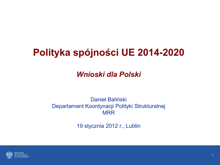 Polityka spójności UE 2014-2020 Wnioski dla Polski Daniel Baliński Departament Koordynacji Polityki Strukturalnej MRR 19 stycznia 2012 r., Lublin 1 Kalendarz prac podczas PREZ PL Kalendarz polskiej prezydencji 1. Pakiet propozycji legislacyjnych KE opublikowany 6 października 2011 r. 2. Działania na poziomie politycznym (Rada do Spraw Ogólnych): 3. 11 października 2011 r. – prezentacja pakietu 15 listopada 2011 r. – debata nt kwestii związanych z WRF 16 grudnia 2011 r. – debata nt kwestii o znaczeniu strategicznym dla pakietu w gronie ministrów odpowiedzialnych za PS Prace na poziomie roboczym (grupa robocza B.05 ds. środków strukturalnych) Szczegółowa prezentacja pakietu na posiedzeniach w dn 12-13 października 2011 r. w sumie 9 posiedzeń B.05, w tym 8 dwudniowych 4 seminaria techniczne, dotyczące alokacji finansowej dla PS, programowania strategicznego, wymiaru terytorialnego i warunkowości ex-ante Prace skupione wokół 4 bloków tematycznych: programowanie strategiczne, koncentracja tematyczna, rozwój terytorialny i warunkowość Dodatkowo: prezentacja propozycji KE dot. Instrumentu „Łącząc Europę” (CEF) i dyskusja na temat warunkowości makroekonomicznej Budżet polityki spójności po roku 2013 mld EUR ( w cenach z 2011 r.) Fundusz Spójności* 68,7 (21,19%) Regiony słabiej rozwinięte 162,6 (50,13%) Regiony przejściowe 39,0 Regiony lepiej rozwinięte 53,1 Współpraca terytorialna 11,7 (3,48%) Dodatkowe środki dla regionów najbardziej oddalonych i słabo zaludnionych 0,9 ŁĄCZNIE** 336,0 Instrument „Łącząc Europę” na rzecz transportu, energetyki i technologii informacyjno-komunikacyjnych 40,0 ŁĄCZNIE 376,0 *W ramach Funduszu Spójności na Instrument „Łącząc Europę” na rzecz transportu, energetyki i technologii informacyjno-komunikacyjnych przeznaczone zostanie 10 mld EUR **W tym alokacja w wysokości 2,5 mld EUR na żywność dla ubogich 3 Geograficzny zakres wsparcia Trzy kategorie regionów Regiony słabiej rozwinięte (PKB na mieszkańca < 75% średniej unijnej) Regiony przejściowe (PKB na mieszkańca na poziomie między 75% a 90%) Regiony lepiej rozwinięte (PKB na mieszkańca > 90% średniej unijnej) Nowa kategoria regionów przejściowych ma zastąpić dotychczasowy system mechanizmów phasing-out i phasing-in Sztywna relacja pomiędzy Funduszami Strukturalnymi w poszczególnych kategoriach regionów - ESF stanowi: min. 25% środków FS (ERDF i ESF) w regionach less developed (w Polsce 15 regionów), min. 40% środków FS (ERDF i ESF) w regionach transition (w Polsce mazowieckie), min. 52% środków FS (ERDF i ESF) w regionach more developed Zakaz przenoszenia środków alokowanych do MS pomiędzy poszczególnymi kategoriami regionów (art.85) – na zasadzie wyjątku możliwe do 2% w ramach pierwszego przedłożenia Kontraktu Partnerskiego 4 Wzmacnianie programowania zintegrowanego Zintegrowane podejście programowe Wspólne Ramy Strategiczne na szczeblu unijnym oraz umowa partnerska na szczeblu krajowym obejmują wszystkie fundusze WRS. Istnieje możliwość przygotowania i wdrożenia przez państwa członkowskie programów wielofunduszowych łączących EFRR, EFS i Fundusz Spójności. 5 Koncentracja tematyczna PS zobowiązane do koncentracji wsparcia na interwencjach przynoszących najwyższą wartość dodaną w stosunku do priorytetów strategii UE uwzględniając przy tym rekomendacje krajowe, tzw. countryspecific recommendations; Dyskusja na GAC: większość państw członkowskich widzi potrzebę zwiększenia elastyczności mechanizmów koncentracji przy realizacji PS większość ministrów uważa, że to KPR-y powinny być punktem odniesienia dla PS a rola wykorzystywania Zaleceń dla PCz jako narzędzia dostosowania PS do realizacji strategii „Europa 2020 – zmniejszona 6 Koncentracja tematyczna & wydzielone środki minimalne … … … … 2012-07-02 7 Programy Operacyjne Zasady konstrukcji Programów Operacyjnych: jedna Oś – jeden Fundusz – jeden Obszar Tematyczny; jeden Obszar Tematyczny – jeden lub więcej Priorytetów Inwestycyjnych dla OT; zgodność z EU 2020; uzasadnienia dla wyboru OT i PI w oparciu o UP i wyniki ewaluacji ex-ante; wskaźniki produktu i rezultatu dla każdej Osi; zintegrowane podejście do rozwoju terytorialnego (w tym wykaz miast); plan finansowy, przepisy wykonawcze, PC przekazuje KE programy operacyjne równolegle z umową partnerską. 8 Warunkowość ex-ante Zapewnienie warunków ramowych dla skutecznego wykorzystania wsparcia unijnego; Ex-ante conditionalities wynika z załącznika IV dla każdego CT, wskazanego w umowie partnerskiej; warunek wstępny wskazany przez KE w załączniku IV musi zostać spełniony, jeżeli PC chce wspierać dany obszar tematyczny PO musi zawierać plan działań na rzecz spełnienia warunku w trakcie dwóch lat (albo do końca 2016 r.), Brak realizacji w tym okresie skutkuje zawieszeniem płatności w odpowiednich osiach priorytetowych; 9 Warunkowość ex-post Cel warunkowości: ukierunkowanie PS na rezultaty, regularne monitorowanie postępów i nagroda za dobre wyniki w postaci rezerwy krajowej; Konstrukcja performance framework: dla każdego priorytetu wyznaczone są cele pośrednie dla lat 2016 i 2018 i cel końcowy dla 2022 roku; Proces oceny i jego skutki dla wdrażania PO: przeglądy postępów w 2017 i 2019 roku, w 2017 r. rekomendacje, w 2019 roku alokacja rezerwy między priorytety, które odniosły sukces; Możliwe sankcje: zawieszenie części lub całości płatności na rzecz priorytetu w wyniku przeglądu 2017 lub 2019 roku; Korekta netto za poważne niepowodzenie w osiąganiu celów wykazane w raporcie końcowym. 10 Warunkowość makroekonomiczna Cel warunkowości: z jednej strony zapewnienie sprzyjającego środowiska makroekonomicznego, z drugiej wykorzystanie środków unijnych do przywrócenia równowagi makroekonomicznej; Na czym polega: KE może zażądać zmiany UP i PO zgodnie z Zaleceniami dla poszczególnych PC