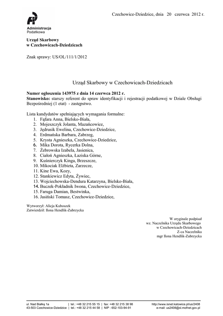 Czechowice-Dziedzice, dnia 20 czerwca 2012 r. Urząd Skarbowy w Czechowicach-Dziedzicach Znak sprawy: US/OL/111/1/2012 Urząd Skarbowy w Czechowicach-Dziedzicach Numer ogłoszenia 143975 z dnia 14 czerwca 2012 r. Stanowisko: starszy referent do spraw identyfikacji i rejestracji podatkowej w Dziale Obsługi Bezpośredniej (1 etat) - zastępstwo. Lista kandydatów spełniających wymagania formalne: 1. Fąfara Anna, Bielsko-Biała, 2. Mojeszczyk Jolanta, Mazańcowice, 3. Jędrusik Ewelina, Czechowice-Dziedzice, 4. Erdmańska Barbara, Zabrzeg, 5. Krysta Agnieszka, Czechowice-Dziedzice, 6. Mika Dorota, Rycerka Dolna, 7. Żebrowska Izabela, Jasienica, 8. Ciałoń Agnieszka, Łaziska Górne, 9. Kuśnierczyk Kinga, Brzeszcze, 10. Mikociak Elżbieta, Zarzecze, 11. Kine Ewa, Kozy, 12. Stankiewicz Edyta, Żywiec, 13. Wojciechowska-Dendura Katarzyna, Bielsko-Biała, 14. Buczek-Pokładnik Iwona, Czechowice-Dziedzice, 15. Faruga Damian, Bestwinka, 16. Jasiński Tomasz, Czechowice-Dziedzice, Wytworzył: Alicja Kuboszek Zatwierdził: Ilona Hendlik-Zubrzycka W oryginale podpisał wz. Naczelnika Urzędu Skarbowego w Czechowicach-Dziedzicach Z-ca Naczelnika mgr Ilona Hendlik-Zubrzycka ul. Nad Białką 1a | tel.: +48 32 215 55 15 | fax: +48 32 215 38 98 43-503 Czechowice-Dziedzice | tel.: +48 32 215 44 58 | NIP : 652-103-94-91 http://www.isnet.katowice.pl/us/2408 e-mail: [email protected]