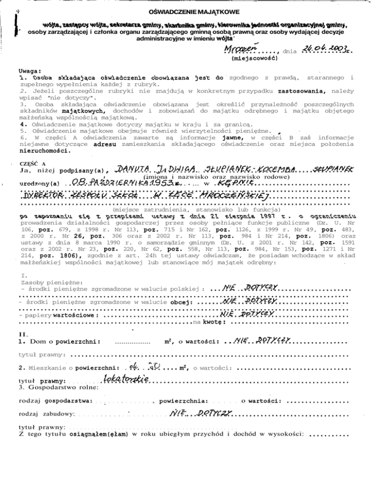 OŚWIADCZENIE MAJĄTKOWE l' osoby zarządzającej i członka organu zarządzającego gminną osobą prawną oraz osoby wydającej decyzje administracyjne w imieniu wójta ...... dnia (miejscowość) Uwaga : IŁ. t/stfoei śniadająca oświadczenie ooowiązana jest do zgodnego z prawdą, starannego i zupełnego wypełnienia każdej z rubryk. 2. Jeżeli poszczególne rubryki nie znajdują w konkretnym przypadku zastosowania, należy wpisać "nie dotyczy". 3. Osoba składająca oświadczenie obowiązana jest określić przynależność poszczególnych składników majątkowych, dochodów i zobowiązań do majątku odrębnego i majątku objętego małżeńską wspólnością majątkową. 4. Oświadczenie majątkowe dotyczy majątku w kraju i za granicą. 5. Oświadczenie majątkowe obejmuje również wierzytelności pieniężne. 6. W części A oświadczenia zawarte są informacje jawne, w części B zaś informacje niejawne dotyczące adresu zamieszkania składającego oświadczenie oraz miejsca położenia nieruchomości. CZĘŚĆ A Ja, niżej podpisany (a) , JMW.Z*. J A MJM. . 3Me/AWX-.#&€MM _ _, _ i (imiona i nazwisko oraz nazwisko rodowe) urodrony(a) . .QB.: fA&.ZtŹRWM . .1953.*, . - ... w (miejsce zatrudnienia, stanowisko lub funkcja) c.lij. si/ą. -Ł ^fz/a^i-t^jni. 'o^t^wj -Ł dsvLA 2.1. si.«.V£S.iA 1A%7 t . ^ •a^n:ej?łi1.ci,^Tłvi prowadzenia działalności gospodarczej przez osoby pełniące funkcje publiczne (Dz. U. Nr 106, póz. 679, z 1998 r. Nr 113, póz. 715 i Nr 162, póz. 1126, z 1999 r. Nr 49, póz. 483, z 2000 r. Nr 26, póz. 306 oraz z 2002 r. Nr 113, póz. 984 i Nr 214, póz. 1806) oraz ustawy z dnia 8 marca 1990 r. o samorządzie gminnym (Dz. U. z 2001 r. Nr 142, póz. 1591 oraz z 2002 r. Nr 23, póz. 220, Nr 62, póz. 558, Nr 113, póz. 984, Nr 153, póz. 1271 i Nr 214, póz. 1806), zgodnie z art. 24h tej ustawy oświadczam, że posiadam wchodzące w skład małżeńskiej wspólności majątkowej lub stanowiące mój majątek odrębny: I. Zasoby pieniężne: - środki pieniężne zgromadzone w walucie polskiej : ... PP& . - środki pieniężne zgromadzone w walucie obcej: - papiery wartościowe : na kwotę : II. l . Dom o powierzchni : ................. m2, o wartości : . . ///ł" tytuł prawny: 2 2. Mieszkanie o powierzchni: . P^. . .<i P. .... m , o wartości: tytuł prawny: 3. Gospodarstwo rolne: rodzaj gospodarstwa: rodzaj zabudowy: , powierzchnia: ' o wartości: /Y/r. tytuł prawny: Z tego tytułu osiągnąłem(ęłam) w roku ubiegłym przychód i dochód w wysokości: . Inne nieruchomości: 'powierzchnia ,__„, ..., .~ .. W£... £9?f.&#. o wartości: tytuł prawny: III. Posiadam udziały w spółkach handlowych - należy podać liczbę i emitenta udziałów: ." KS-Ł^ TiVŁ V&% -adziefiów w spółce: .... Z tego tytułu osiągnąłem(ęłam) w roku ubiegłym dochód w wysokości: IV. Posiadam akcje w spółkach handlowych - należy podać liczbę i emitenta akcji: "te stanowią pa'jcie't wię"Kszy niż 10% alce j i w spółce: Z tego tytułu osia.qnajLemf,ą'Łam\ w caVji lib-le^Ł^Ti. dsysJwć/d •* V. Nabyłem(am) (nabył mój małżonek, z wyłączeniem mienia przynależnego do lego maj.ątku odretoneao1; oó S"Kar"t>u Państwa, innej państwowej osoby prawnej, jednostek samorządu terytorialnego, ich związków lub od komunalnej osoby prawnej następujące mienie, które podlegało zbyciu w drodze przetargu ittieiiia i datę na"t»ycia, od Tcogo: VI. l- ErciwadJŁą. d-Łl^Ł^Lf^ić. ^s^c/d^-c/Ł^2 '\TieilL-fe-fery podać lormę prawną i przedmiot działalności) - osobiście ............................................................................. - wspólnie z innymi osobami ............................................................. Z tego tytułu osiągnąłem(ęłam) w roku ubiegłym przychód i dochód w _ wysokości 2. Zarządzam działalnością gospodarczą lub jestem przedstawicielem pełnomocnikiem takiej działalności (należy podać formę prawną i przedmiot działalności) : ...................... - osobiście /*/£ , - wspólnie z innymi osobami Z tego tytułu osiągnąłem(ęłam) w roku ubiegłym dochód w wysokości: VII. 1. W spółkach handlowych (nazwa, siedziba spółki): - lestem, - jestem członkiem rady nadzorczej (od kiedy): - jestem członkiem komisji rewizyjnej (od kiedy): Z tego tytułu osiągnąłem(ęłam) w roku ubiegłym dochód w wysokości: 2. W spółdzielniach: - jestem członkiem zarządu (od kiedy) : - jestem członkiem rady nadzorczej3 ,(od kiedy) : - jestem członkiem komisji rewizyjnej (od kiedy) : Z tego tytułu osiągnąłem (ęłam) w roku ubiegłym dochód w 3. W fundacjach prowadzących działalność gospodarczą: . . . . - jestem członkiem zarządu (od kiedy) : - i, e s tem cziQnJei.em c.a.d*£ TJA-iT.-c-rŁ-c.it^ 'i£/i - jestem członkiem komisji rewizyjnej (od kiedy): ................ Z. te.f}a t:^t.iiŁ'i o.si.:et'5Vi^l'^nv/\-ę:'iciTtiły %* ttfKU ubiegłym docnbd w wysoTcości; / VIII. /podani^ °,Siąganif4 2 fc^ułu ^trudnienia lub innej działalności zarobkowej lub zaleć /podaniem kwot^u zyskiwanych z każdego tytiiłu: _ .. . .. l^ią.-; 'sJee&ui' * 'A 03G,'ŻÓ * IX. ^ ...'.'.'.'.'. 'rtiż'.! !£stXcex'' *.".' *.'.'..'.'.....'.'. .\\"!."!!!!.'!!.' .\" i ' ' X. i j . L e :i. o wartości na -iaVi/-K powyżej T,-^4-.,%„ 10.000 ..->_-•-i złotych, '---i w tym zaciągnięte ' • kredyty i CZĘŚĆ B Adres zamieszkania osoby składającej l^???.P?t°Żenia 2 " 3 4 \ nieruchomości oświadczenie wymieńióńyćn'w'puńkćie'ii'ćżęsći'A* (adres) n^ świadomy ( a ) , iż na podstawie art. 233 S l Kodeksu karnego nieprawdy lub zata D enie prawdy grozi kara pozbawienia wolności. (miejscowość, data) '(podpi<f) J Niewłaściwe skreślić. działalności wytwórczej w rolnictwie w zakresie ^linnej i zwierzęcej, w formie i zakresie rodzinnego. Nie dotyczy rad nadzorczych spółdzielni mieszkaniowych.