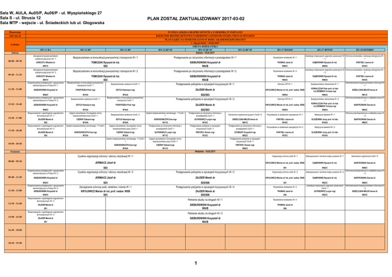Sala W, AULA, Au05/P, Au06/P - ul. Wyspiańskiego 27 Sala S - ul. Strusia 12 Sala MTP - wejscie - ul. Śniadeckich lub ul. Głogowska PLAN ZOSTAŁ ZAKTUALIZOWANY 2017-03-02 Planowanie WYŻSZA SZKOŁA BEZPIECZEŃSTWA Z SIEDZIBĄ W POZNANIU 2017-02-18 KIERUNEK BEZPIECZEŃSTWO NARODOWE 6 SEMESTR STUDIA NIESTACJONARNE PLAN ZAJĘĆ NA SEMESTR LETNI W ROKU AKADEMICKIM 2016/2017 1 Zjazd 18.02. - 19.02.2017 GRUPA DZIEKAŃSKA BN-15 BP SP Sobota - 18.02.2017 Godziny BN-11 BA BN-12 BP BN-13 BP BN-14 BP SP Sobota Zarządzanie bezpieczeństwem antyterrorystycznym W / 1 08:00 - 09:30 Postępowanie po otrzymaniu informacji o przestępstwie W / 1 Wyszkolenie strzeleckie W / 1 TOMCZAK Ryszard dr inż. S02 GIEBUROWSKI Krzysztof dr WA/B THOMAS Jacek dr W07/C 09:40 - 11:10 11:30 - 13:00 13:10 - 14:40 15:30 - 17:00 17:10 - 18:40 BN-17 BOOiM Bezpieczeństwo w komunikacji powszechnej i transporcie W / 1 KORCZYC Wiesław dr Zarządzanie bezpieczeństwem antyterrorystycznym W / 2 BN-16 BP SP W04/C BN-17 BPPOŻ BN-18 BZPiBHP Likwidacja miejscowych zagrożeń pożarowych W Ochrona środowiska i edukacja ekologiczna W / /1 1 DĄBROWSKI Ryszard dr inż. FARYSEJ Joanna dr W09/A W10/C Likwidacja miejscowych zagrożeń pożarowych W Ochrona środowiska i edukacja ekologiczna W / /2 2 Bezpieczeństwo w komunikacji powszechnej i transporcie W / 2 Postępowanie po otrzymaniu informacji o przestępstwie W / 2 Wyszkolenie strzeleckie W / 2 TOMCZAK Ryszard dr inż. S02 GIEBUROWSKI Krzysztof dr WA/B THOMAS Jacek dr DĄBROWSKI Ryszard dr inż. FARYSEJ Joanna dr W04/C W09/A W10/C Administrowanie bezpieczeństwem informacji W /1 KORCZYC Wiesław dr W07/C Zorganizowana przestępczość i ugrupowania ekstremistyczne w Polsce W / 1 Bezpieczeństwo w komunikacji powszechnej i transporcie Cw/S / 1 Bezpieczeństwo społeczne Cw/S / 1 Postępowanie policjanta w sytuacjach kryzysowych W / 1 Ochrona VIP W / 1 Bezpieczeństwo ratownictwa W / 1 GIEBUROWSKI Krzysztof dr POKRYSZKA Piotr mgr SZYCA Katarzyna mgr ZAJDER Marek dr KRYŁOWICZ Marian dr inż. prof. nadzw. WSB KOWALCZAK Piotr prof. dr hab. inż./DEMBSKI Tomasz mgr W08/C Zorganizowana przestępczość i ugrupowania ekstremistyczne w Polsce W / 2 W15/A W16/A Bezpieczeństwo w komunikacji powszechnej i transporcie Cw/S / 1 S02/S03 W09/A W06/A Postępowanie policjanta w sytuacjach kryzysowych W / 2 Ochrona VIP W / 2 Bezpieczeństwo ratownictwa W / 2 Bezpieczeństwo społeczne Cw/S / 1 GRZELCZAK-MIŁOŚ Iwona dr W01/C Ochrona przeciwpożarowa w zakładzie pracy W /1 GIEBUROWSKI Krzysztof dr SZYCA Katarzyna mgr POKRYSZKA Piotr mgr ZAJDER Marek dr KRYŁOWICZ Marian dr inż. prof. nadzw. WSB KOWALCZAK Piotr prof. dr hab. inż./DEMBSKI Tomasz mgr W08/C W15/A W16/A S02/S03 W09/A W06/A W02/C Rozpoznawanie i zapobieganie zagrożeniom terrorystycznym W / 1 Zajęcia warsztatowe: Europejskie normy bezpieczeństwa pracy Cw/S / 1 Bezpieczeństwo społeczne Cw/S / 2 System bezpieczeństwa narodowego - F Cw/S / 1 Postępowanie po otrzymaniu informacji o przestępstwie Cw/S / 1 Seminarium dyplomowe grupa A Cw/S / 8 Przywództwo w działaniach specjalnych W / 1 Medycyna katastrof W / 1 Ochrona przeciwpożarowa w zakładzie pracy W /2 ZAJDER Marek dr S02 CZERNY Edward mgr W15/A SZYCA Katarzyna mgr W16/A OGRODOWCZYK Ewa mgr W11/C DUTKIEWICZ Lucjan mgr W12/C GRZELCZAK-MIŁOŚ Iwona dr W01/C FARYSEJ Joanna dr W10/C OLSZEWSKI Jerzy prof. dr hab. W10/A BARTKOWIAK Danuta dr W02/C Rozpoznawanie i zapobieganie zagrożeniom terrorystycznym W / 2 System bezpieczeństwa narodowego - F Cw/S / 1 Zajęcia warsztatowe: Europejskie normy bezpieczeństwa pracy Cw/S / 1 Postępowanie po otrzymaniu informacji o przestępstwie Cw/S / 1 Postępowanie policjanta w sytuacjach kryzysowych Cw/S / 1 Postępowanie po otrzymaniu informacji o przestępstwie Cw/S / 1 Przywództwo w działaniach specjalnych W / 2 Medycyna katastrof W / 2 ZAJDER Marek dr S02 OGRODOWCZYK Ewa mgr W15/A CZERNY Edward mgr W16/A DUTKIEWICZ Lucjan mgr W11/C PRZYBYŁ Roman mgr W12/C ZYGMUNT Krzysztof mgr W02/C FARYSEJ Joanna dr W10/C OLSZEWSKI Jerzy prof. dr hab. W10/A System bezpieczeństwa narodowego - F Cw/S / 1 Zajęcia warsztatowe: Europejskie normy bezpieczeństwa pracy Cw/S / 1 OGRODOWCZYK Ewa mgr W16/A CZERNY Edward mgr W11/C Cywilna organizacja ochrony i obrony narodowej W / 1 Organizacja ochrony osób W / 1 Zabezpieczenie i kontrola miejsc pożarów W / 1 Seminarium dyplomowe Cw/S / 8 JERMACZ Józef dr KRYŁOWICZ Marian dr inż. prof. nadzw. WSB DĄBROWSKI Ryszard dr inż. BARTKOWIAK Danuta dr S03 S01 W02/C W06/C Ochrona przeciwpożarowa w zakładzie pracy W /3 18:50 - 20:20 BARTKOWIAK Danuta dr Postępowanie policjanta w sytuacjach kryzysowych Cw/S / 1 PRZYBYŁ Roman mgr W02/C Niedziela - 19.02.2017 Niedziela 08:00 - 09:30 Zorganizowana przestępczość i ugrupowania ekstremistyczne w Polsce W / 3 Cywilna organizacja ochrony i obrony narodowej W / 2 Postępowanie policjanta w sytuacjach kryzysowych W / 3 Organizacja ochrony osób W / 2 Zabezpieczenie i kontrola miejsc pożarów W / 2 09:40 - 11:10 GIEBUROWSKI Krzysztof dr JERMACZ Józef dr ZAJDER Marek dr KRYŁOWICZ Marian dr inż. prof. nadzw. WSB DĄBROWSKI Ryszard dr inż. BARTKOWIAK Danuta dr S03 S05/S06 S01 Zarządzanie ochroną osób, obiektów i mienia W / 1 Postępowanie policjanta w sytuacjach kryzysowych W / 4 Wyszkolenie strzeleckie W / 3 11:30 - 13:00 W05/C Zorganizowana przestępczość i ugrupowania ekstremistyczne w Polsce W / 4 GIEBUROWSKI Krzysztof dr KRYŁOWICZ Marian dr inż. prof. nadzw. WSB S03 ZAJDER Marek dr S05/S06 THOMAS Jacek dr W02/C Likwidacja miejscowych zagrożeń pożarowych Cw/S / 1 DUTKIEWICZ Lucjan mgr W06/C Administrowanie bezpieczeństwem informacji W /2 GRZELCZAK-MIŁOŚ Iwona dr S04 W02/C W03/C Pełnienie służby na drogach W / 1 Wyszkolenie strzeleckie W / 4 GIEBUROWSKI Krzysztof dr WA/B THOMAS Jacek dr S01 Rozpoznawanie i zapobieganie zagrożeniom terrorystycznym W / 4 Pełnienie służby na drogach W / 2 W05/C Rozpoznawanie i zapobieganie zagrożeniom terro