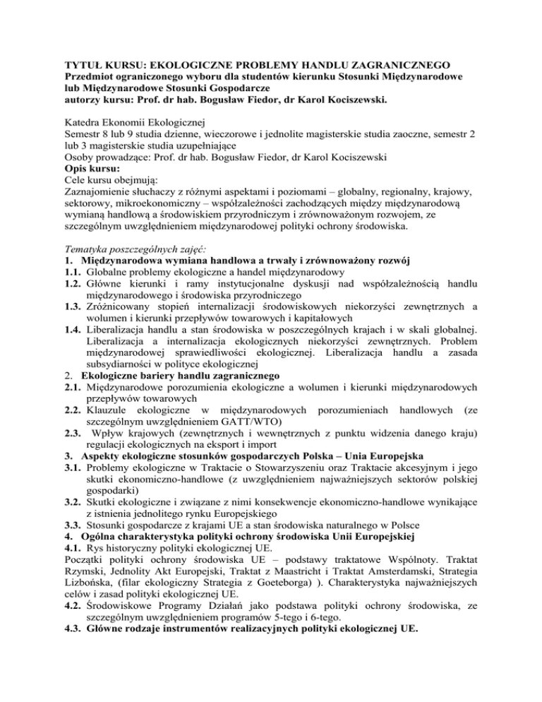 TYTUŁ KURSU: EKOLOGICZNE PROBLEMY HANDLU ZAGRANICZNEGO Przedmiot ograniczonego wyboru dla studentów kierunku Stosunki Międzynarodowe lub Międzynarodowe Stosunki Gospodarcze autorzy kursu: Prof. dr hab. Bogusław Fiedor, dr Karol Kociszewski. Katedra Ekonomii Ekologicznej Semestr 8 lub 9 studia dzienne, wieczorowe i jednolite magisterskie studia zaoczne, semestr 2 lub 3 magisterskie studia uzupełniające Osoby prowadzące: Prof. dr hab. Bogusław Fiedor, dr Karol Kociszewski Opis kursu: Cele kursu obejmują: Zaznajomienie słuchaczy z różnymi aspektami i poziomami – globalny, regionalny, krajowy, sektorowy, mikroekonomiczny – współzależności zachodzących między międzynarodową wymianą handlową a środowiskiem przyrodniczym i zrównoważonym rozwojem, ze szczególnym uwzględnieniem międzynarodowej polityki ochrony środowiska. Tematyka poszczególnych zajęć: 1. Międzynarodowa wymiana handlowa a trwały i zrównoważony rozwój 1.1. Globalne problemy ekologiczne a handel międzynarodowy 1.2. Główne kierunki i ramy instytucjonalne dyskusji nad współzależnością handlu międzynarodowego i środowiska przyrodniczego 1.3. Zróżnicowany stopień internalizacji środowiskowych niekorzyści zewnętrznych a wolumen i kierunki przepływów towarowych i kapitałowych 1.4. Liberalizacja handlu a stan środowiska w poszczególnych krajach i w skali globalnej. Liberalizacja a internalizacja ekologicznych niekorzyści zewnętrznych. Problem międzynarodowej sprawiedliwości ekologicznej. Liberalizacja handlu a zasada subsydiarności w polityce ekologicznej 2. Ekologiczne bariery handlu zagranicznego 2.1. Międzynarodowe porozumienia ekologiczne a wolumen i kierunki międzynarodowych przepływów towarowych 2.2. Klauzule ekologiczne w międzynarodowych porozumieniach handlowych (ze szczególnym uwzględnieniem GATT/WTO) 2.3. Wpływ krajowych (zewnętrznych i wewnętrznych z punktu widzenia danego kraju) regulacji ekologicznych na eksport i import 3. Aspekty ekologiczne stosunków gospodarczych Polska – Unia Europejska 3.1. Problemy ekologiczne w Traktacie o Stowarzyszeniu oraz Traktacie akcesyjnym i jego skutki ekonomiczno-handlowe (z uwzględnieniem najważniejszych sektorów polskiej gospodarki) 3.2. Skutki ekologiczne i związane z nimi konsekwencje ekonomiczno-handlowe wynikające z istnienia jednolitego rynku Europejskiego 3.3. Stosunki gospodarcze z krajami UE a stan środowiska naturalnego w Polsce 4. Ogólna charakterystyka polityki ochrony środowiska Unii Europejskiej 4.1. Rys historyczny polityki ekologicznej UE. Początki polityki ochrony środowiska UE – podstawy traktatowe Wspólnoty. Traktat Rzymski, Jednolity Akt Europejski, Traktat z Maastricht i Traktat Amsterdamski, Strategia Lizbońska, (filar ekologiczny Strategia z Goeteborga) ). Charakterystyka najważniejszych celów i zasad polityki ekologicznej UE. 4.2. Środowiskowe Programy Działań jako podstawa polityki ochrony środowiska, ze szczególnym uwzględnieniem programów 5-tego i 6-tego. 4.3. Główne rodzaje instrumentów realizacyjnych polityki ekologicznej UE. Charakterystyka najważniejszych instrumentów prawno-administracyjnych (systemu prawa ochrony środowiska UE – rozporządzeń, dyrektyw i decyzji, ze szczególnym uwzględnieniem prawa horyzontalnego oraz związanych z jego realizacją instytucji), instrumentów ekonomicznych, które umożliwiają efektywne ekonomicznie wdrożenie standardów ekologicznych. 4.3.1. Ochrona prawna środowiska według głównych jego obszarów (komponentów): ochrony powietrza, ochrony wód, ochrony przyrody, ochrony przed hałasem, przed odpadami oraz nadzwyczajnymi zagrożeniami, chemikaliami, zagrożeniami przemysłowymi i biotechnologią.. 4.3.2. Działania o charakterze proekologicznym realizowane w obrębie głównych sektorów gospodarki – w ramach polityki energetycznej, rolnej, transportowej i przemysłowej), działań polityki strukturalnej i w ramach Wspólnej Polityki Rolnej. 5. Dostosowania Polski do polityki i standardów ochrony środowiska UE 5.1. Harmonizacja prawa - główne obszary i rodzaje działań dostosowawczych Działania konieczne do przeprowadzenia w procesie harmonizacji. W układzie poszczególnych obszarów (komponentów) ochrony środowiska oraz głównych sektorów gospodarki i polityk, które ich dotyczą., w ujęciu sektorowym energetyka, przemysł, transport i rolnictwo. Dziewięć okresów dostosowawczych, które udało się uzyskać w negocjacjach przedakcesyjnych.. Koszty działań dostosowawczych przedstawione według poszczególnych obszarów ochrony środowiska oraz konkretnych rozporządzeń i dyrektyw. 5.2. Programy wdrażania unijnego wsparcia ochrony środowiska w Polsce Wsparcie finansowe dla Polski w ramach polityki spójności UE. Narodowy Plan Rozwoju na lata 2004-2006 i Narodowe Strategiczne Ramy Odniesienia na lata 2007-2013. Najważniejsze (z punktu widzenia ochrony środowiska) cele, priorytety i działania tych programów wraz z wielkością możliwych do uzyskania alokacji oraz efektywność wykorzystania funduszy przedakcesyjnych i wsparcia w latach 2004-2006 Literatura podstawowa: 1. Budnikowski, Adam. Ochrona środowiska jako problem globalny Warszawa: PWE, 1998 2. Kozłowski, Stefan. Przyszłość Ekorozwoju. Wydawnictwo KUL. Lublin 2005 3. Podstawy ekonomii środowiska i zasobów naturalnych, red. B. Fiedor, Warszawa: Wyd. C. H. Beck, 2002 4. Uwarunkowania ochrony środowiska – aspekty krajowe, unijne, międzynarodowe. Pod red. E. K. Czech. Difin Warszawa 2006 5. M. Kramer, M.Urbaniec, A. Kryński (red.) Międzynarodowe zarządzanie środowiskiem C.H. Beck Warszawa 2004 Literatura uzupełniająca: 1. Żylicz T. Ekonomia środowiska i zasobów naturalnych PWE Warszawa 2004 2. Jędrośka J. Bar M. Prawo ochrony środowiska. Podręcznik Centrum prawa ekologicznego. Wrocław 2005 3. Poskrobko B., Poskrobko T., Skiba K.. Ochrona Biosfery. PWE Warszawa 2007 4. Z. Bukowski Prawo międzynarodowe a