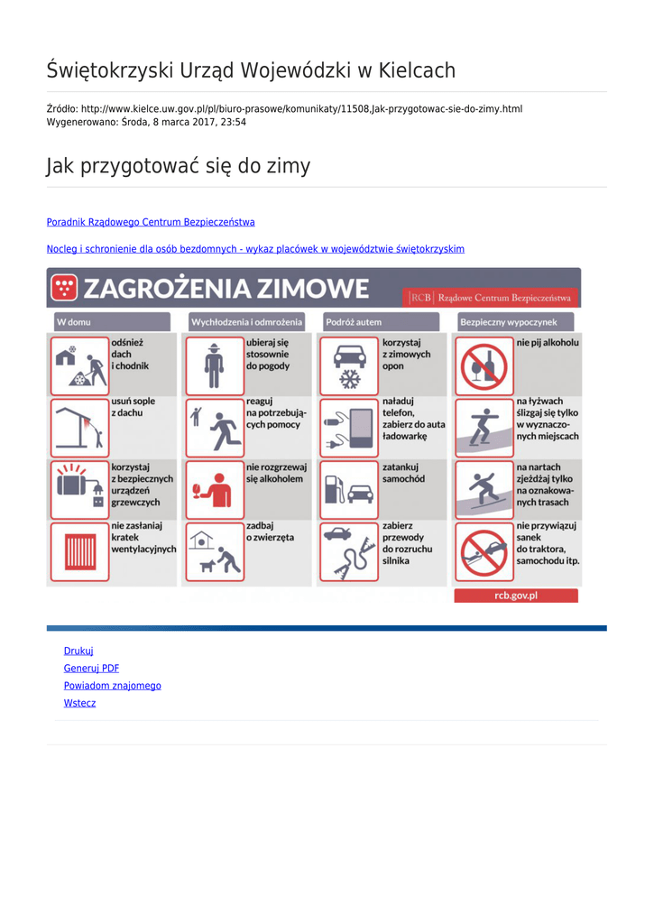 Świętokrzyski Urząd Wojewódzki w Kielcach Źródło: http://www.kielce.uw.gov.pl/pl/biuro-prasowe/komunikaty/11508,Jak-przygotowac-sie-do-zimy.html Wygenerowano: Środa, 8 marca 2017, 23:54 Jak przygotować się do zimy Poradnik Rządowego Centrum Bezpieczeństwa Nocleg i schronienie dla osób bezdomnych - wykaz placówek w województwie świętokrzyskim Drukuj Generuj PDF Powiadom znajomego Wstecz