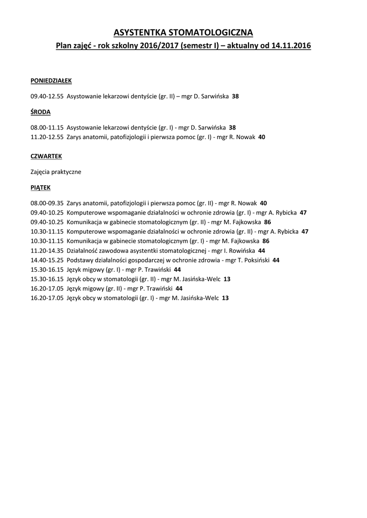 ASYSTENTKA STOMATOLOGICZNA Plan zajęć - rok szkolny 2016/2017 (semestr I) – aktualny od 14.11.2016 PONIEDZIAŁEK 09.40-12.55 Asystowanie lekarzowi dentyście (gr. II) – mgr D. Sarwińska 38 ŚRODA 08.00-11.15 Asystowanie lekarzowi dentyście (gr. I) - mgr D. Sarwińska 38 11.20-12.55 Zarys anatomii, patofizjologii i pierwsza pomoc (gr. I) - mgr R. Nowak 40 CZWARTEK Zajęcia praktyczne PIĄTEK 08.00-09.35 09.40-10.25 09.40-10.25 10.30-11.15 10.30-11.15 11.20-14.35 14.40-15.25 15.30-16.15 15.30-16.15 16.20-17.05 16.20-17.05 Zarys anatomii, patofizjologii i pierwsza pomoc (gr. II) - mgr R. Nowak 40 Komputerowe wspomaganie działalności w ochronie zdrowia (gr. I) - mgr A. Rybicka 47 Komunikacja w gabinecie stomatologicznym (gr. II) - mgr M. Fajkowska 86 Komputerowe wspomaganie działalności w ochronie zdrowia (gr. II) - mgr A. Rybicka 47 Komunikacja w gabinecie stomatologicznym (gr. I) - mgr M. Fajkowska 86 Działalność zawodowa asystentki stomatologicznej - mgr I. Rowińska 44 Podstawy działalności gospodarczej w ochronie zdrowia - mgr T. Poksiński 44 Język migowy (gr. I) - mgr P. Trawiński 44 Język obcy w stomatologii (gr. II) - mgr M. Jasińska-Welc 13 Język migowy (gr. II) - mgr P. Trawiński 44 Język obcy w stomatologii (gr. I) - mgr M. Jasińska-Welc 13
