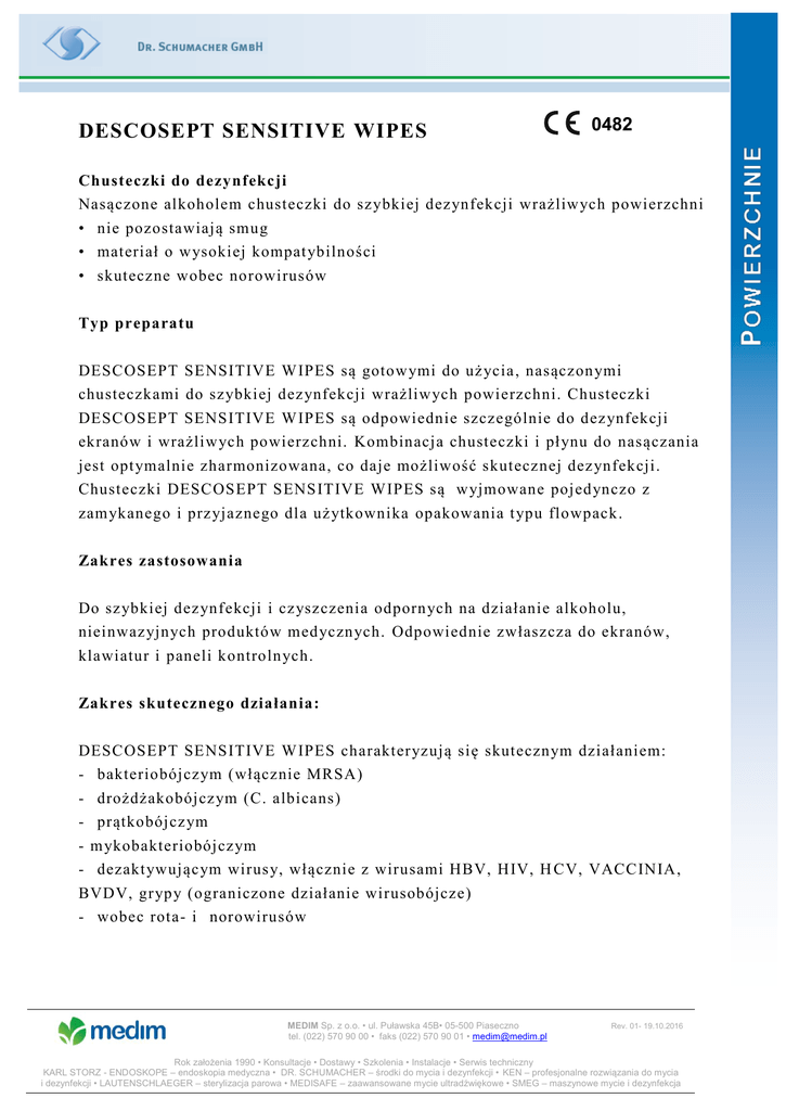DESCOSEPT SENSITIVE WIPES 0482 Chusteczki do dezynfekcji Nasączone alkoholem chusteczki do sz ybkiej dez ynfekcji wrażliwych powierzchni • nie pozostawiają smug • materiał o wysokiej kompat ybilności • skuteczne wobec norowirusów Typ preparatu DESCOSEPT SENSITIVE W IPES są gotowymi do uż ycia , nasączonymi chusteczkami do sz ybkiej dez ynfekcji wrażliwych powierzchni. Chusteczki DESCOSEPT SENSITIVE W IPES są odpowiednie szczególnie do dez ynfekcji ekranów i wrażliwych powierzchni. Kombinacja chusteczki i pł ynu do nasączania jest opt ymalnie zharmonizowana, co daje możliwość skutecznej dez ynfekcji. Chusteczki DESCOSEPT SENS ITIVE WIPES są wyjmowane pojedynczo z zam ykanego i prz yjaznego dla uż ytkownika opakowania t ypu flowpack . Zakres zastosowania Do sz ybkiej dez ynfekcji i cz yszczenia odpornych na działanie alkoholu, nieinwaz yjnych produktów medycznych. Odpowiednie zwłaszcza do ekranów, klawiatur i paneli kontrolnych. Zakres skutecznego działania: DESCOSEPT SENSITIVE W IPES charakteryzują się skutecznym działaniem: - bakteriobójcz ym (włącznie MRSA) - drożdżakobójcz ym (C. albicans) - prątkobójcz ym - m ykobakteriobójczym - dezakt ywującym wirusy, włącznie z wirusami HBV, HIV, H CV, VACC INIA , BVDV, grypy (ograniczone działanie wirusobójcze) - wobec rota- i norowirusów MEDIM Sp. z o.o. • ul. Puławska 45B• 05-500 Piaseczno tel. (022) 570 90 00 • faks (022) 570 90 01 • [email protected] Rev. 01- 19.10.2016 Rok założenia 1990 • Konsultacje • Dostawy • Szkolenia • Instalacje • Serwis techniczny KARL STORZ - ENDOSKOPE – endoskopia medyczna • DR. SCHUMACHER – środki do mycia i dezynfekcji • KEN – profesjonalne rozwiązania do mycia i dezynfekcji • LAUTENSCHLAEGER – sterylizacja parowa • MEDISAFE – zaawansowane mycie ultradźwiękowe • SMEG – maszynowe mycie i dezynfekcja Zakres skutecznego działania i czas oddziaływania : Zakres skutecznego działania 30 s 1 min dezynfekcja powierzchni wg DGHM/VAH wysokie obciążenie •* (działanie bakteriobójcze i i drożdżakobójcze) niskie obciążenie •* skuteczny wobec wszystkich wirusów otoczkowych zgodnie z RKI/DVV • włącznie z HBV/HIV/HCV VACV • (ograniczone działanie wirusobójcze) BVDV • r o t aw i r us zgodnie z normą EN 14476 • n o r ow i r us ( M N V ) zgodnie z normą EN 14476, niskie obciążenie p r ąt ko bójczy (M. terrae) zgodnie z normą EN 14348, niskie obciążenie p r ąt ko bójczy (M. avium) zgodnie z normą EN 14348, niskie obciążenie • • • * umieszczony w kolumnie 5 min na liście VAH Odpowiedni do stosowania w obszarach o zgodnie z wytycznymi VAH z września 2014 r. podwyższonym ryzyku zakażenia dotyczącą systemów aplikacji chusteczek Odpowiedni do stosowania w obszarach bez lub o zgodnie z wytycznymi VAH z września 2014 r. ewentualnym ryzyku zakażenia dotyczącą systemów aplikacji chusteczek • • Sposób użycia Powierzchnie należ y dokładnie przetrzeć chusteczkami DESCOSEPT SENSITIVE WIPES. Należ y prz y tym zwrócić uwagę, by został y one w pełni zwilżone, oraz należ y przestrzegać czasu oddział ywania. Skład 100 g roztworu jako substancję cz ynną zawiera: 45,0 g etanolu. Opakowania Opakowanie jednostkowe 1 opakowanie typu flowpack á 80 chusteczek rozmiar chusteczek 20x22 cm Jednostka sprzedaży Nr katalogowy 12 x 1 opakowanie typu flowpack MEDIM Sp. z o.o. • ul. Puławska 45B• 05-500 Piaseczno tel. (022) 570 90 00 • faks (022) 570 90 01 • [email protected] Rev. 01- 19.10.2016 Rok założenia 1990 • Konsultacje • Dostawy • Szkolenia • Instalacje • Serwis techniczny KARL STORZ - ENDOSKOPE – endoskopia medyczna • DR. SCHUMACHER – środki do mycia i dezynfekcji • KEN – profesjonalne rozwiązania do mycia i dezynfekcji • LAUTENSCHLAEGER – sterylizacja parowa • MEDISAFE – zaawansowane mycie ultradźwiękowe • SMEG – maszynowe mycie i dezynfekcja Dodatkowe informacje Produkt łatwopalny Przechowywać z dala od źródeł ciepła, gorących powierzchni, źródeł iskrzenia, otwartego ognia i innych źródeł zapłonu. Nie palić Przechowywać pojemnik szczelnie zamknięt y. Unikać wdychania pary. W PRZYPADKU DOSTANIA S IĘ DO OCZU: Ostrożnie płukać wodą przez kilka minut. W yjąć soczewki kontaktowe, jeżeli są i można je łatwo usunąć. Nadal płukać. Zawartość/pojemnik usuwać do zatwierdzonych przedsiębiorstw zbierania lub usuwania odpadów. Ekspertyzy prof. dr Schubert, specjalista ds. hi gieny, Frankfurt: ekspertyza dot ycząca dez ynfekcji powierzchni, zgodnie z wym ogami DGHM/VAH. dr Suchomel, specjalista ds. hi gieny, Wiedeń: ekspert yza dotycząca dez ynfekcji powierzchni, zgodnie z wymogami DGHM/VAH. dr Steinmann, specjalista ds. wirusologii, Brema: ekspert yza dot ycząca skuteczności wobec wirusa Vaccinia. Ekspert yza dot ycząca skuteczności wobec wirusa BVDV. prof. dr Werner, specjalista ds. hi gieny, Schwerin: ekspert yza dot ycząca skuteczności biobójczej wobec wirusa Noro MNV. Ekspert yza dot ycząca skuteczności biobójczej wobec wirusa Rota. Ekspert yza dot ycząca skuteczności mykobakteriobójczej i prątkobójczej, zgodnie z normą EN 14348. Wykaz list zawierających produkt/Status produktu Umieszczony na aktualn ej liście VAH środków do dez ynfekcji . Umieszczony na aktual nej liście ÖGHMP środków do dez ynfekcji. Spełnia wymogi dyrekt ywy Rady 93/42/EWG dot yczącej wyrobów medycznych. MEDIM Sp. z o.o. • ul. Puławska 45B• 05-500 Piaseczno tel. (022) 570 90 00 • faks (022) 570 90 01 • [email protected] Rev. 01- 19.10.2016 Rok założenia 1990 • Konsultacje • Dostawy • Szkolenia • Instalacje • Serwis techniczny KARL STORZ - ENDOSKOPE – endoskopia medyczna • DR. SCHUMACHER – środki do mycia i dezynfekcji • KEN – profesjonalne rozwiązania do mycia i dezynfekcji • LAUTENSCHLAEGER – sterylizacja parowa • MEDISAFE – zaawansowane mycie ultradźwiękowe •