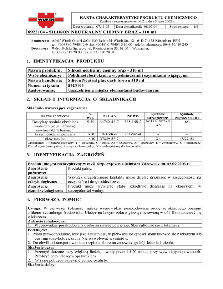 KARTA CHARAKTERYSTYKI PRODUKTU CHEMICZNEGO Zgodnie z rozporządzeniem M.Z. z dnia 3 lipca 2002 r. Data wydania: 07.11.03 Data aktualizacji: 08.07.04 Strona/stron: 1/6 8923104 - SILIKON NEUTRALNY CIEMNY BRĄZ - 310 ml Producent: Adolf Würth GmbH &Co. KG.Reinhold-Würth Str. 12-16 D-74653 Künzelsau RFN tel.: (0049) 0 7940/15-0 fax: (0049) 0 7940/15 10 00 telefon alarmowy: 0049 30/ 19 240 Dostawca: Würth Polska Sp. z o.o. ul. Płochocińska 33, 03-044 Warszawa, tel. (022) 510 20 00, fax: (022) 510 20 01 1. IDENTYFIKACJA PRODUKTU Nazwa produktu: Wzór chemiczny: Nazwa handlowa: Numer artykułu: Zastosowanie: Silikon neutralny ciemny brąz - 310 ml Polidimetylosiloksan z wypełniaczami i czynnikami wiążącymi. Silicon Neutral plus dark brown 310 ml 8923104 Uszczelnienia między elementami budowlanymi 2. SKŁAD I INFORMACJA O SKŁADNIKACH Składniki stwarzające zagrożenie: Nazwa chemiczna Destylaty średnie obrabiane wodorem (ropa naftowa); % wag. Nr CAS Nr WE Symbole ostrzegawcze 5-30 64742-46-7 265-148-2 NOTA H, NOTA N 1-10 1-<10 7631-86-9 37859-57-7 231-545-4 - Xn Xn Symbole zagrożenia (R) 65 (zawiera < 0,1 % benzenu ) krzemionka, amorficzna oksymosilan 48/22-53 Objaśnienie: T+= bardzo toksyczny, T = toksyczny, C = żrący, Xn = szkodliwy, Xi = drażniący, E = wybuchowy, O = utleniający, F+= skrajnie łatwo palny, F = wysoce łatwo palny, N = niebezpieczny dla środowiska 3. IDENTYFIKACJA ZAGROŻEŃ Produkt nie jest niebezpieczny w myśl rozporządzenia Ministra Zdrowia z dn. 03.09.2003 r. Produkt palny. Zagrożenie pożarowe: Wskutek długotrwałego kontaktu może działać drażniąco w szczególności na Zagrożenie oczy, skórę i drogi oddechowe. toksykologiczne: Produkt może wywierać słabe szkodliwe działanie na ekosystem, w Zagrożenie ekotoksykologiczne: szczególności wodny. 4. PIERWSZA POMOC Uwaga: W pierwszej kolejności należy wyprowadzić poszkodowaną osobę ze skażonego oparami silikonu neutralnego środowiska. Ułożyć na lewym boku z głową skierowaną w dół. Skontaktować się z lekarzem. Zatrucie inhalacyjne: 1. Wyprowadzić poszkodowana osobę na świeże powietrze. Skonsultować się z lekarzem. Połknięcie: 1. Mało prawdopodobne, lecz jeżeli zaistnieje, w pierwszej kolejności skontaktować się z lekarzem lub centrum toksykologicznym. Nie wywoływać wymiotów. 2. Do chwili odtransportowania do szpitala choremu zapewnić spokój, leżenie i ciepło. Skażenie oczu: 1. Przemyć skażone oczy większą ilością wody przez 15-20 minut, przy wywiniętych powiekach. Przykryć oczy jałowym opatrunkiem. 2. W razie potrzeby zapewnić pomoc okulisty. Skażenie skóry: KARTA CHARAKTERYSTYKI PRODUKTU CHEMICZNEGO Zgodnie z rozporządzeniem M.Z. z dnia 3 lipca 2002 r. Data wydania: 07.11.03 Data aktualizacji: 08.07.04 Strona/stron: 2/6 8923104 - SILIKON NEUTRALNY CIEMNY BRĄZ - 310 ml 1. Zdjąć skażone ubranie. Oczyścić mechanicznie skażoną skórę, przemyć dużą ilością wody a następnie wodą z łagodnym mydłem. Nie stosować rozpuszczalników. 2. W przypadku gdy podrażnienie skóry nie przemija, skonsultować się z lekarzem dermatologiem. 5. POSTĘPOWANIE W PRZYPADKU POŻARU Zagrożenia pożarowe: W przypadku pożaru stosować w kolejności: Zalecenia szczegółowe: Masa plastyczna, palna. Pod wpływem wysokiej temperatury nastąpi stopniowe wysuszanie masy plastycznej połączone z obfitym wydzielaniem oparów. Pojemniki poddane działaniu wysokiej temperatury będą gwałtownie pękać. · gaśnice CO2, · piana gaśnicza, · gaśnice proszkowe z proszkiem gaszącym ABC lub BC, · rozproszona woda. Mały pożar gasić gaśnicą śniegową (CO2) lub proszkową (ABC lub BC), duży pożar gasić. Zagrożone opakowania chłodzić wodą. Pełne ubrania ochronne. Aparaty izolujące drogi oddechowe. Sprzęt ochronny strażaków: Produktu odparowywania W ogniu wydzielają się tlenki węgla, tlenki azotu, lotne związki krzemu, niebezpieczne pary i dymy. i spalania: 6. POSTĘPOWANIE W PRZYPADKU NIEZAMIERZONEGO UWOLNIENIA DO ŚRODOWISKA Ubrania robocze ze zwartej tkaniny, rękawice z tworzywa nitrylowego, buty z tworzywa nitrylowego, okulary ochronne. Dostęp do świeżego powietrza. Ryzyko ślizgania się. Zalecenia szczegółowe: Zabezpieczyć uszkodzone opakowania, zebrany ze środowiska silikon umieścić w opakowaniu zastępczym i skierować do ewentualnego zagospodarowania lub zniszczenia. Resztki spłukać strumieniami wody. Zabezpieczyć studzienki ściekowe. Chronić wody powierzchniowe. W Zabezpieczenie przypadku skażenia wód lub gleby powiadomić odpowiednie władze. środowiska: Skażona glebę poddać procesowi rekultywacji. Stosować metody mechaniczne. Stosować sorbenty. Na drodze spalania po rozładowaniu opakowań, w wyznaczonych Metody utylizacji: instalacjach. Środki ochrony osobistej: 7. POSTĘPOWANIE Z PRODUKTEM I JEGO MAGAZYNOWANIE Zapobieganie zatruciom: Magazynowanie: Zalecenia szczególne dot. magazynowania: Podczas wszelkich, wykonywanych czynności z silikonem neutralnym nie jeść, nie pić, nie palić, nie zażywać lekarstw, unikać bezpośrednich kontaktów z silikonem, unikać wdychania par, przestrzegać zasad higieny osobistej, stosować odzież i sprzęt ochrony osobistej, stosować dobrą wentylację. Przechowywać w zamkniętych opakowaniach. We właściwie oznakowanych, zamkniętych, fabrycznych opakowaniach, z informacją w języku polskim zgodną z obowiązującymi normami. Zalecane materiały na opakowania: polietylen (PE), stal – powlekana. Materiały nie zalecane: metale – nie powlekane. Chronić przed działaniem promieni słonecznych, źródeł ciepła i wilgocią. Stosować dobrą wentylację. Przechowywać w chłodzie. Ryzyko ślizgania się. Przechowywać w suchym, pomieszczeniu zamkniętym. KARTA CHARAKTERYSTYKI PRODUKTU CHEMICZNEGO Zgodnie z rozporządzeniem M.Z. z dnia 3 lipca 2002 r. Data wydania: 07.11.03 Data aktualizacji: 08.07.04 Strona/stron: 3/6 8923104 - SILIKON NEUTRALNY CIEMNY 