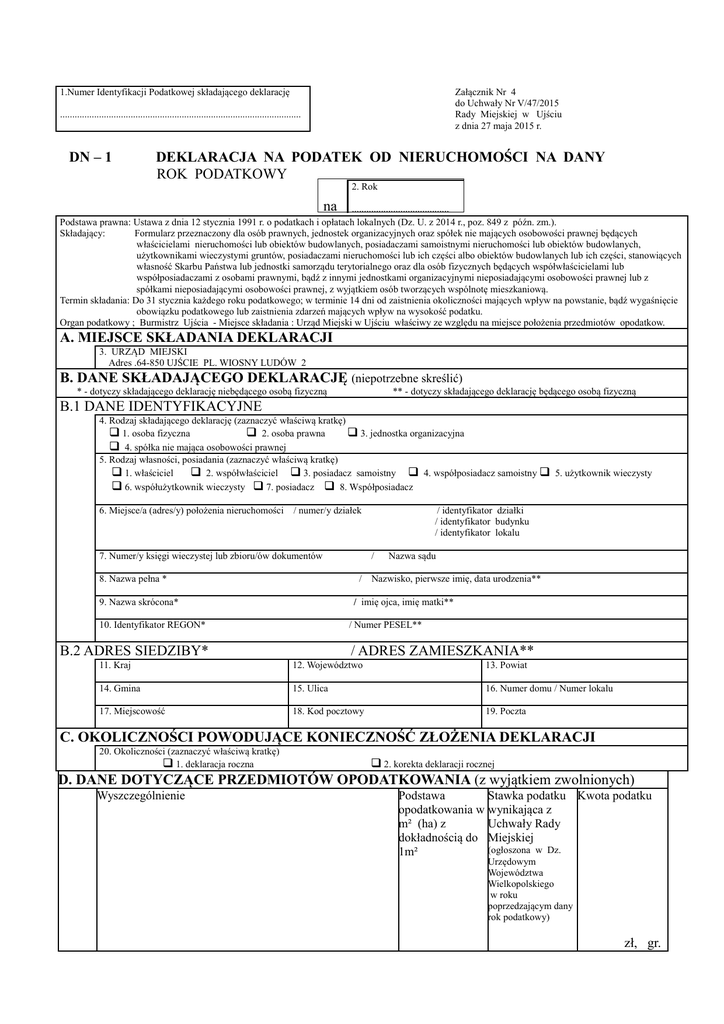 1.Numer Identyfikacji Podatkowej składającego deklarację Załącznik Nr 4 do Uchwały Nr V/47/2015 Rady Miejskiej w Ujściu z dnia 27 maja 2015 r. ................................................................................................... DN – 1 DEKLARACJA NA PODATEK OD NIERUCHOMOŚCI NA DANY ROK PODATKOWY 2. Rok na ........................................ Podstawa prawna: Ustawa z dnia 12 stycznia 1991 r. o podatkach i opłatach lokalnych (Dz. U. z 2014 r., poz. 849 z późn. zm.). Składający: Formularz przeznaczony dla osób prawnych, jednostek organizacyjnych oraz spółek nie mających osobowości prawnej będących właścicielami nieruchomości lub obiektów budowlanych, posiadaczami samoistnymi nieruchomości lub obiektów budowlanych, użytkownikami wieczystymi gruntów, posiadaczami nieruchomości lub ich części albo obiektów budowlanych lub ich części, stanowiących własność Skarbu Państwa lub jednostki samorządu terytorialnego oraz dla osób fizycznych będących współwłaścicielami lub współposiadaczami z osobami prawnymi, bądź z innymi jednostkami organizacyjnymi nieposiadającymi osobowości prawnej lub z spółkami nieposiadającymi osobowości prawnej, z wyjątkiem osób tworzących wspólnotę mieszkaniową. Termin składania: Do 31 stycznia każdego roku podatkowego; w terminie 14 dni od zaistnienia okoliczności mających wpływ na powstanie, bądź wygaśnięcie obowiązku podatkowego lub zaistnienia zdarzeń mających wpływ na wysokość podatku. Organ podatkowy ; Burmistrz Ujścia - Miejsce składania : Urząd Miejski w Ujściu właściwy ze względu na miejsce położenia przedmiotów opodatkow. A. MIEJSCE SKŁADANIA DEKLARACJI 3. URZĄD MIEJSKI Adres .64-850 UJŚCIE PL. WIOSNY LUDÓW 2 B. DANE SKŁADAJĄCEGO DEKLARACJĘ (niepotrzebne skreślić) * - dotyczy składającego deklarację niebędącego osobą fizyczną ** - dotyczy składającego deklarację będącego osobą fizyczną B.1 DANE IDENTYFIKACYJNE 4. Rodzaj składającego deklarację (zaznaczyć właściwą kratkę) 1. osoba fizyczna 2. osoba prawna 3. jednostka organizacyjna 4. spółka nie mająca osobowości prawnej 5. Rodzaj własności, posiadania (zaznaczyć właściwą kratkę) 1. właściciel 2. współwłaściciel 3. posiadacz samoistny 4. współposiadacz samoistny 5. użytkownik wieczysty 6. współużytkownik wieczysty 7. posiadacz 8. Współposiadacz 6. Miejsce/a (adres/y) położenia nieruchomości / numer/y działek 7. Numer/y księgi wieczystej lub zbioru/ów dokumentów 8. Nazwa pełna * / identyfikator działki / identyfikator budynku / identyfikator lokalu / Nazwa sądu / Nazwisko, pierwsze imię, data urodzenia** 9. Nazwa skrócona* / imię ojca, imię matki** 10. Identyfikator REGON* / Numer PESEL** B.2 ADRES SIEDZIBY* / ADRES ZAMIESZKANIA** 11. Kraj 12. Województwo 13. Powiat 14. Gmina 15. Ulica 16. Numer domu / Numer lokalu 17. Miejscowość 18. Kod pocztowy 19. Poczta C. OKOLICZNOŚCI POWODUJĄCE KONIECZNOŚĆ ZŁOŻENIA DEKLARACJI 20. Okoliczności (zaznaczyć właściwą kratkę) 1. deklaracja roczna 2. korekta deklaracji rocznej D. DANE DOTYCZĄCE PRZEDMIOTÓW OPODATKOWANIA (z wyjątkiem zwolnionych) Wyszczególnienie Podstawa Stawka podatku Kwota podatku opodatkowania w wynikająca z m² (ha) z Uchwały Rady dokładnością do Miejskiej (ogłoszona w Dz. 1m² Urzędowym Województwa Wielkopolskiego w roku poprzedzającym dany rok podatkowy) zł, gr. zł, gr. D.1 POWIERZCHNIA GRUNTÓW 1. związanych z prowadzeniem działalności gospodarczej, bez względu na sposób zakwalifikowania w ewidencji gruntów i budynków 2. pod jeziorami, zajętych na zbiorniki wodne retencyjne lub elektrowni wodnych 3. pozostałe, w tym zajęte na prowadzenie odpłatnej statutowej działalności pożytku publicznego przez organizacje pożytku publicznego 21. 22. 23. ................... m2 24. .................,....... 25. .................,....... 26. .................... ha 27. .................,....... 28. .................,....... 29. ................... m2 .................,....... .................,....... D.2 POWIERZCHNIA UŻYTKOWA BUDYNKÓW LUB ICH CZĘŚCI (*) 1. mieszkalnych – ogółem 30. ................... m2 w tym: 33. - kondygnacji o wysokości od 1,40 do 2,20 m (zaliczyć 50% powierzchni) ........................... m2 31. .................,....... 32. .................,....... 34. ........................,........ ........................,........ * Do powierzchni użytkowej budynku lub jego części należy zaliczyć powierzchnię mierzoną, po wewnętrznej długości ścian na wszystkich kondygnacjach, z wyjątkiem powierzchni klatek schodowych oraz szybów dźwigowych. Za kondygnację uważa się również garaże podziemne, piwnice, sutereny i poddasza użytkowe. Powierzchnię pomieszczeń lub ich części oraz kondygnacji o wysokości w świetle od 1,40 do 2,20 m zalicza się do powierzchni użytkowej budynku w 50 % a jeżeli wysokości jest mniejsza niż 1,40 powierzchnię tę pomija się . 2. związanych z prowadzeniem działalności gospodarczej 36. oraz od budynków mieszkalnych lub ich części zajętych na prowadzenie działalności gospodarczej ogółem, ................... m2 w tym: - kondygnacji o wysokości od 1,40 do 2,20 m (zaliczyć 50% powierzchni) 3. zajęte na prowadzenie działalności gospodarczej w zakresie obrotu kwalifikowanym materiałem siewnym ogółem, w tym: - kondygnacji o wysokości od 1,40 do 2,20 m (zaliczyć 50% powierzchni) 5. pozostałych w tym zajętych na prowadzenie odpłatnej statutowej działalności pożytku publicznego przez organizacje pożytku publicznego 1) gospodarczych i innych / w tym kondygnacje o wysokości od 1,40 do 2,20 - do 50% pow./ - garaży 2) domów letniskowych i rekreacyjnych / w tym kondygnacji o wysokości od 1,40 do 2,20 m zaliczone w 50 % powierzchni / D.3 BUDOWLE 1. budowle lub ich części /wartość określona na podstawie art.4 ust.1 pkt.3 i ust. 3-7 / (wartość, o której mowa w