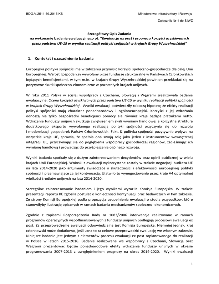 BDG.V.2511.59.2015.KS Ministerstwo Infrastruktury i Rozwoju Załącznik Nr 1 do SIWZ Szczegółowy Opis Zadania na wykonanie badania ewaluacyjnego pt. ”Ewaluacja ex post i prognoza korzyści uzyskiwanych przez państwa UE-15 w wyniku realizacji polityki spójności w krajach Grupy Wyszehradzkiej” 1. Kontekst i uzasadnienie badania Europejska polityka spójności ma w założeniu przynosić korzyści społeczno-gospodarcze dla całej Unii Europejskiej. Wzrost gospodarczy wywołany przez fundusze strukturalne w Państwach Członkowskich będących beneficjentami, w tym m.in. w krajach Grupy Wyszehradzkiej powinien przekładać się na pozytywne skutki społeczno-ekonomiczne w pozostałych krajach unijnych. W roku 2011 Polska w ścisłej współpracy z Czechami, Słowacją i Węgrami zrealizowała badanie ewaluacyjne: Ocena korzyści uzyskiwanych przez państwa UE-15 w wyniku realizacji polityki spójności w krajach Grupy Wyszehradzkiej. Wyniki ewaluacji potwierdziły roboczą hipotezę że efekty realizacji polityki spójności mają charakter ponadnarodowy i ogólnoeuropejski. Korzyści z jej wdrażania odnoszą nie tylko bezpośredni beneficjenci pomocy ale również kraje będące płatnikami netto. Wdrażanie funduszy unijnych skutkuje zwiększeniem skali wymiany handlowej a korzystna struktura dodatkowego eksportu wywołanego realizacją polityki spójności przyczynia się do rozwoju i modernizacji gospodarek Państw Członkowskich. Fakt, iż polityka spójności pozytywnie wpływa na wszystkie kraje UE, sprawia, że spełnia ona swoją rolę jako jeden z instrumentów wewnętrznej integracji UE, przyczyniając się do pogłębienia współpracy gospodarczej regionów, zacieśniając ich wymianę handlową i prowadząc do przyśpieszenia ogólnego rozwoju. Wyniki badania spotkały się z dużym zainteresowaniem decydentów oraz opinii publicznej w wielu krajach Unii Europejskiej. Wnioski z ewaluacji wykorzystane zostały w trakcie negocjacji budżetu UE na lata 2014-2020 jako argumenty świadczące o skuteczności i efektywności europejskiej polityki spójności i przemawiające za jej kontynuacją. Ułatwiło to wynegocjowanie przez kraje V4 optymalnej wielkości środków unijnych na lata 2014-2020. Szczególne zainteresowanie badaniem i jego wynikami wyraziła Komisja Europejska. W trakcie prezentacji raportu KE zgłosiła postulat o konieczności kontynuacji prac badawczych w tym zakresie. Ze strony Komisji Europejskiej padła propozycja uzupełnienia ewaluacji o studia przypadków, które stanowiłyby ilustrację opisanych w ramach badania mechanizmów społeczno- ekonomicznych. Zgodnie z zapisami Rozporządzenia Rady nr 1083/2006 interwencje realizowane w ramach programów operacyjnych współfinansowanych z funduszy unijnych podlegają procesowi ewaluacji ex post. Za przeprowadzenie ewaluacji odpowiedzialna jest Komisja Europejska. Niemniej jednak, kraj członkowski może dodatkowo, jeśli uzna to za celowe przeprowadzić ewaluację we własnym zakresie. Niniejsze badanie jest jednym z elementów procesu ewaluacji ex post zaplanowanego do realizacji w Polsce w latach 2015-2016. Badanie realizowane we współpracy z Czechami, Słowacją oraz Węgrami prezentować będzie ponadnarodowe efekty wdrażania funduszy unijnych w okresie programowania 2007-2013 z uwzględnieniem prognozy na okres 2014-2020. Wyniki ewaluacji 1 BDG.V.2511.59.2015.KS Ministerstwo Infrastruktury i Rozwoju Załącznik Nr 1 do SIWZ wykorzystane zostaną m.in. na potrzeby dyskusji w trakcie zaplanowanego na rok 2016 przeglądu śródokresowego Wieloletnich Ram Finansowych na lata 2014-2020. 2. Cele i zakres badania Głównym celem badania jest oszacowanie wpływu realizacji polityki spójności w krajach Grupy Wyszehradzkiej na gospodarki państw UE-15 (tzw. „starej Unii”), w tym w szczególności państw będących płatnikami netto. Cel główny realizowany będzie poprzez osiągnięcie następujących celów szczegółowych: I. Oszacowanie korzyści makroekonomicznych uzyskiwanych przez kraje UE-15 w postaci dodatkowego eksportu wywołanego realizacją polityki spójności w krajach V4. II. Oszacowanie korzyści bezpośrednich uzyskiwanych przez firmy z krajów UE-15 w postaci wynagrodzenia za dobra i usługi dostarczane na potrzeby projektów realizowanych w krajach V4 w ramach polityki spójności. III. Stworzenie typologii pozytywnych efektów zewnętrznych realizacji polityki spójności w krajach V4 oraz prezentacja studiów przypadków ilustrujących poszczególne rodzaje korzyści. Badanie powinno udzielić odpowiedzi na następujące główne pytania ewaluacyjne: Cel I: Korzyści makroekonomiczne 1. Jaka jest wartość dodatkowego eksportu w krajach UE-15 wywołanego realizacją polityki spójności w krajach Grupy Wyszehradzkiej? 2. Jaka jest struktura sektorowa dodatkowego eksportu w krajach UE-15 wywołanego realizacją polityki spójności w krajach Grupy Wyszehradzkiej? 3. Jaki jest stosunek korzyści z dodatkowego eksportu do kosztów ponoszonych przez poszczególne kraje UE-15 na rzecz polityki spójności realizowanej w krajach Grupy Wyszehradzkiej? Cel II: Korzyści bezpośrednie 4. Jaka jest wartość korzyści uzyskiwanych w postaci wynagrodzenia za dostarczane dobra i usługi przez firmy zagraniczne z poszczególnych krajów UE-15 będące wykonawcami i/lub dostawcami w ramach projektów realizowanych w krajach Grupy Wyszehradzkiej? 2 BDG.V.2511.59.2015.KS Ministerstwo Infrastruktury i Rozwoju Załącznik Nr 1 do SIWZ 5. Jaka liczba firm z poszczególnych krajów UE-15 jest wykonawcami i/lub dostawcami dóbr i usług dostarczanych na potrzeby projektów realizowanych w krajach Grupy Wyszehradzkiej? Cel III: Typologia korzyści i studia przypadków 6. Jakie są rodzaje i mechanizmy korzyści społeczno-ekonomicznych odnoszonych przez kraje UE-15 w postaci pozytywnych efektów zewnętrznych interwencji publicznych realizowanych w ramach polityki spójności w krajach Grupy Wysze