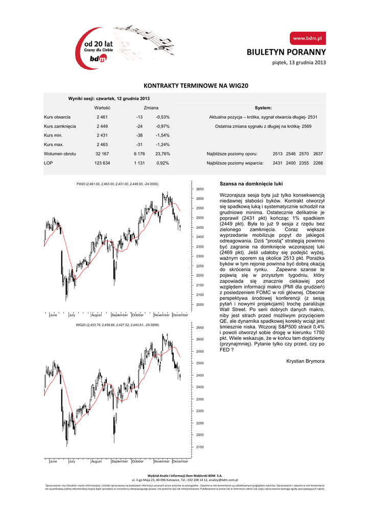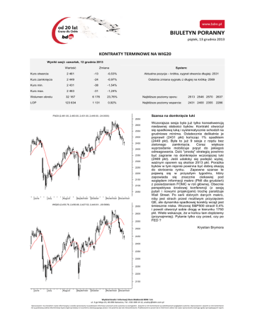 BIULETYN PORANNY piątek, 13 grudnia 2013 KONTRAKTY TERMINOWE NA WIG20 Wyniki sesji: czwartek, 12 grudnia 2013 Wartość Zmiana System: Kurs otwarcia 2 461 -13 -0,53% Aktualna pozycja – krótka, sygnał otwarcia długiej- 2531 Kurs zamknięcia 2 449 -24 -0,97% Ostatnia zmiana sygnału z długiej na krótką- 2569 Kurs min. 2 431 -38 -1,54% Kurs max. 2 463 -31 -1,24% Wolumen obrotu 32 167 6 176 23,76% LOP 123 634 1 131 0,92% Najbliższe poziomy oporu: 2513 2546 2570 2637 Najbliższe poziomy wsparcia: 2431 2400 2355 2286 Szansa na domknięcie luki FW20 (2,461.00, 2,463.00, 2,431.00, 2,449.00, -24.0000) 2650 2550 Wczorajsza sesja była już tylko konsekwencją niedawnej słabości byków. Kontrakt otworzył się spadkową luką i systematycznie schodził na grudniowe minima. Ostatecznie delikatnie je poprawił (2431 pkt) kończąc 1% spadkiem (2449 pkt). Była to już 9 sesja z rzędu bez zielonego zamknięcia. Coraz większe wyprzedanie mobilizuje popyt do jakiegoś odreagowania. Dziś "prostą" strategią powinno być zagranie na domknięcie wczorajszej luki (2469 pkt). Jeśli udałoby się podejść wyżej, ważnym oporem są okolice 2513 pkt. Porażka byków w tym rejonie powinna być dobrą okazją do skrócenia rynku. Zapewne szanse te pojawią się w przyszłym tygodniu, który zapowiada się znacznie ciekawiej pod względem informacji makro (PMI dla grudzień) z posiedzeniem FOMC w roli głównej. Obecnie perspektywa środowej konferencji (z sesją pytań i nowymi projekcjami) trochę paraliżuje Wall Street. Po serii dobrych danych makro, niby jest strach przed możliwym przycięciem QE, ale dynamika spadkowej korekty wciąż jest śmiesznie niska. Wczoraj S&P500 stracił 0,4% i powoli otworzył sobie drogę w kierunku 1750 pkt. Wiele wskazuje, że w końcu tam dojdziemy (przynajmniej). Pytanie tylko czy przed, czy po FED ? 2500 Krystian Brymora 2600 2550 2500 2450 2400 2350 2300 2250 2200 2150 2100 2050 June July August September October November December WIG20 (2,453.76, 2,456.66, 2,427.52, 2,440.61, -29.5898) 2650 2600 2450 2400 2350 2300 2250 2200 2150 June July August September October November December Wydział Analiz i Informacji Dom Maklerski BDM S.A. ul. 3‐go Maja 23, 40‐096 Katowice, Tel.: 032 208 14 12, [email protected] Opracowanie ma charakter czysto informacyjny i zostało opracowany na podstawie informacji uznanych przez autorów za wiarygodne . Zawarte w nim komentarze są subiektywnymi poglądami autorów. Opracowanie i zawarte w nim komentarze nie są podstawą żadnej rekomendacji kupna bądź sprzedaży w rozumieniu obowiązującego prawa i nie powinny być tak interpretowane. Publikowanie w prasie lub w Internecie całości lub części opracowania wymaga zgody sporządzających raport. BIULETYN PORANNY piątek, 13 grudnia 2013 RYNEK AKCJI Wyniki sesji: czwartek, 12 grudnia 2013 52 tygodnie Indeks Kurs otwarcia Kurs zamknięcia Zmiana [%] Kurs min. Kurs max. Zakres wahań Wartość obrotów [mln PLN] Kurs max. Kurs min. WIG20 2 634,2 2 150,8 2 453,76 2 440,61 -1,20% 2 427,52 2 456,66 29,1 800,7 WIG30 2 764,4 2 520,1 2 590,48 2 573,17 -1,27% 2 561,19 2 590,48 29,3 665,8 sWIG80 15 156,8 10 183,5 14 539,94 14 381,36 -1,28% 14 233,75 14 540,90 307,2 55,8 mWIG40 3 599,3 2 453,4 3 415,28 3 371,13 -1,76% 3 363,37 3 415,28 51,9 100,4 WIG-PL 56 438,7 43 438,1 53 182,30 53 071,50 -1,33% 53 071,50 53 182,30 110,8 - WIG 55 384,8 42 842,1 52 357,87 51 947,96 -1,32% 51 749,77 52 357,87 608,1 800,7 Spółka Cena [PLN] Mkt Cap [mln PLN] ALIOR BANK 78,00 ASSECOPOL AZOTY TARNÓW zmiana % zmiana % względem WIG30 dzienna 1M 3M 6M dzienna 1M 3M 6M 4 959 0,4% 3,5% -12,8% -10,0% 1,7% 5,2% -15,1% -10,0% 46,90 3 893 -1,6% -8,7% -0,4% 6,8% -0,3% -7,0% -2,8% 6,9% 66,90 6 636 -3,3% -13,4% -7,7% -12,1% -2,0% -11,7% -10,1% -12,1% BANK HANDLOWY 111,45 14 562 -1,8% -3,6% 5,8% 18,5% -0,5% -1,9% 3,5% 18,6% BOGDANKA 133,60 4 544 -2,1% 4,4% 21,2% 12,1% -0,8% 6,1% 18,9% 12,1% BORYSZEW 0,54 1 188 -1,8% 3,8% 3,8% 20,0% -0,6% 5,6% 1,5% 20,0% BRE 504,00 21 256 0,8% -0,2% 16,8% 31,3% 2,1% 1,5% 14,5% 31,3% BZ WBK 386,00 36 108 -1,9% 7,1% 20,4% 32,2% -0,6% 8,8% 18,1% 32,2% CCC 113,50 4 358 -2,1% -3,8% 9,1% 36,7% -0,8% -2,1% 6,8% 36,8% CYFROWY POLSAT 19,60 6 828 -1,7% -12,4% -10,4% 2,9% -0,4% -10,7% -12,8% 2,9% ENEA 14,73 6 502 -3,0% 0,4% 2,8% 1,9% -1,7% 2,1% 0,4% 2,0% EUROCASH 45,40 6 282 2,0% -7,6% -10,9% -21,7% 3,3% -5,9% -13,2% -21,7% -13,4% GTC 7,90 2 523 -0,1% -0,1% 9,4% -13,4% 1,1% 1,6% 7,1% ING BSK 113,00 14 701 -3,4% -1,7% 6,8% 14,1% -2,2% 0,0% 4,5% 14,2% JSW 60,87 7 147 1,1% -2,1% -20,8% -22,2% 2,4% -0,4% -23,1% -22,1% KERNEL 37,25 2 968 -3,3% -13,5% -28,9% -30,4% -2,0% -11,8% -31,3% -30,3% KGHM 113,85 22 770 -1,9% -0,3% -8,2% -24,7% -0,6% 1,4% -10,5% -24,6% LOTOS 36,44 4 733 -2,3% -4,4% -0,2% -12,6% -1,0% -2,7% -2,5% -12,5% 8 799,95 16 114 -0,7% -1,1% 12,8% 25,2% 0,6% 0,6% 10,5% 25,2% NETIA 5,01 1 743 -2,7% -4,2% 2,7% 13,1% -1,5% -2,5% 0,3% 13,1% PEKAO 181,90 47 743 -1,0% -1,9% 6,4% 9,4% 0,2% -0,2% 4,0% 9,5% PGE 16,90 31 599 0,7% -6,9% -0,8% -3,9% 2,0% -5,2% -3,2% -3,9% PGNIG 5,24 30 916 -1,9% -6,9% -14,8% -14,7% -0,6% -5,2% -17,1% -14,6% PKNORLEN 44,50 19 033 -0,4% 3,4% 3,2% -15,3% 0,8% 5,1% 0,9% -15,3% PKOBP 40,00 50 000 -0,4% 1,3% 5,7% 7,2% 0,9% 3,0% 3,3% 7,3% PZU 453,60 39 169 -3,3% 0,8% 7,4% 3,3% -2,0% 2,5% 5,1% 3,4% SYNTHOS 5,09 6 735 -1,2% -1,9% -2,5% 1,6% 0,1% -0,2% -4,8% 1,6% TAURON 4,61 8 079 -1,9% -9,6% -1,1% 7,0% -0,6% -7,9% -3,4% 7,0% TPSA 9,66 12 677 -0,8% -2,9% 23,8% 18,7% 0,4% -1,2% 21,5% 18,7% TVN 15,00 5 195 -3,2% -0,1% 14,5% 37,7% -2,0% 1,6% 12,2% 37,8% LPP Wydział Analiz i Informacji Dom Maklerski BDM S.A. ul. 3‐go Maja 23, 40‐096 Katowice, Tel.: 032 208 14 12, [email protected] Opracowanie ma charakter czysto informacyjny i zostało opracowany na podstawie informacji uznanych przez autorów za wiarygodne . Zawarte w nim komentarze są subiektywnymi poglądami autorów. Opracowanie i zawarte w nim komentarze nie są podstawą żadnej rekomendacji kupna bądź spr