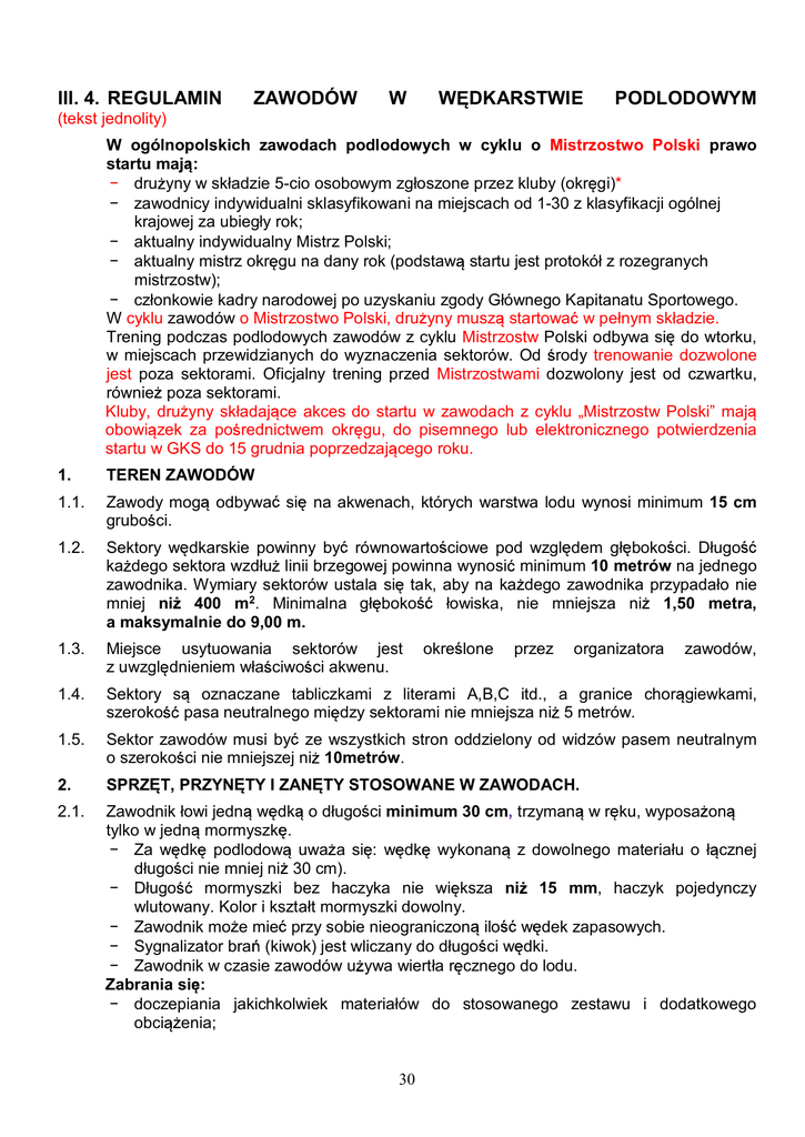 III. 4. REGULAMIN ZAWODÓW W W DKARSTWIE PODLODOWYM (tekst jednolity) W ogólnopolskich zawodach podlodowych w cyklu o Mistrzostwo Polski prawo startu maj : − dru yny w składzie 5-cio osobowym zgłoszone przez kluby (okr gi)* − zawodnicy indywidualni sklasyfikowani na miejscach od 1-30 z klasyfikacji ogólnej krajowej za ubiegły rok; − aktualny indywidualny Mistrz Polski; − aktualny mistrz okr gu na dany rok (podstaw startu jest protokół z rozegranych mistrzostw); − członkowie kadry narodowej po uzyskaniu zgody Głównego Kapitanatu Sportowego. W cyklu zawodów o Mistrzostwo Polski, dru yny musz startowa w pełnym składzie. Trening podczas podlodowych zawodów z cyklu Mistrzostw Polski odbywa si do wtorku, w miejscach przewidzianych do wyznaczenia sektorów. Od rody trenowanie dozwolone jest poza sektorami. Oficjalny trening przed Mistrzostwami dozwolony jest od czwartku, równie poza sektorami. Kluby, dru yny składaj ce akces do startu w zawodach z cyklu „Mistrzostw Polski” maj obowi zek za po rednictwem okr gu, do pisemnego lub elektronicznego potwierdzenia startu w GKS do 15 grudnia poprzedzaj cego roku. 1. TEREN ZAWODÓW 1.1. Zawody mog odbywa si na akwenach, których warstwa lodu wynosi minimum 15 cm grubo ci. 1.2. Sektory w dkarskie powinny by równowarto ciowe pod wzgl dem gł boko ci. Długo ka dego sektora wzdłu linii brzegowej powinna wynosi minimum 10 metrów na jednego zawodnika. Wymiary sektorów ustala si tak, aby na ka dego zawodnika przypadało nie mniej ni 400 m2. Minimalna gł boko łowiska, nie mniejsza ni 1,50 metra, a maksymalnie do 9,00 m. 1.3. Miejsce usytuowania sektorów jest z uwzgl dnieniem wła ciwo ci akwenu. 1.4. Sektory s oznaczane tabliczkami z literami A,B,C itd., a granice chor giewkami, szeroko pasa neutralnego mi dzy sektorami nie mniejsza ni 5 metrów. 1.5. Sektor zawodów musi by ze wszystkich stron oddzielony od widzów pasem neutralnym o szeroko ci nie mniejszej ni 10metrów. 2. SPRZ T, PRZYN TY I ZAN TY STOSOWANE W ZAWODACH. 2.1. Zawodnik łowi jedn w dk o długo ci minimum 30 cm, trzyman w r ku, wyposa on tylko w jedn mormyszk . − Za w dk podlodow uwa a si : w dk wykonan z dowolnego materiału o ł cznej długo ci nie mniej ni 30 cm). − Długo mormyszki bez haczyka nie wi ksza ni 15 mm, haczyk pojedynczy wlutowany. Kolor i kształt mormyszki dowolny. − Zawodnik mo e mie przy sobie nieograniczon ilo w dek zapasowych. − Sygnalizator bra (kiwok) jest wliczany do długo ci w dki. − Zawodnik w czasie zawodów u ywa wiertła r cznego do lodu. Zabrania si : − doczepiania jakichkolwiek materiałów do stosowanego zestawu i dodatkowego obci enia; 30 okre lone przez organizatora zawodów, 2.2. − stosowania echosond, kamer podlodowych w czasie oficjalnego treningu i trwania zawodów; − u ywanie rodków ł czno ci (np. telefonów, radiotelefonów itp.) w czasie trwania tur zawodów; − u ywania przyn t p czkowanych oraz przyklejanych do haczyka; − stosowania mechanicznych wierteł. W czasie zawodów dozwolone jest stosowanie dowolnych przyn t i zan t, oprócz ywych, martwych i sztucznych rybek oraz ich cz ci, jak równie ikry ryb i jaj mrówek. a) Zan t mo na u ywa bez wykorzystania zan tników stacjonarnych. Limit dla jednej tury u ywanych zan t wynosi maksymalnie do 2-ch litrów. Zan ta przy pomiarze obj to ci mo e by w stanie sypkim wraz z ziemi , glin , wirem, piaskiem, ziarnami itp. i innymi dodatkami, które nie stanowi zagro enia dla fauny i rodowiska wodnego. Zan ta musi by przedstawiona do kontroli w pudełkach ( butelkach) z fabrycznym oznaczeniem pojemno ci. Pudełka (butelki) musz by zamkni te bez u ycia dodatkowych elementów podtrzymuj cych zamkni cie. b) Limit przyn ty dla jednej tury wynosi maksymalnie 1,5 litra (robaki nierozproszone bez jakichkolwiek dodatków) musz by przedstawione do kontroli w pudełkach z fabrycznym oznaczeniem pojemno ci zgodnie z przepisami „FIPSed”. Jokers i ochotka (1 litr) mog by przedstawione do kontroli w dwóch pudełkach (np. ¼ ochotki w pudełku 0,25 l i ¾ jokersa w pudełku 0,75 l), oraz 0,5 litra innych robaków. Pudełka musz by zamkni te, bez u ycia dodatkowych elementów podtrzymuj cych zamkni cie. Inna forma prezentacji zan ty lub przyn ty podczas kontroli b dzie sankcjonowana trzema punktami karnymi w klasyfikacji sektorowej. 2.3. Kontrolne sprawdzenie ilo ci przygotowanej zan ty i przyn ty przeprowadza upowa niona komisja techniczna nie pó niej ni na 20 minut przed pierwszym sygnałem zawodów w miejscach ustalonych w czasie odprawy technicznej. Po kontroli przyn ty i zan ty kontrolowani zawodnicy musz przej do pasa neutralnego. Stwierdzone w czasie kontroli nadwy ki zan t i przyn t zostaj zabrane przez Komisj Techniczn . Organizator po konsultacji z GKS mo e zmniejszy limit u ywanych zan t i przyn t, informuj c o tym w Komunikacie Nr1. 2.4. Otwory w lodzie wolno wykonywa wył cznie widrem r cznym o maksymalnej rednicy do 20 cm. Dopuszcza si stosowanie haka do „l dowania” ryb wył cznie w przypadku ryb przewidzianych do zabrania. wider na stanowisku musi znajdowa si w pozycji pionowej no em w dół (wkr cony w lód). 2.5. Ka dy zawodnik i s dzia musi by wyposa ony w zabezpieczenia antypo lizgowe. 2.6. Organizator ma obowi zek wyposa y ka dego s dziego w link zako czon rzutka o długo ci minimum 10 m. 3. ORGANIZACJA I PRZEBIEG ZAWODÓW 3.1. Zawody mog by rozgrywane w klasyfikacji indywidualnej i dru ynowej bez podziału na kategorie. 3.2. Dopuszcza si rozgrywanie dwóch tur zawodów jednego dnia (w zwodach z cyklu Mistrzostw Polski decyzj w powy szej sprawie podejmuje Prezydium GKS). 3.3. Zawody trzyturowe, dwuturowe, jedno i wielosektorowe mog by rozgrywane na tym samym łowisku lub na ró nych łowiskach. W zawodach wieloturowych stosuje si ponowne losowanie sektorów na ka d z tur. 3.4. Organizator zawodów zapewnia ka demu zawodnikowi po dwie chor giewki do oznaczania otworu w lodzie (otworem nazywamy odwiert na wylot w lodzie), z numerami 31 aseku