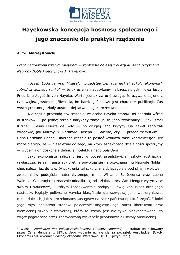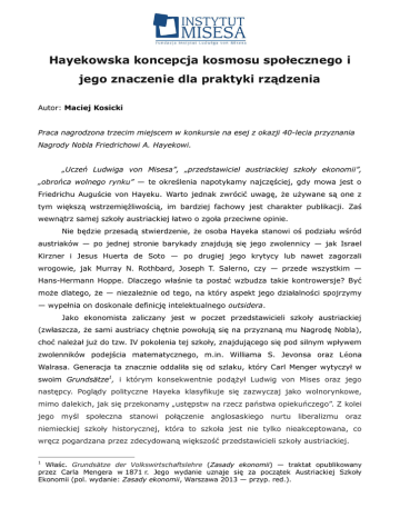 Hayekowska koncepcja kosmosu społecznego i jego znaczenie dla praktyki rządzenia Autor: Maciej Kosicki Praca nagrodzona trzecim miejscem w konkursie na esej z okazji 40-lecia przyznania Nagrody Nobla Friedrichowi A. Hayekowi. „Uczeń Ludwiga von Misesa”, „przedstawiciel austriackiej szkoły ekonomii”, „obrońca wolnego rynku” — te określenia napotykamy najczęściej, gdy mowa jest o Friedrichu Auguście von Hayeku. Warto jednak zwrócić uwagę, że używane są one z tym większą wstrzemięźliwością, im bardziej fachowy jest charakter publikacji. Zaś wewnątrz samej szkoły austriackiej łatwo o zgoła przeciwne opinie. Nie będzie przesadą stwierdzenie, że osoba Hayeka stanowi oś podziału wśród austriaków — po jednej stronie barykady znajdują się jego zwolennicy — jak Israel Kirzner i Jesus Huerta de Soto — po drugiej jego krytycy lub nawet zagorzali wrogowie, jak Murray N. Rothbard, Joseph T. Salerno, czy — przede wszystkim — Hans-Hermann Hoppe. Dlaczego właśnie ta postać wzbudza takie kontrowersje? Być może dlatego, że — niezależnie od tego, na który aspekt jego działalności spojrzymy — wypełnia on doskonale definicję intelektualnego outsidera. Jako ekonomista zaliczany jest w poczet przedstawicieli szkoły austriackiej (zwłaszcza, że sami austriacy chętnie powołują się na przyznaną mu Nagrodę Nobla), choć należał już do tzw. IV pokolenia tej szkoły, znajdującego się pod silnym wpływem zwolenników podejścia matematycznego, m.in. Williama S. Jevonsa oraz Léona Walrasa. Generacja ta znacznie oddaliła się od szlaku, który Carl Menger wytyczył w swoim Grundsätze1, i którym konsekwentnie podążył Ludwig von Mises oraz jego następcy. Poglądy polityczne Hayeka klasyfikuje się zazwyczaj jako wolnorynkowe, mimo dalekich, jak się przekonamy „ustępstw na rzecz państwa opiekuńczego”. Z kolei jego myśl społeczna stanowi połączenie anglosaskiego nurtu liberalizmu oraz niemieckiej szkoły historycznej, która to szkoła jest nie tylko nieakceptowana, co wręcz pogardzana przez zdecydowaną większość przedstawicieli szkoły austriackiej. 1 Właśc. Grundsätze der Volkswirtschaftslehre (Zasady ekonomii) — traktat opublikowany przez Carla Mengera w 1871 r. Jego wydanie uznaje się za początek Austriackiej Szkoły Ekonomii (pol. wydanie: Zasady ekonomii, Warszawa 2013 — przyp. red.). Gdy Hayek odbierał w 1974 r. Nagrodę Nobla, centrum jego zainteresowań już od niemal ćwierćwiecza stanowiła socjologia. W tym okresie powstała koncepcja mikrokosmosu społecznego, która miała stać się kluczowym elementem jego największych dzieł, lecz także przyczyną wyalienowania w kręgach, z których się wywodził. Konflikt dwóch tradycji Koncepcja ta nie narodziła się w próżni. By uchwycić ją we właściwym świetle, nie wolno zapomnieć o wielkim konflikcie intelektualnym, który inspirował Hayeka. Mowa tu o sporze pomiędzy tym, co on sam nazywał dwiema różnymi tradycjami teorii wolności: francuską — spekulatywną i racjonalistyczną — oraz anglosaską — empirystyczną i niesystematyczną2. Pierwszą z tych tradycji, zdaniem noblisty, daje się podsumować krótko: starała się konstruować utopię3. Nadał jej miano „scjentyzmu”, a za „stolicę” uznał paryską l'Ecole Polytechnique. To tam swoje nauki pobierali m.in. hrabia Henry de Saint Simone oraz Augustus Comte, których postaciom, jako najbardziej zasłużonym przedstawicielom tego nurtu, poświęcił Hayek zasadniczą część swojego Nadużycia rozumu. Być może sam Hayek przyznałby, że istotę scjentyzmu najlepiej ujęli dwaj inni sławni przedstawiciele szkoły austriackiej, Murray N. Rothbard oraz Ludwig von Mises. Ten pierwszy, z charakterystycznym dla siebie zacięciem, określił scjentyzm jako „ideę, zgodnie z którą jedynym prawdziwie „naukowym” podejściem do badań nad człowiekiem jest małpowanie metod nauk przyrodniczych, a w szczególności ich gałęzi cieszącej się największym prestiżem — fizyki.4” Mises z kolei posłużył się alegorią, porównując scjentyzm w ekonomii do teorii spiskowych — ich celem jest upraszczanie świata dla tych, którzy nie są w stanie pojąć jego złożoności. Tak, jak dla zwolennika teorii spiskowych spiritus movens wszelkich procesów dziejowych są np. masoni, tak dla scjentysty wspólnym mianownikiem, do którego należy sprowadzić wszelkie badania, jest matematyka. Credo scjentystów wyłożył Nicolas de Condorcet. Sformułował on ideał obserwatora, któremu zjawiska fizyczne i społeczne jawiłyby się w tym samym świetle, ponieważ „będąc obcym naszej rasie, badałby ludzkie społeczeństwo tak, jak 2 F.A. Hayek, Konstytucja wolności, str. 65, Wydawnictwo Naukowe PWN, Warszawa 2012. Ibid. 4 Murray N. Rothbard, Przedmowa w: Ludwig von Mises, Teoria a historia, str. XIV, XV, Wydawnictwo Naukowe PWN, Instytut Ludwiga von Misesa, Warszawa 2012. 3 my badamy społeczeństwa mrówek i pszczół” i nawoływał do „wprowadzania do nauk moralnych filozofii i metody nauk przyrodniczych”5. Wiedza tak zgromadzona mogłaby zostać wykorzystana do niemal plastycznego modelowania otaczającej człowieka rzeczywistości w taki sposób, w jaki matematyk podstawia dowolne wartości pod określone we wzorze zmienne. Możliwe byłoby wyeliminowanie wszelkiej niepewności towarzyszącej ludzkiemu działaniu, tak samo jak każdego przejawu niegospodarności. Zniknęłyby problemy niedostatku, ponieważ proces produkcji i dystrybucji dóbr mógłby zostać zorganizowany tak, by służyć jednocześnie wszystkim członkom społeczności. Chaos dnia dzisiejszego zostałby więc zastąpiony przez ład i harmonię jutra. Znaczną część swoich poglądów sformułował Hayek właśnie w opozycji do scjentyzmu. Uważał go za efekt „prawa bezwładu” — metody badawcze, za pomocą których udało się osiągnąć sukcesy w jednej dziedzinie 