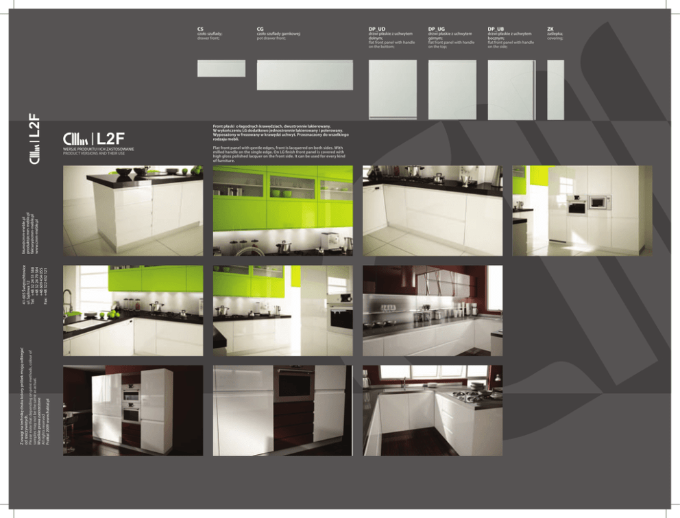 CS L2F czoło szuflady; drawer front; L2F Z uwagi na technikę druku kolory próbek mogą odbiegać od rzeczywistych. Please note that depending on print methods, colour of samples may not be the same as actual. Wszelkie prawa zastrzeżone All rights reserved Fraktal 2009 www.fraktal.pl 41-605 Świętochłowice ul. Sądowa 12 Tel: +48 32 24 51 588 +48 32 24 79 584 +48 609 454 055 Fax: +48 322 452 121 [email protected] [email protected] [email protected] www.cmm-meble.pl WERSJE PRODUKTU I ICH ZASTOSOWANIE PRODUCT VERSIONS AND THEIR USE CG czoło szuflady garnkowej; pot drawer front; Front płaski o łagodnych krawędziach, dwustronnie lakierowany. W wykończeniu LG dodatkowo jednostronnie lakierowany i polerowany. Wyposażony w frezowany w krawędzi uchwyt. Przeznaczony do wszelkiego rodzaju mebli. Flat front panel with gentle edges, front is lacquered on both sides. With milled handle on the single edge. On LG finish front panel is covered with high gloss polished lacquer on the front side. It can be used for every kind of furniture. DP_UD drzwi płaskie z uchwytem dolnym; flat front panel with handle on the bottom; DP_UG drzwi płaskie z uchwytem górnym; flat front panel with handle on the top; DP_UB drzwi płaskie z uchwytem bocznym; flat front panel with handle on the side; ZK zaślepka; covering; L2F Front płaski o łagodnych krawędziach, dwustronnie lakierowany. W wykończeniu LG dodatkowo jednostronnie lakierowany i polerowany. Wyposażony w frezowany w krawędzi uchwyt. Przeznaczony do wszelkiego rodzaju mebli. Flat front panel with gentle edges, front is lacquered on both sides. With milled handle on the single edge. On LG finish front panel is covered with high gloss polished lacquer on the front side. It can be used for every kind of furniture. Konstrukcja produktu: Front płaski o konstrukcji płytowej, z wyfrezowanym uchwytem na krawędzi, lakierowany. Product structure: Flat front panel made of MDF with milled handle on the edge, lacquered. Materiał i wykończenie produktu: MDF pokryty lakierami poliuretanowymi matowymi lub wykończonymi na wysoki połysk przez polerowanie. Oznaczenie wg Tabeli WYKOŃCZENIE lub wg Skali NCS. Product material and colour: MDF covered with polyurethane mat or high gloss polished lacquer. Check symbol according to COLOUR TABLE or NCS scale. Symbol wersji / Version symbol L2F Wysokość / Height min CS CG DP_UG 130 Wysokość / Height max 252 Szerokość / Width min Szerokość / Width max 100 1000 253 400 100 1000 401 1500 100 700 ZK 100 1500 100 253 DP_UD DP_UB 401 1500 100 700 401 1500 130 700 Odstępstwa / uwagi do wersji Exceptions / version comments Bez uchwytu na krawędzi Without milled handle on the edge Dedykowane elementy wykończeniowe, uzupełniające i dodatki: Dedicated finishing and supplementary hardware and accessories: Szczegółowe dane techniczne, szkice, zdjęcia, dostępne są w karcie katalogowej DODATKI oraz na stronie internetowej. Detailed technical data, sketches and pictures are available on catalouge page - ACCESSORIES and on our website. Listwa wykończeniowa uniwersalna Versatile finishing lath UML L_1200 L_2400 Listwa cokołowa niska Low plinth LCN.16 L_1200 L_2400 Listwa cokołowa wysoka High plinth LCW.16 L_1200 L_2400 Elementy korpusu / * Furniture board /* CML T_6 T_16 /* Typ produktu / Product type Dostępne wersje produktu i zakresy wymiarowe (szczegółowy opis w karcie katalogowej DODATKI) / Available product versions and range of measurments (Check detailed description on catalogue page ACCESSORIES) Lakierowane elementy korpusu są dostępne wyłącznie w lakierze matowym. Lacquered furniture boards are available only in mat lacquer. TABELA DOSTĘPNE WYKOŃCZENIA PRODUKTU (pomoce: próbniki płytkowe CMm_PPL i CMm_PPW) AVAILABLE COLOURS OF PRODUCT TABLE (aids: sample plates CMm_ PPL and CMm_ PPW) Produkt dostępny w kilku kolorach standardowych (wg próbnika płytkowego CMm_PPL) a także wg wzornika firmy ADLER: NCS_CASCADE 980 Product is available in some typical colours ( according to sample plates CMm_ PPL ) and also in custom colours according to ADLER: NCS_ CASCADE 980 templet. Z uwagi na technikę druku kolory próbek mogą odbiegać od rzeczywistych. Please note that depending on print methods, colour of samples may not be the same as actual. Dystrybucję naszych produktów powierzyliśmy autoryzowanym SPRZEDAWCOM w kraju i za granicą. Ich adresy znajdziecie Państwo w tym katalogu i na stronie internetowej CMm. Polecamy ich wiedzę, znajomość asortymentu produktów oraz naszych możliwości i ograniczeń. Sale of our products has been entrusted to ours vendors in Poland and abroad. You will find their addresses in this catalogue and on our website. We recommend their knowledge about range of our products, our capabilities and confinements. Autoryzowany Sprzedawca produktów CMm: Authorized Vendor of CMm’s products: T_19