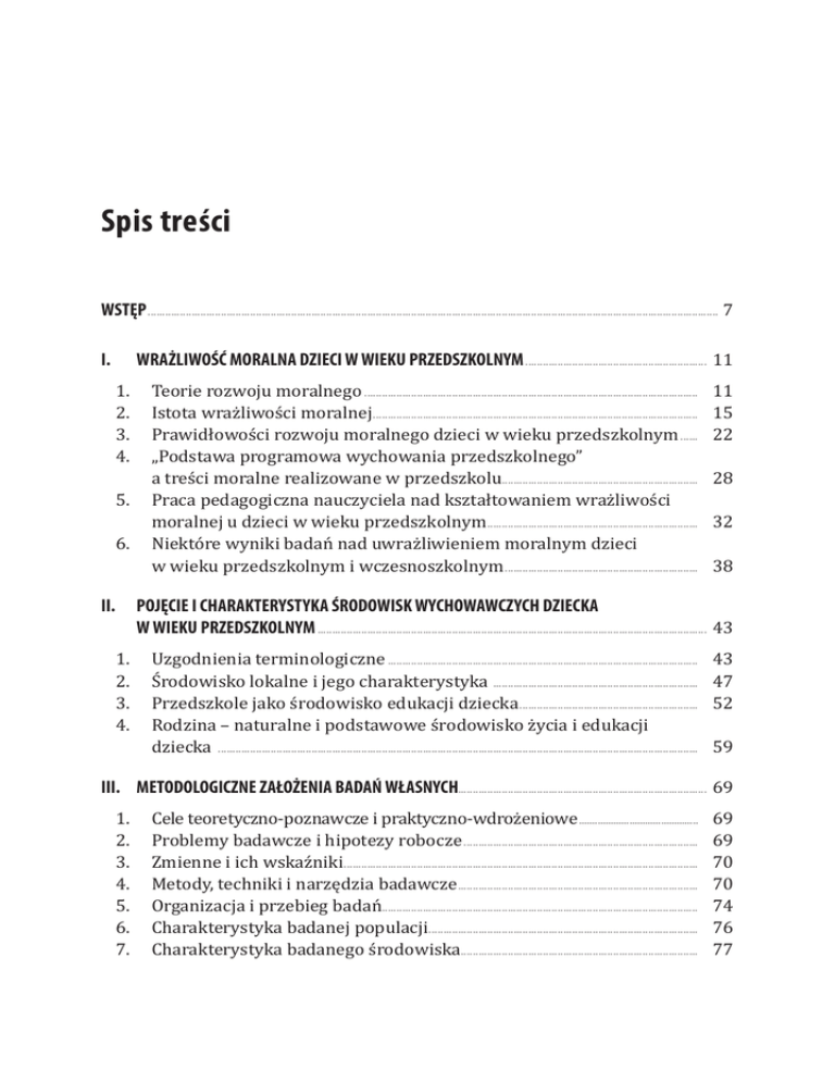 Spis treści WSTĘP.................................................................................................................................................................................................... 7 I. 1. 2. 3. 4. WRAŻLIWOŚĆ MORALNA DZIECI W WIEKU PRZEDSZKOLNYM............................................................... 11 Teorie rozwoju moralnego................................................................................................................... 11 Istota wrażliwości moralnej................................................................................................................ 15 Prawidłowości rozwoju moralnego dzieci w wieku przedszkolnym....... 22 „Podstawa programowa wychowania przedszkolnego” a treści moralne realizowane w przedszkolu................................................................... 28 5. Praca pedagogiczna nauczyciela nad kształtowaniem wrażliwości moralnej u dzieci w wieku przedszkolnym......................................................................... 32 6. Niektóre wyniki badań nad uwrażliwieniem moralnym dzieci w wieku przedszkolnym i wczesnoszkolnym................................................................... 38 II. POJĘCIE I CHARAKTERYSTYKA ŚRODOWISK WYCHOWAWCZYCH DZIECKA W WIEKU PRZEDSZKOLNYM...................................................................................................................................... 43 1. 2. 3. 4. Uzgodnienia terminologiczne........................................................................................................... 43 Środowisko lokalne i jego charakterystyka ....................................................................... 47 Przedszkole jako środowisko edukacji dziecka.............................................................. 52 Rodzina – naturalne i podstawowe środowisko życia i edukacji dziecka ..................................................................................................................................................................... 59 III. METODOLOGICZNE ZAŁOŻENIA BADAŃ WŁASNYCH..................................................................................... 69 1. 2. 3. 4. 5. 6. 7. Cele teoretyczno-poznawcze i praktyczno-wdrożeniowe.............................................. 69 Problemy badawcze i hipotezy robocze................................................................................. 69 Zmienne i ich wskaźniki.......................................................................................................................... 70 Metody, techniki i narzędzia badawcze................................................................................... 70 Organizacja i przebieg badań............................................................................................................ 74 Charakterystyka badanej populacji............................................................................................. 76 Charakterystyka badanego środowiska.................................................................................. 77 IV. ŚRODOWISKO LOKALNE I JEGO WPŁYW NA WRAŻLIWOŚĆ MORALNĄ DZIECI KOŃCZĄCYCH EDUKACJĘ PRZEDSZKOLNĄ......................................................................................................... 79 1. Dostrzeganie problemów moralnych przez dzieci kończące edukację przedszkolną ze środowiska wielkomiejskiego, miejskiego i wiejskiego............................................................................................................................ 79 2. Odczuwanie potrzeby rozwiązywania problemów moralnych przez dzieci kończące edukację przedszkolną ze środowiska wielkomiejskiego, miejskiego i wiejskiego.......................................................................... 89 V. WPŁYW ŚRODOWISKA PRZEDSZKOLNEGO NA WRAŻLIWOŚĆ MORALNĄ DZIECI KOŃCZĄCYCH EDUKACJĘ PRZEDSZKOLNĄ......................................................................................................... 99 1. Dostrzeganie problemów moralnych przez dzieci z przedszkoli i oddziałów przedszkolnych .......................................................................................................... 100 2. Odczuwanie potrzeby rozwiązywania problemów moralnych przez dzieci z przedszkoli i oddziałów przedszkolnych.................................... 109 VI. ŚRODOWISKO RODZINNE A WRAŻLIWOŚĆ MORALNA DZIECI KOŃCZĄCYCH EDUKACJĘ PRZEDSZKOLNĄ...................................................................................................... 119 1. Warunki opiekuńczo – wychowawcze w rodzinie a dostrzeganie problemów moralnych przez dzieci kończące edukację przedszkolną...... 119 2. Warunki opiekuńczo – wychowawcze w rodzinie a odczuwanie potrzeby rozwiązywania problemów moralnych przez dzieci kończące edukację przedszkolną............................................................................................... 134 ZAKOŃCZENIE............................................................................................................................................................................. 151 BIBLIOGRAFIA............................................................................................................................................................................ 155 ANEKSY........................................................................................................................................................................................... 165